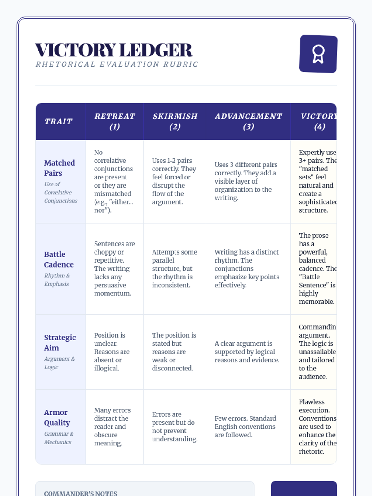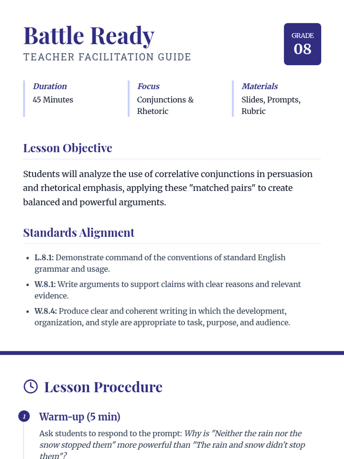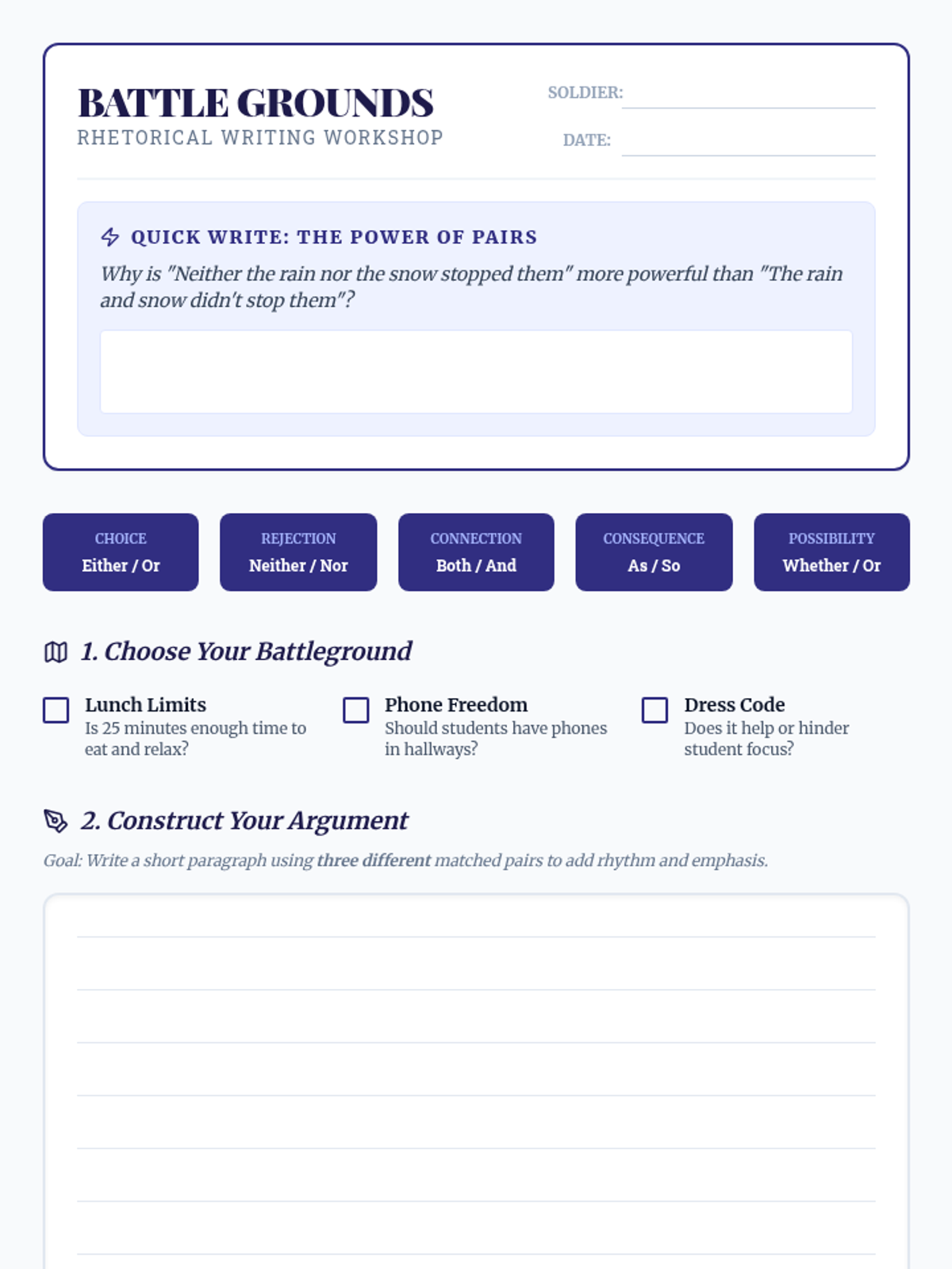 Students explore the persuasive power of correlative conjunctions by analyzing their use in famous quotes and rhetorical structures. They apply these 'matched pairs' to craft compelling arguments about school-based issues in a writing workshop format.