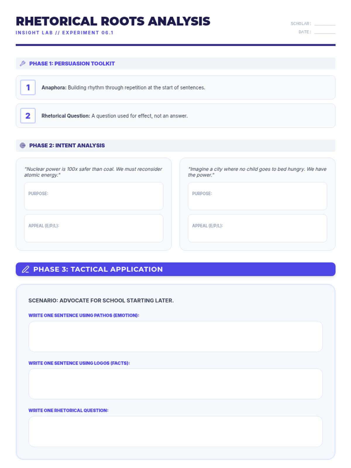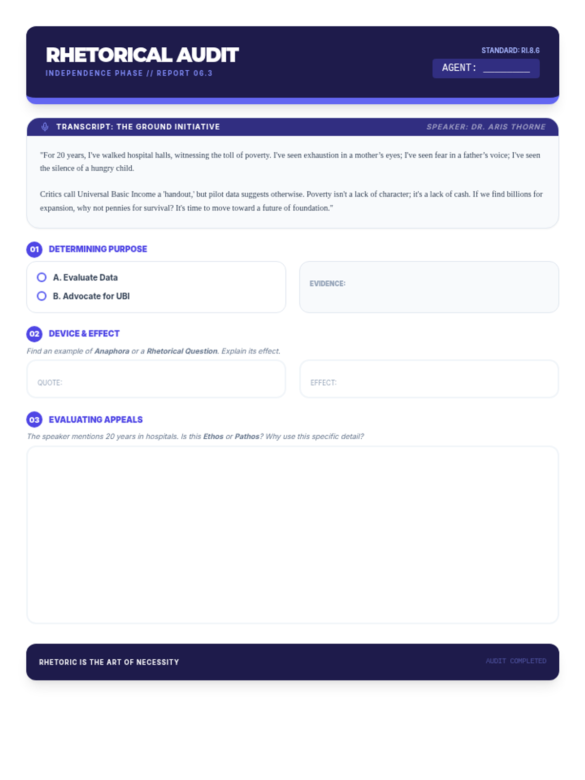 Determines the author's purpose in informational texts and evaluates the use of rhetorical devices to further that purpose.
