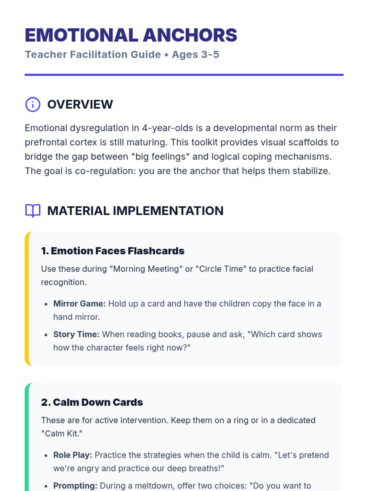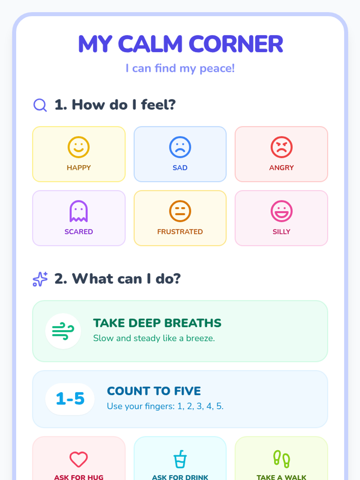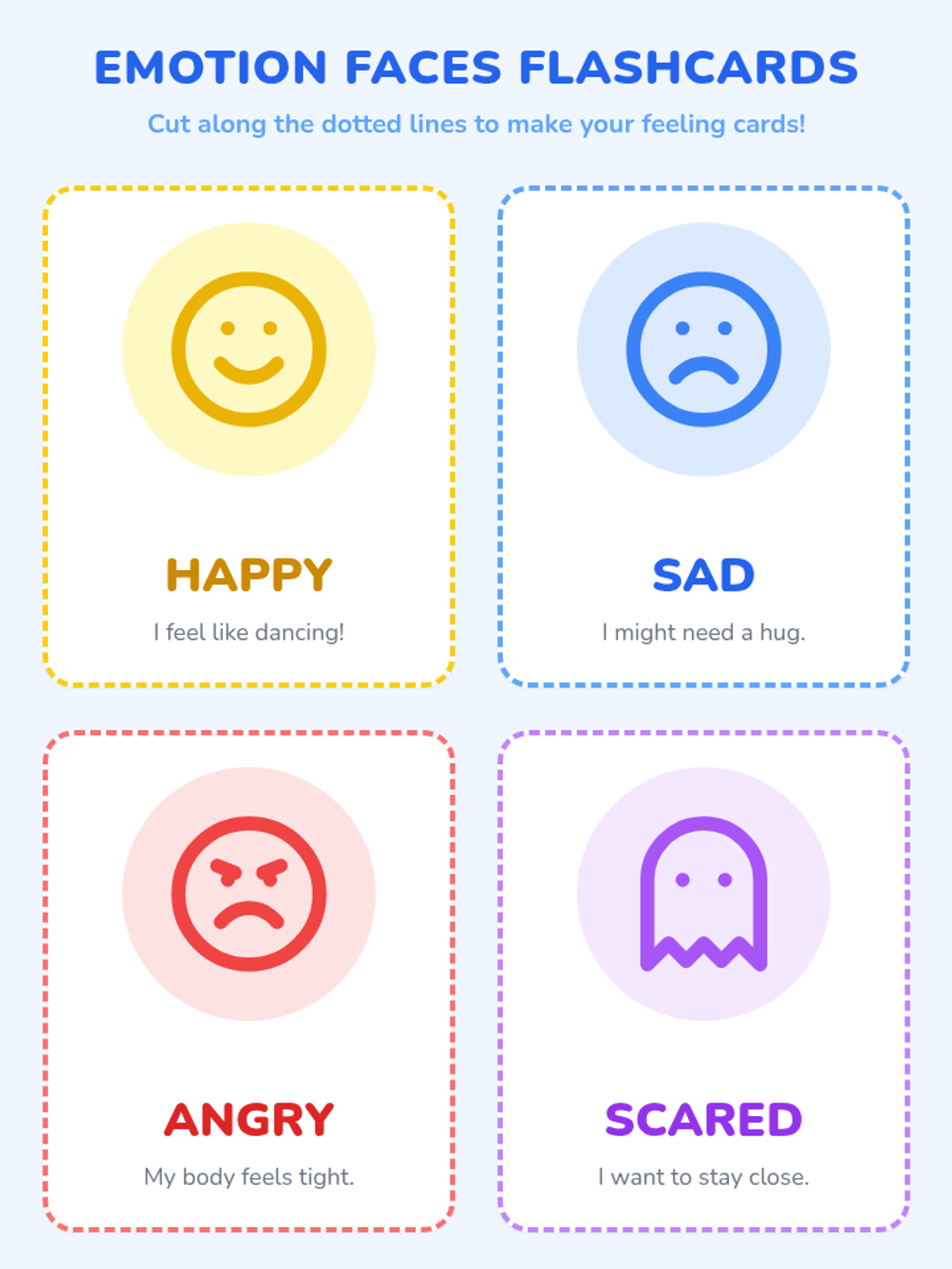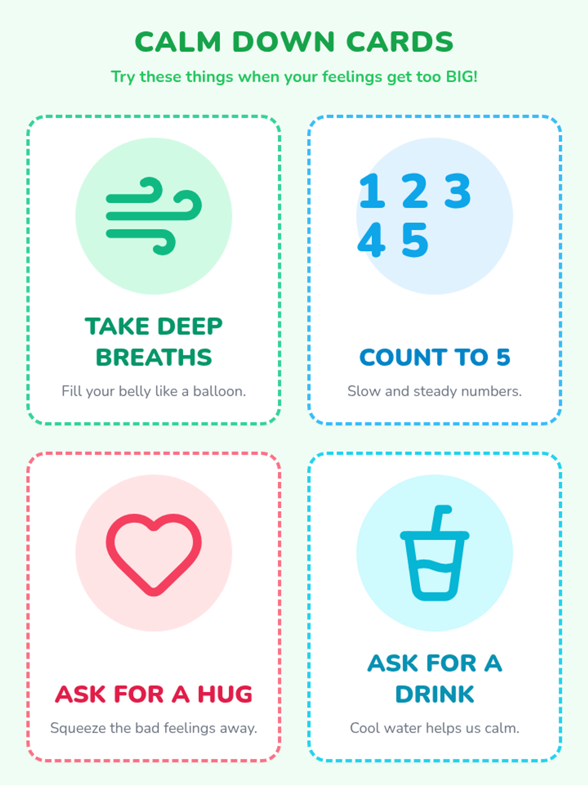 This lesson focuses on identifying basic emotions (happy, sad, angry, scared) and introduces five specific physical strategies for emotional regulation. It includes visual aids for both identification and action.