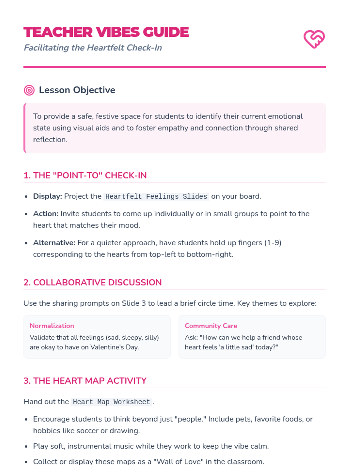 A quick Social-Emotional Learning (SEL) lesson centered around a Valentine's Day themed mood check-in. Students use visual cues to identify their feelings and engage in a reflective 'Heart Map' activity.