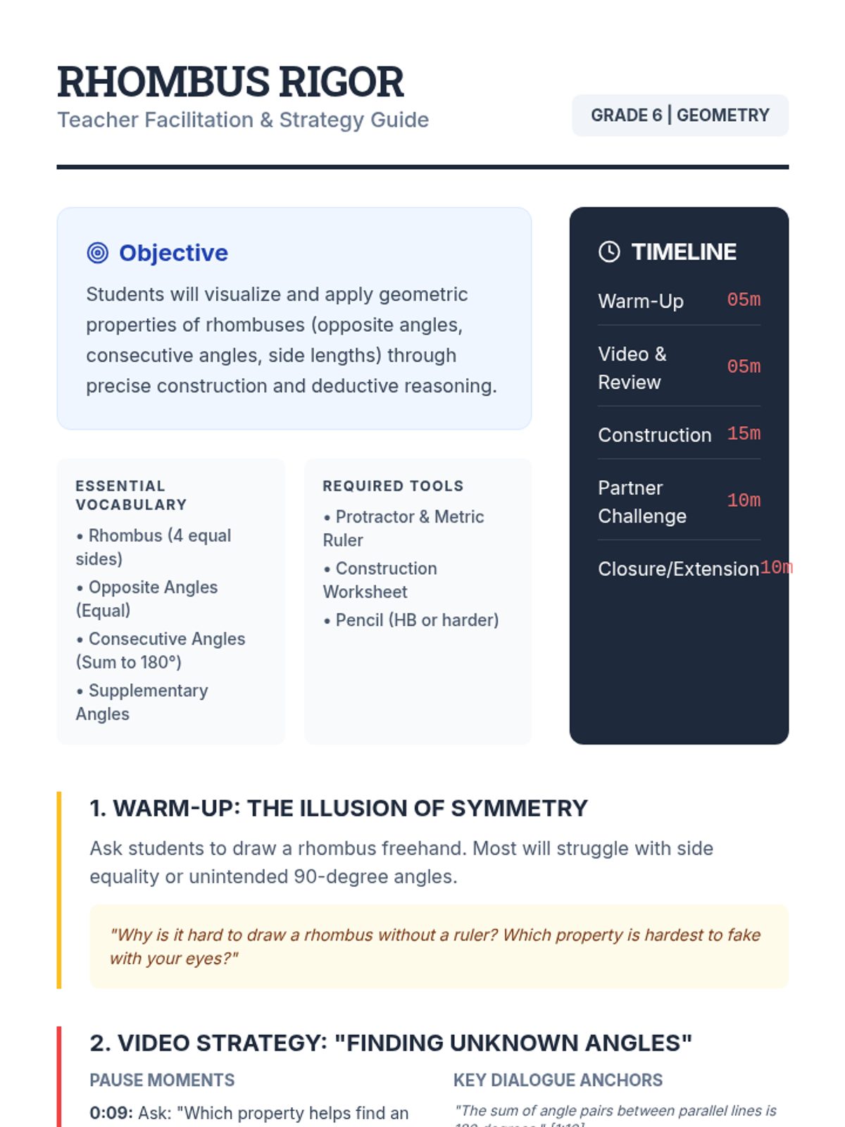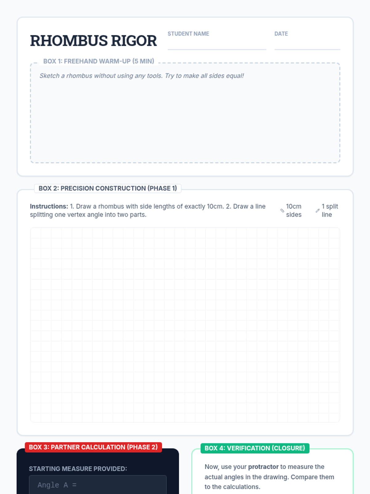 Students will master the geometric properties of a rhombus by constructing precise figures with tools and calculating unknown angles through deductive reasoning, comparing theoretical results with physical measurements.