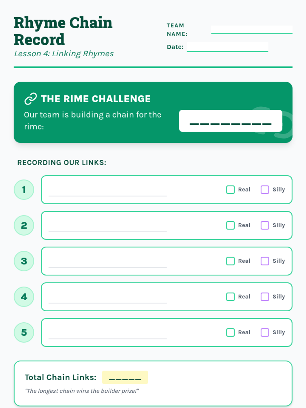 Students create long chains of rhyming words, including both real and nonsense words, to verify their understanding of the spelling pattern. This distinguishes between sight recognition and true decoding of the rime.