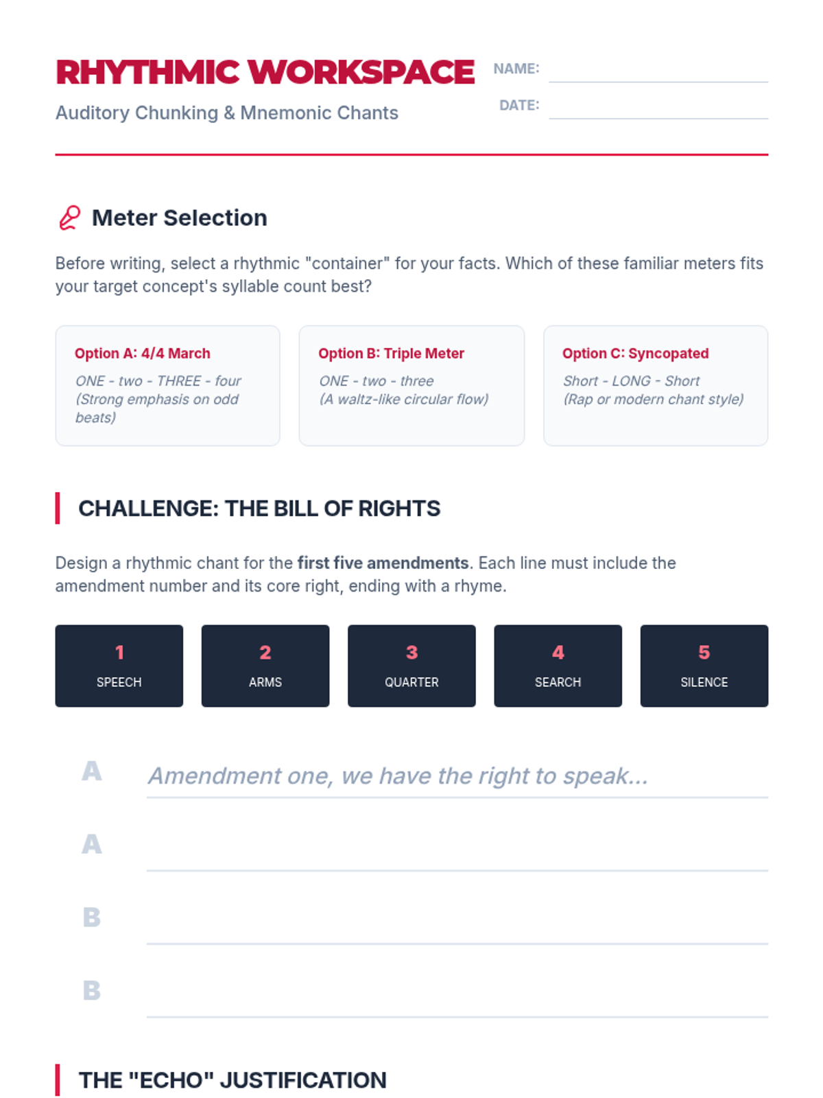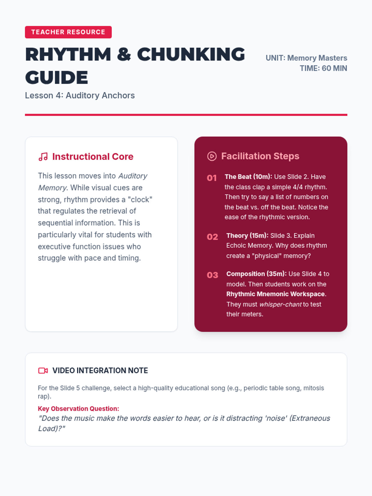 This lesson explores auditory memory through rhythm and rhyme, teaching students how to create rhythmic chants and musical patterns to support chunking of information.