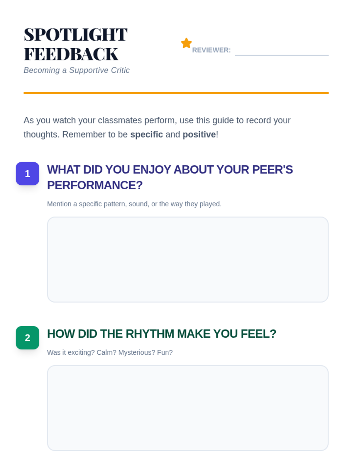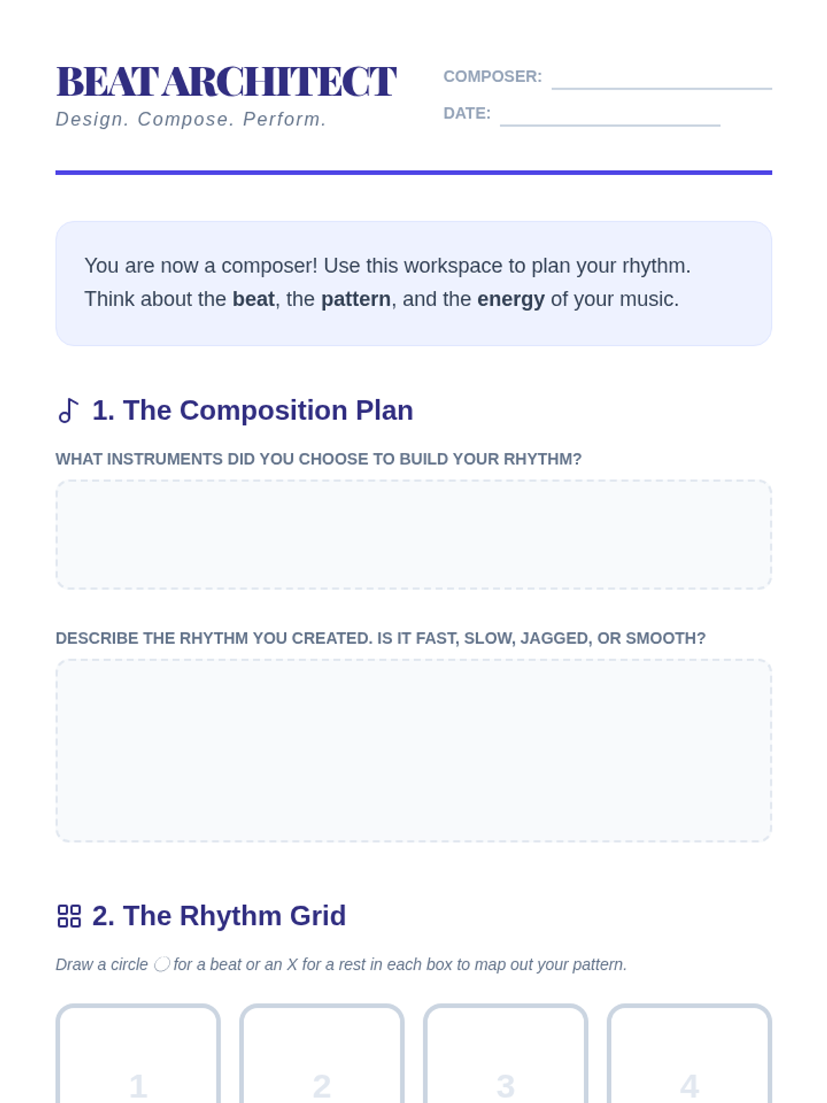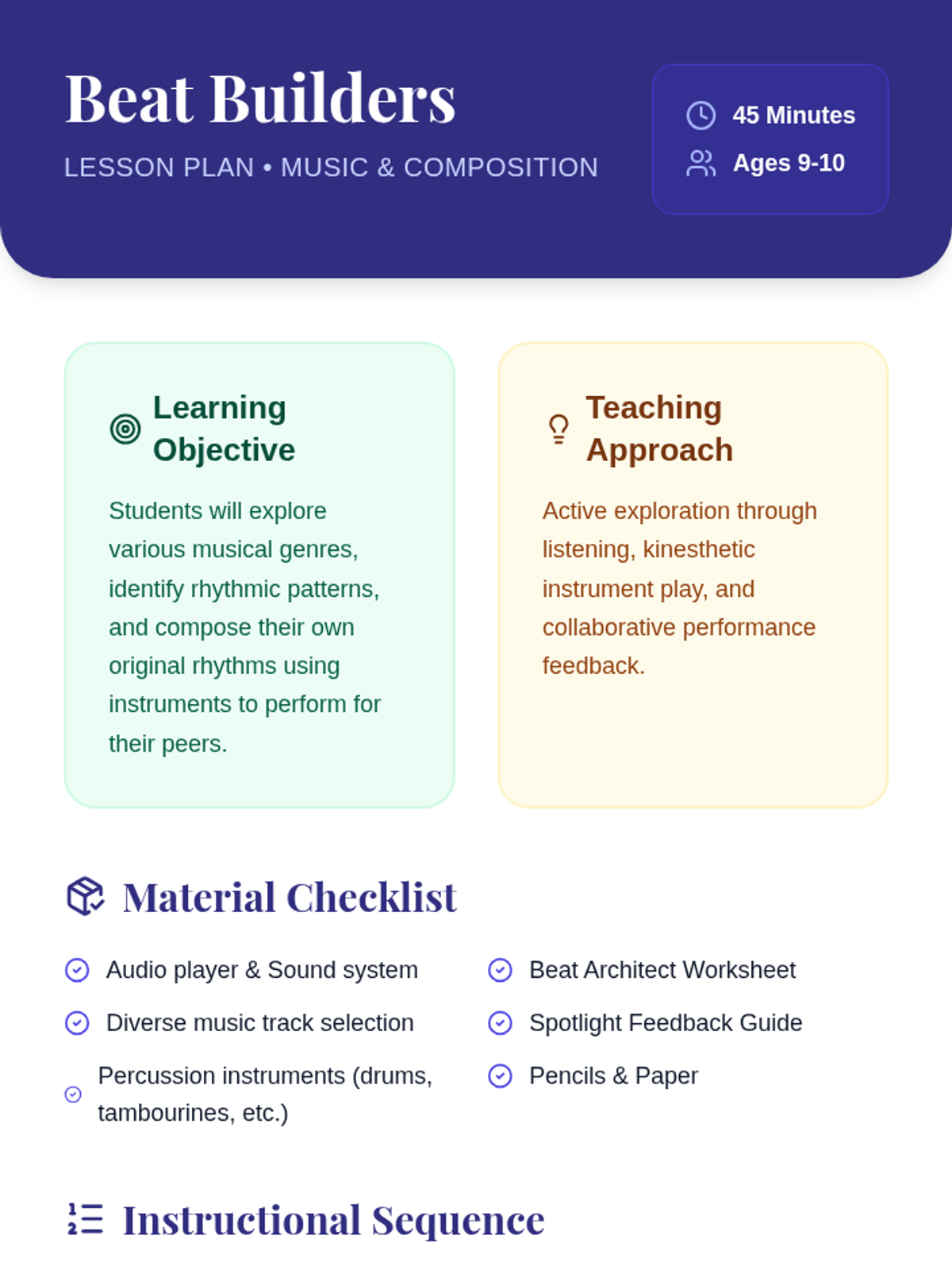 A dynamic music lesson where students explore genres, identify rhythms, and create their own original musical patterns using various instruments. Students will develop listening skills and creative confidence through performance and peer feedback.