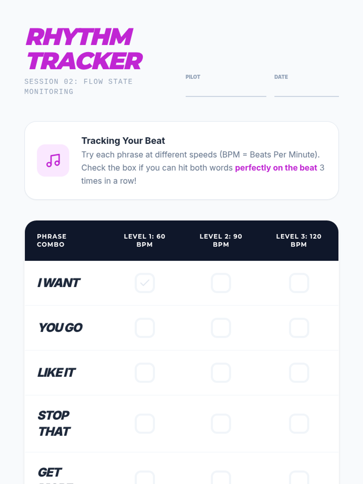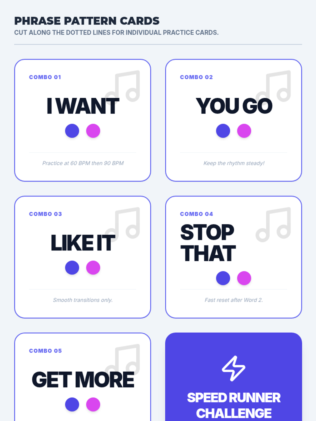 Learners practice common two-word combinations (e.g., 'want it', 'go there') to build multi-step motor sequences. Focus is placed on rhythm and flow rather than just accuracy.
