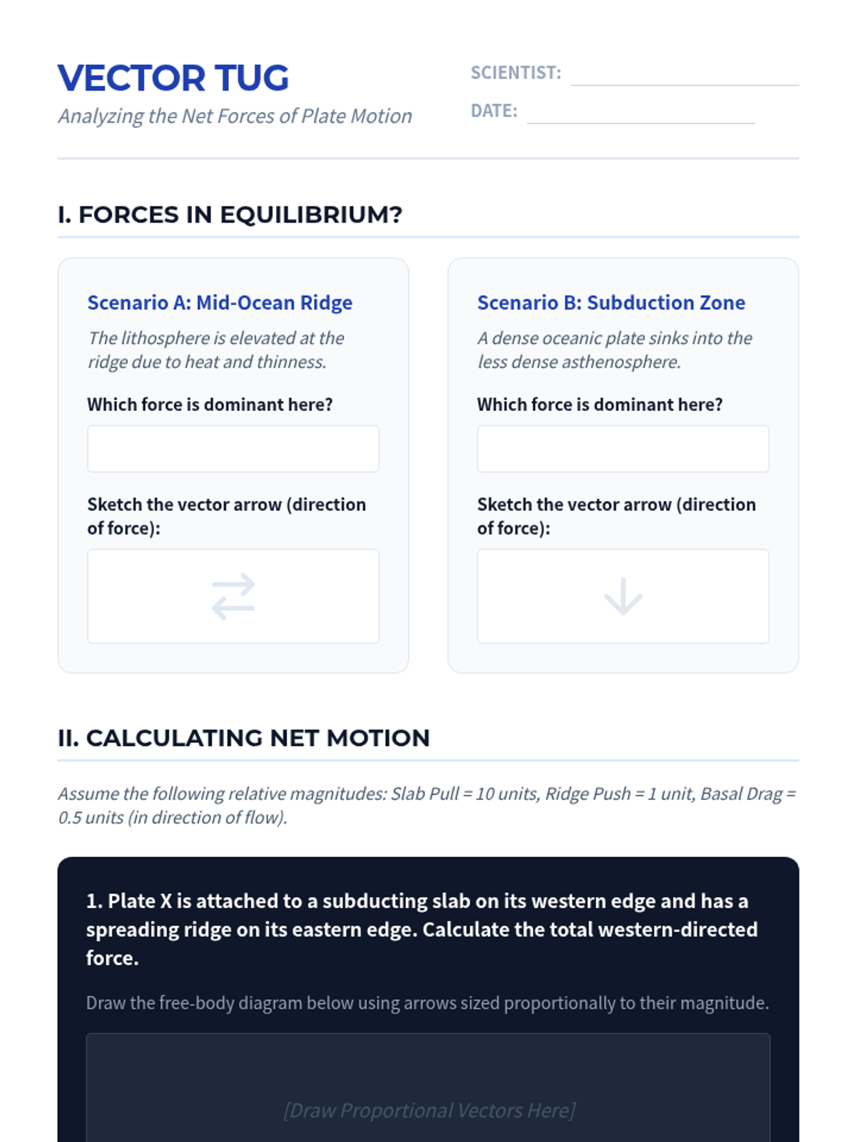 Students analyze the physics of ridge push and slab pull using vector diagrams to determine the primary drivers of plate motion.