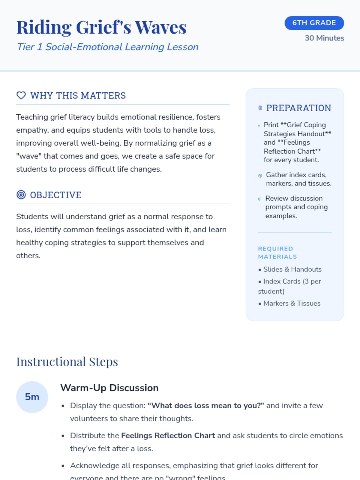 A 30-minute Tier 1 SEL lesson for 6th graders focused on understanding grief as a normal response to loss, identifying emotions, and practicing healthy coping strategies within a supportive classroom community.