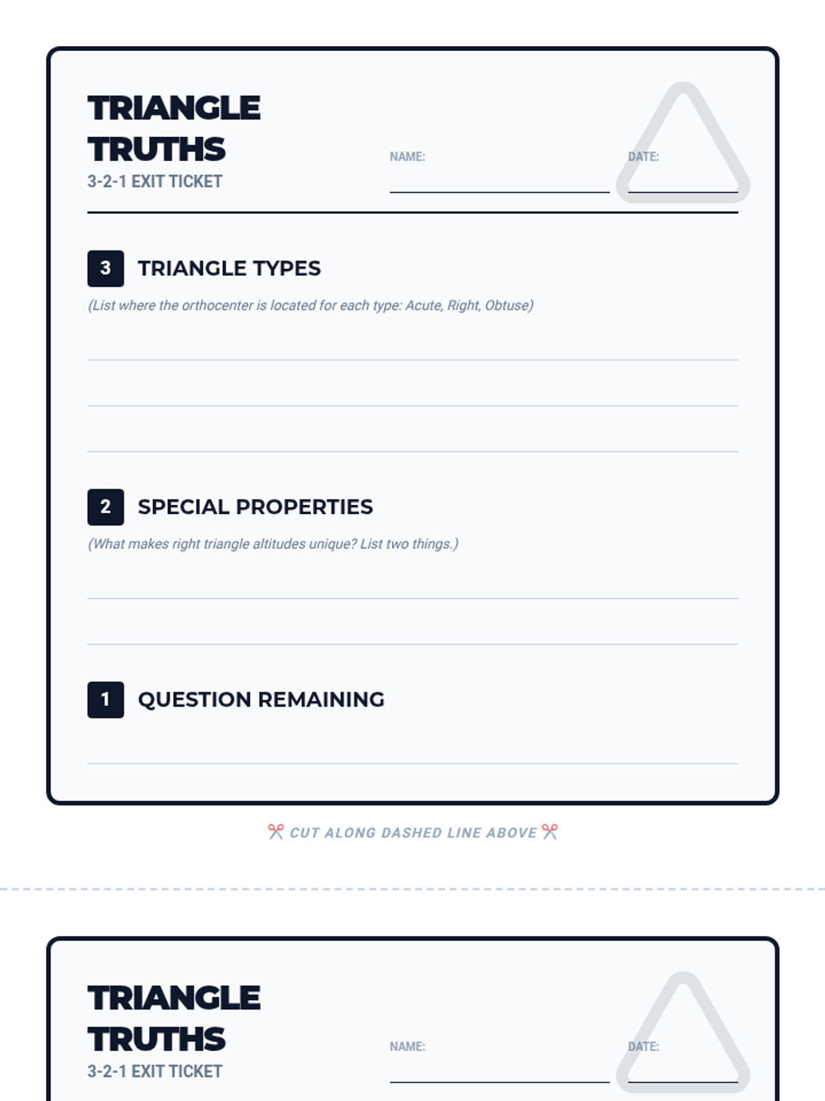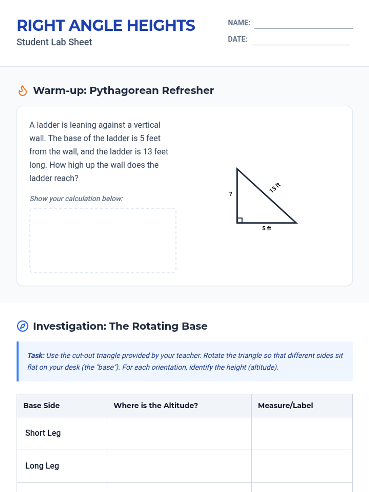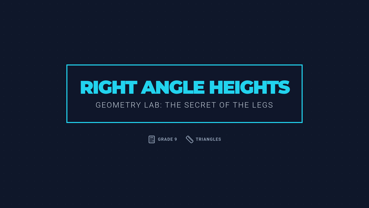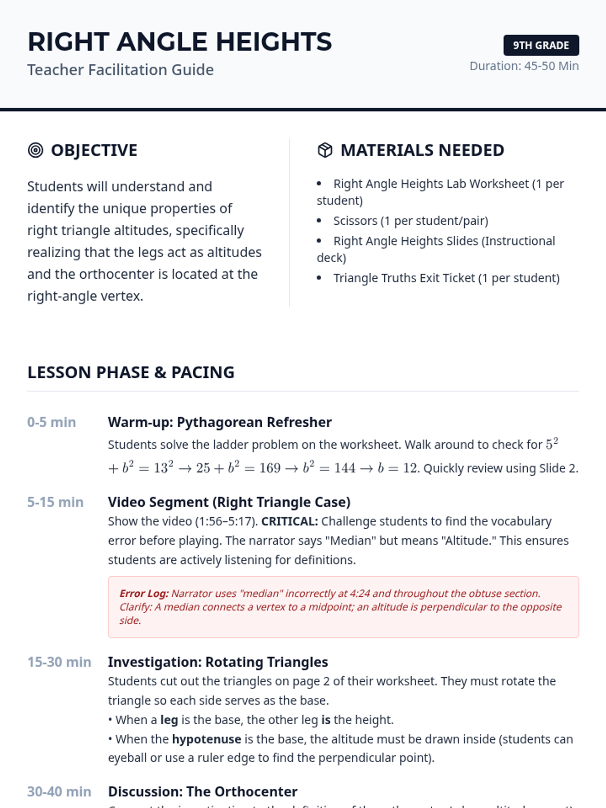 A 9th-grade geometry lesson exploring the unique properties of right triangles, focusing on why their legs function as altitudes and where their orthocenter is located. Includes a video critique, a hands-on rotating triangle investigation, and a 3-2-1 exit ticket.
