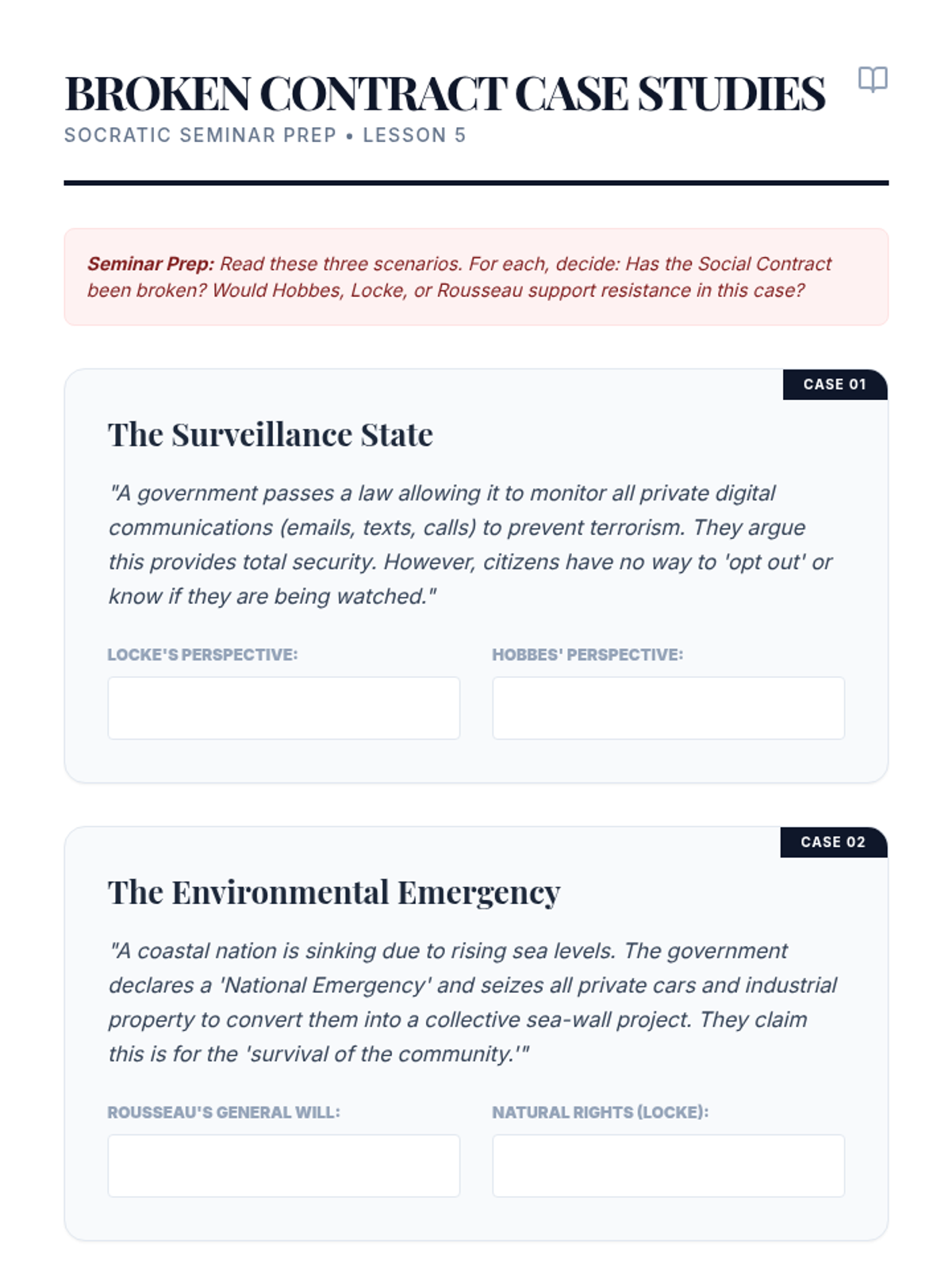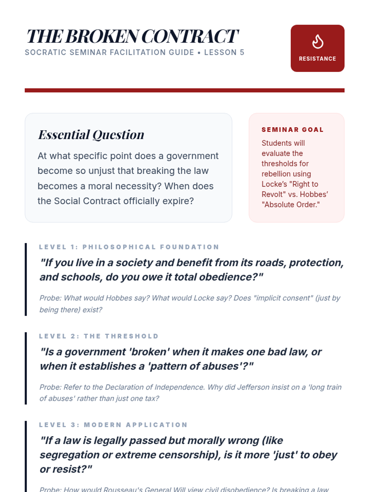 A Socratic seminar evaluating the conditions under which a government loses its legitimacy and citizens gain the right to resist or revolts.