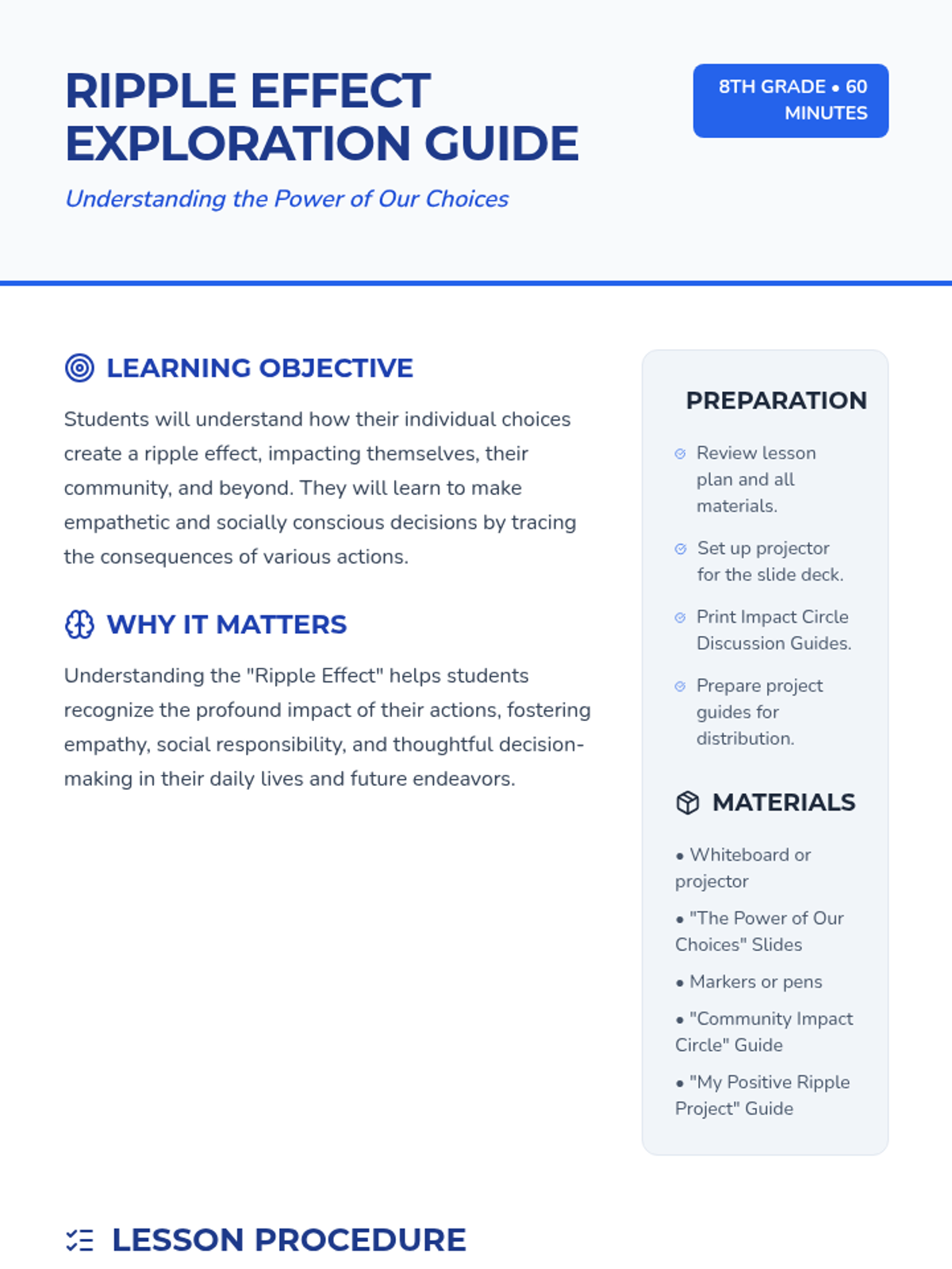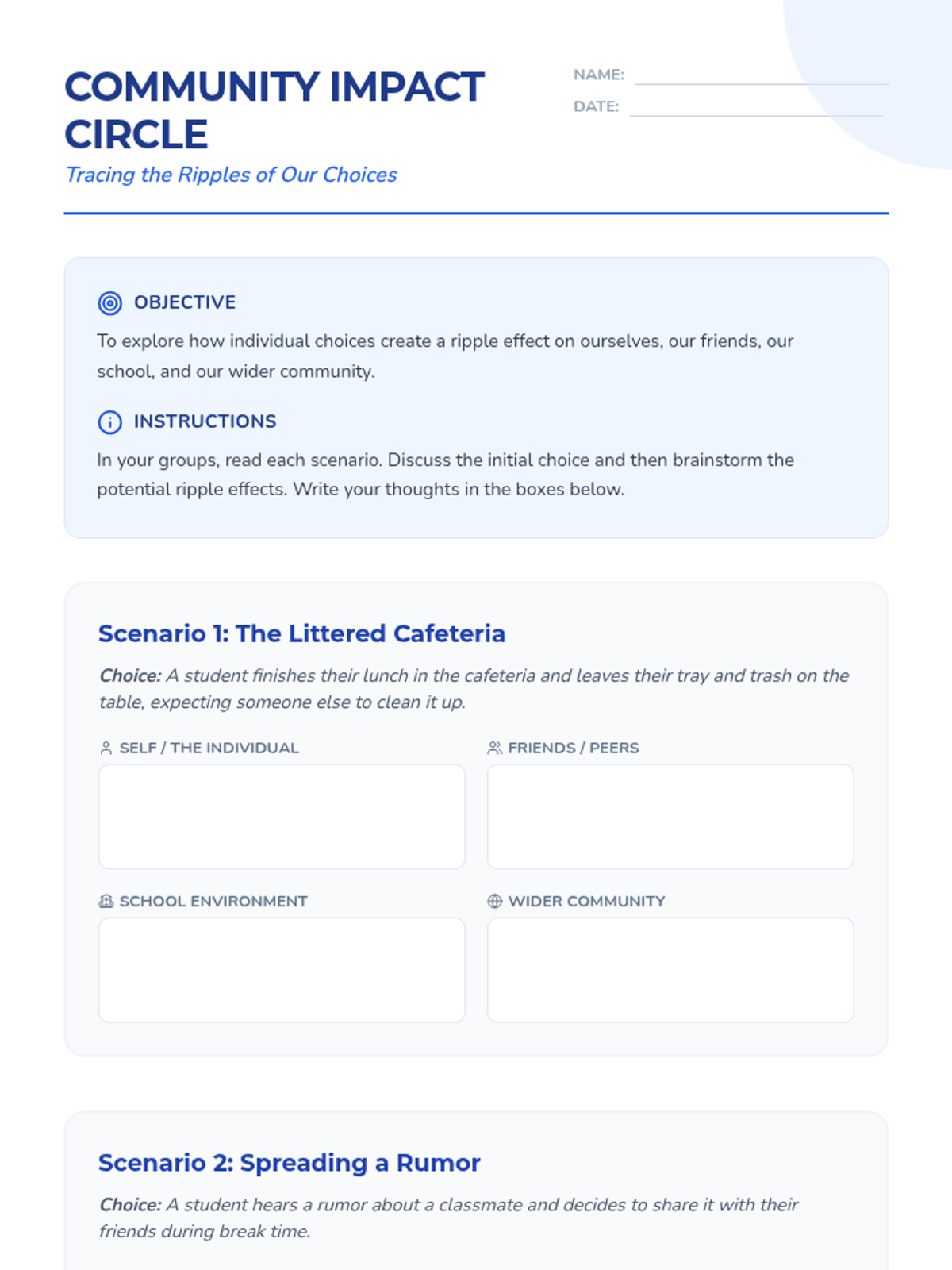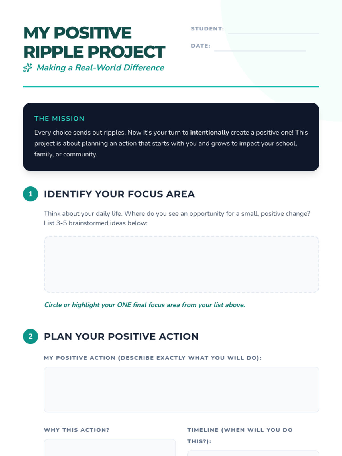Students explore the interconnectedness of their choices through the 'Ripple Effect' concept, tracing how small actions impact themselves, their peers, and the broader community.
