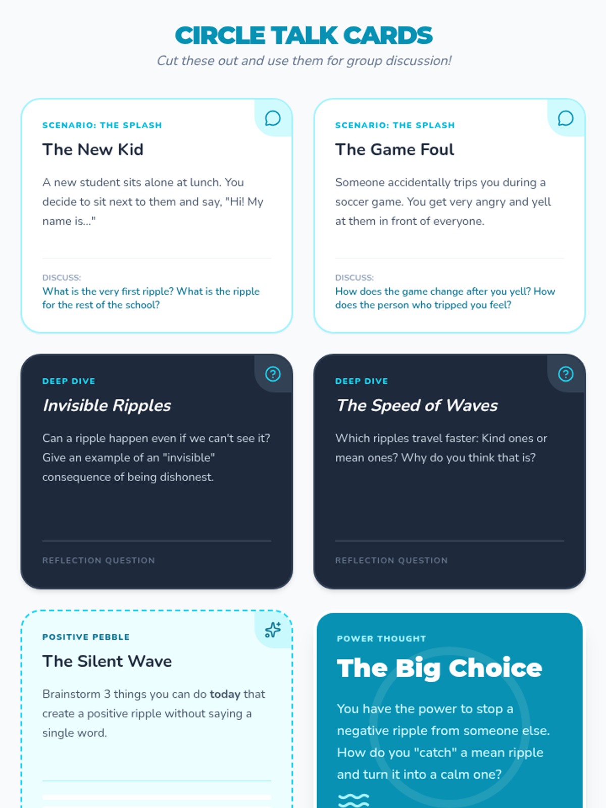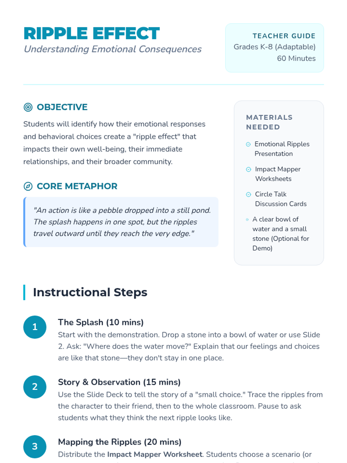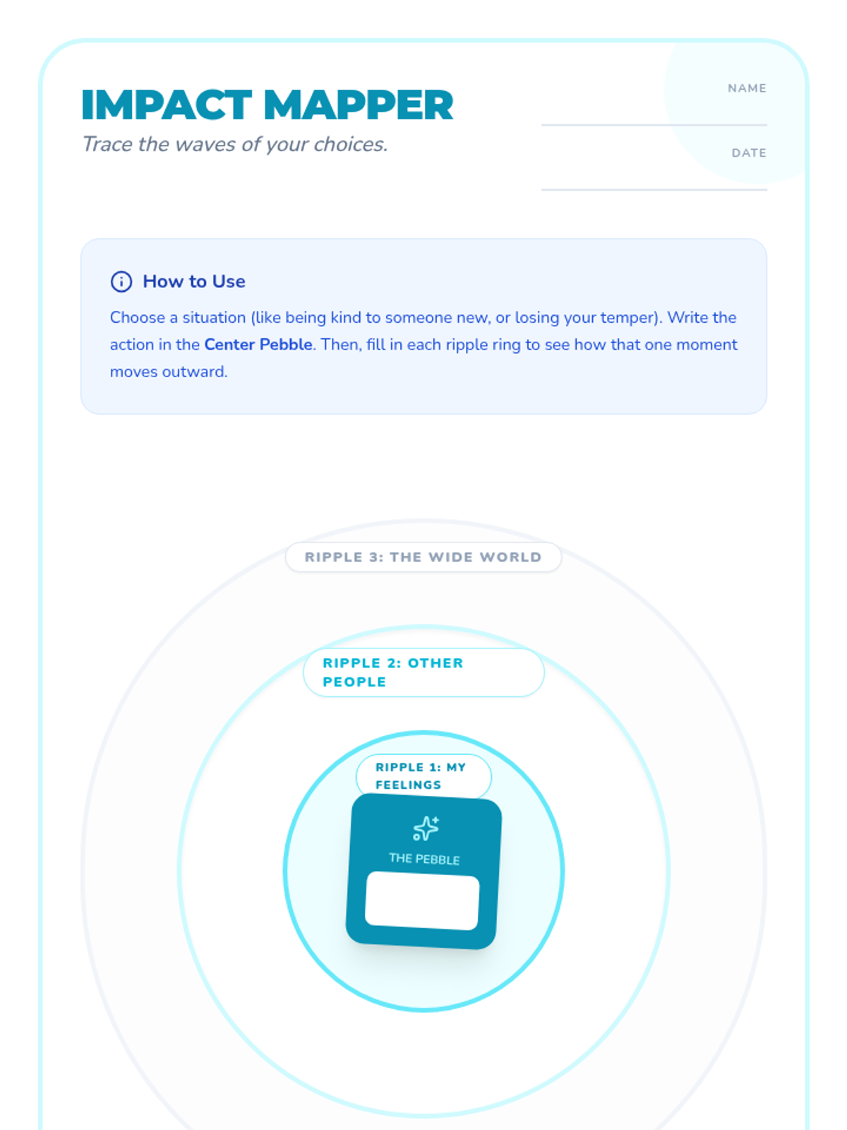 Students explore how emotions and actions create consequences that spread like ripples in a pond, impacting themselves and others through visual metaphors and storytelling.