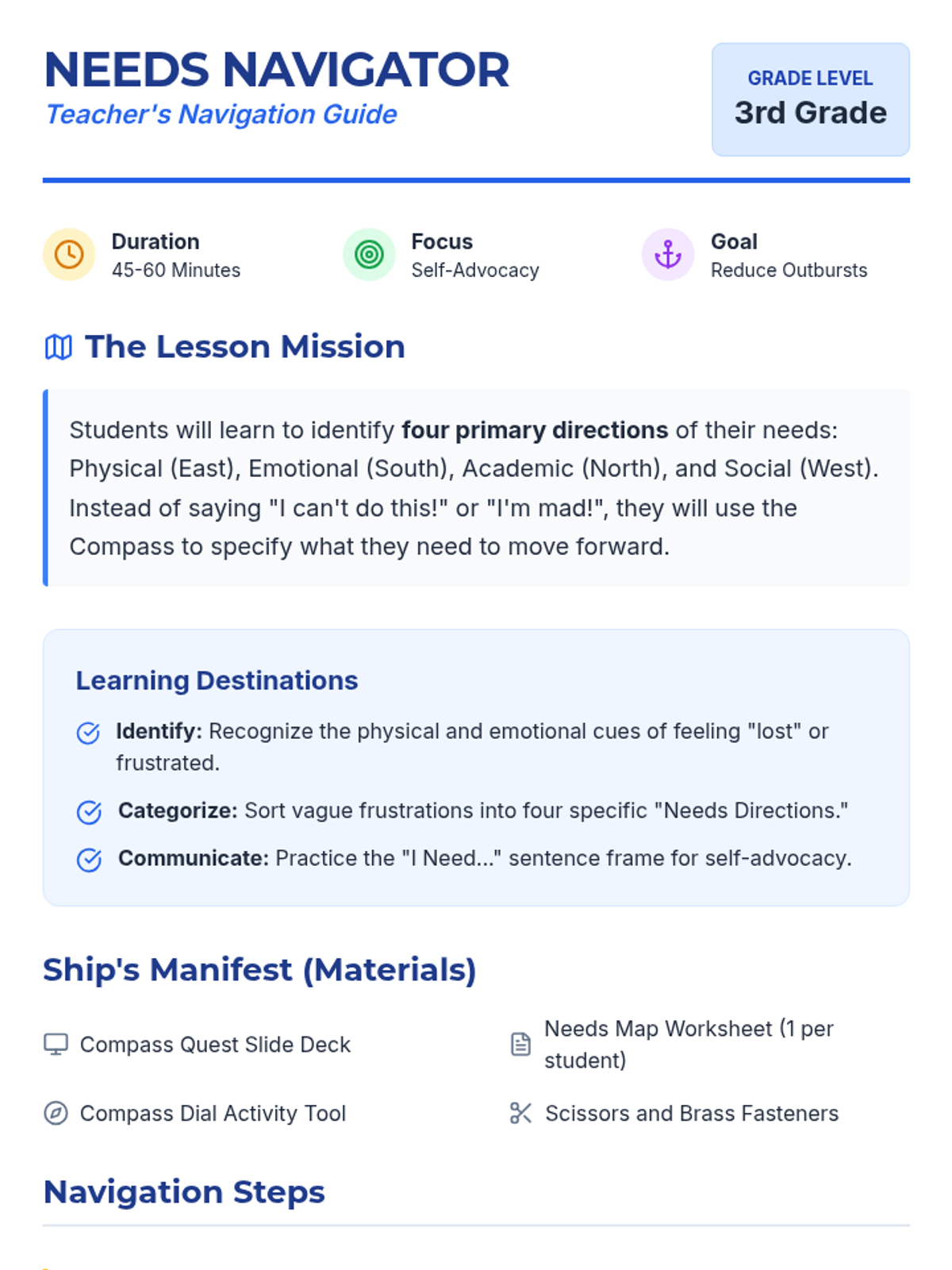 A lesson for third graders to identify specific emotional and academic needs and communicate them effectively. Students use a 'needs compass' metaphor to navigate frustration and advocate for themselves productively.
