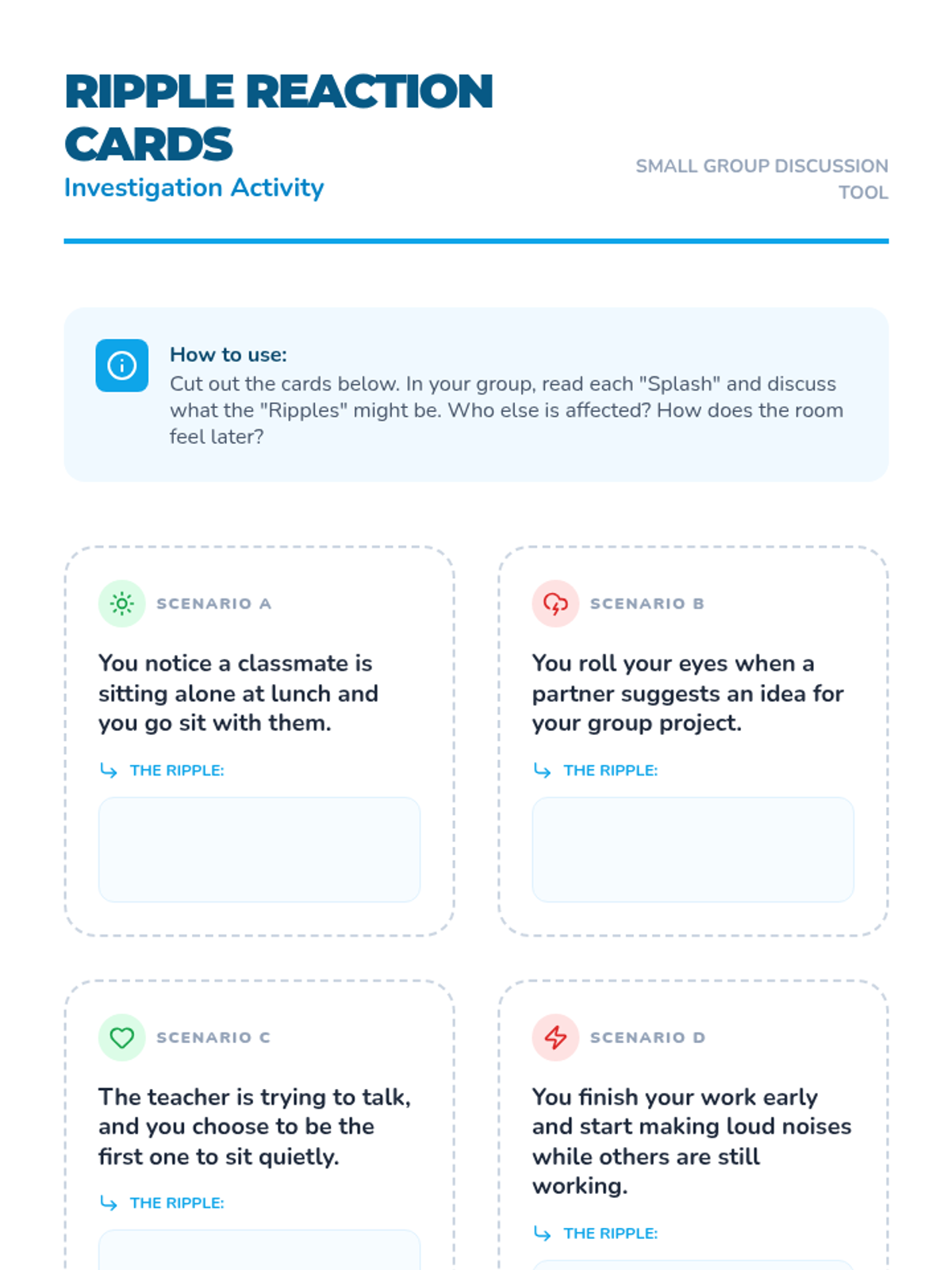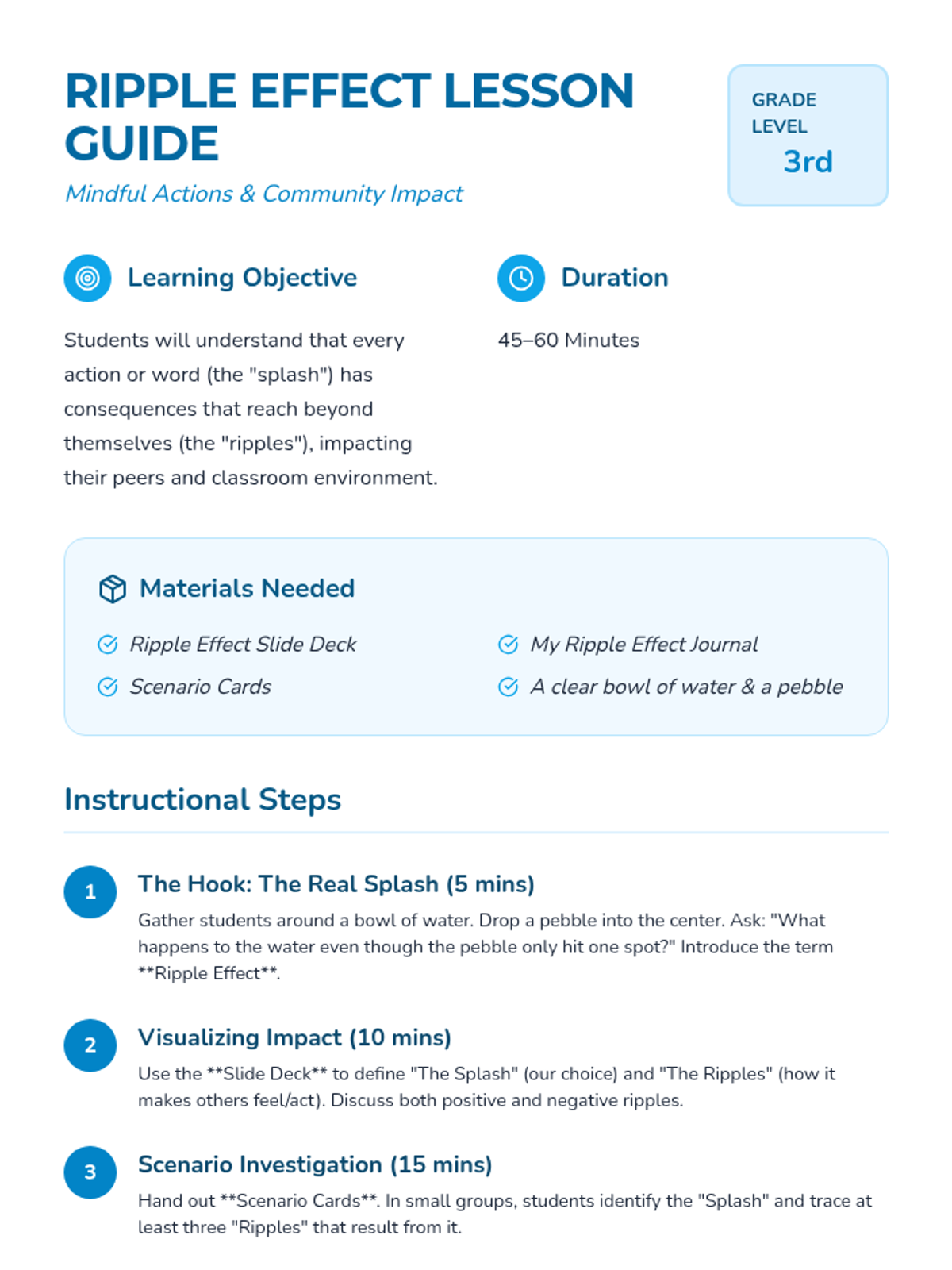 A lesson that introduces 3rd graders to the concept of the 'ripple effect,' teaching them how their words and actions influence the people and environment around them. Through visual metaphors and reflective journaling, students learn to make mindful choices that contribute to a positive classroom community.