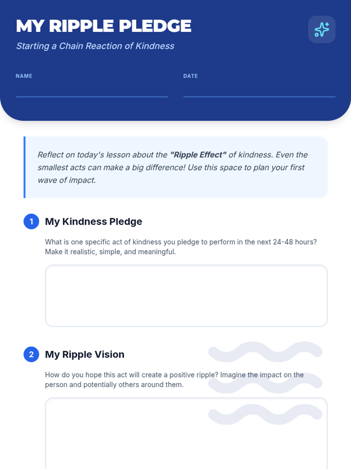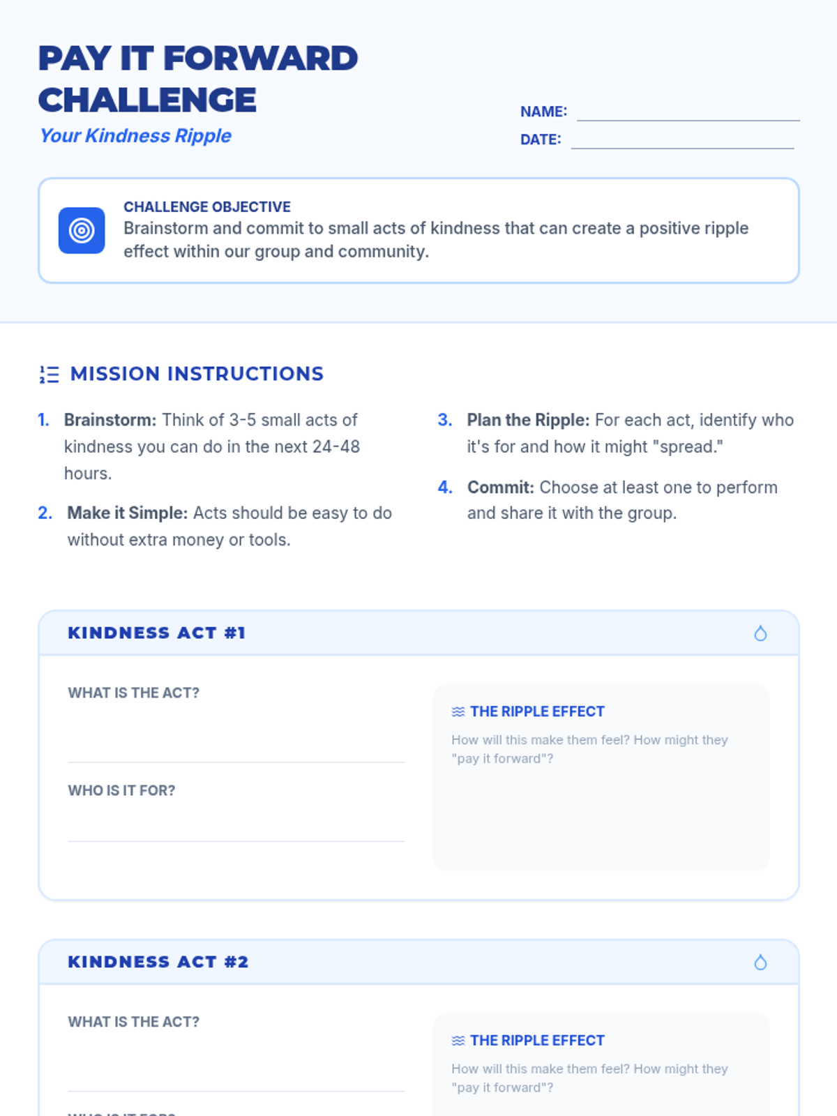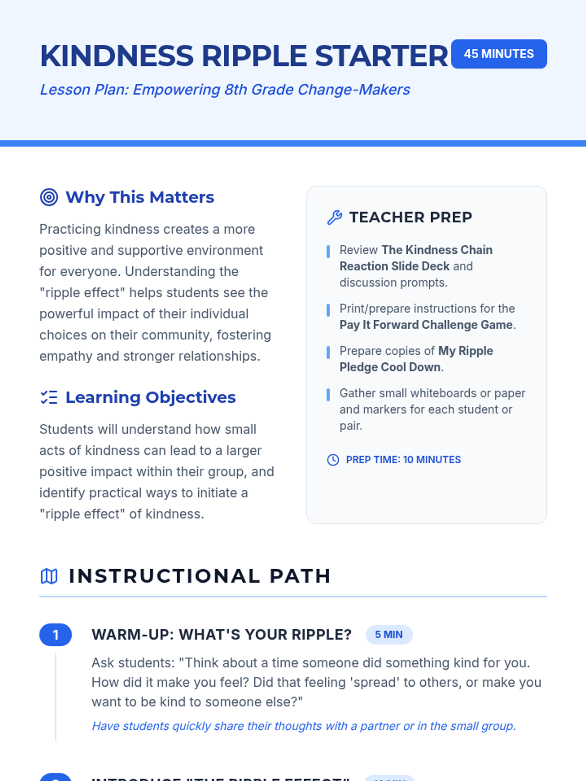A 45-minute small group lesson for 8th graders exploring how individual acts of kindness create a positive ripple effect within their community. Students will engage in discussion, a brainstorming game, and personal goal-setting.