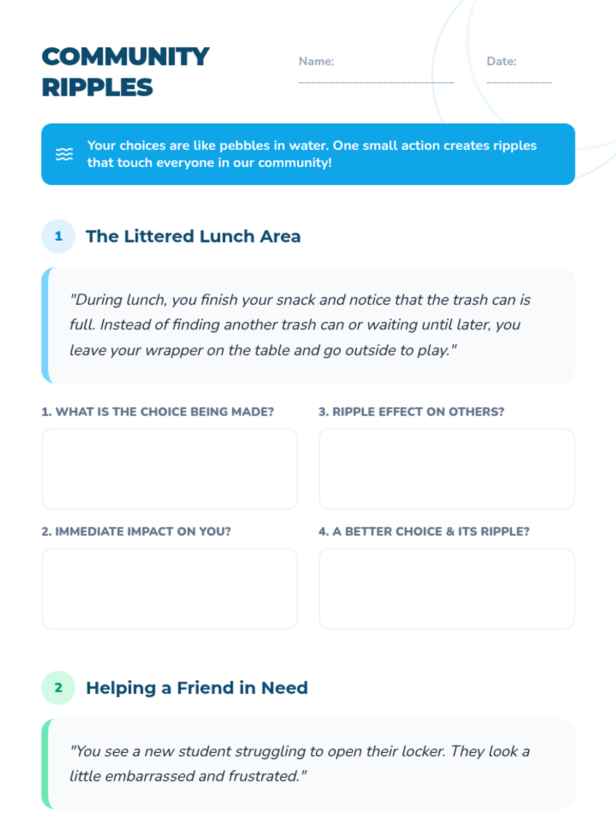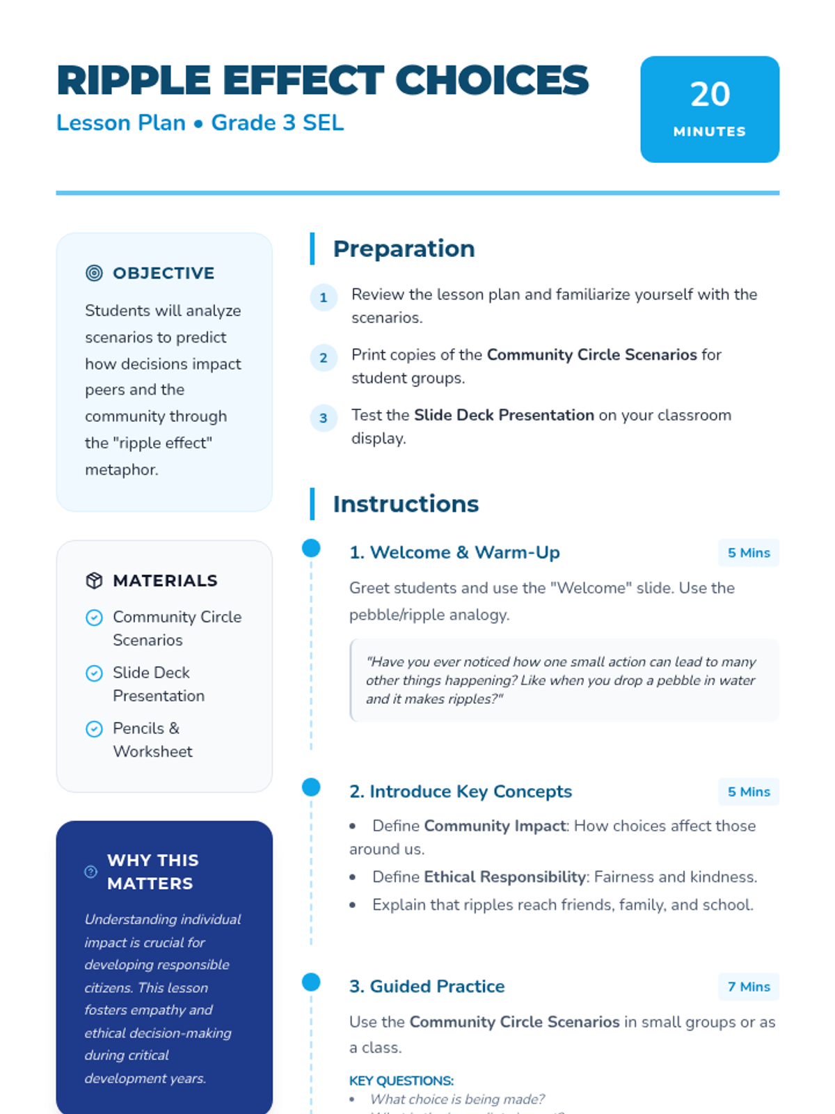 A 20-minute SEL lesson for 3rd graders focused on understanding how individual choices impact the community through the 'ripple effect' metaphor. Students analyze scenarios to predict consequences and develop ethical responsibility.