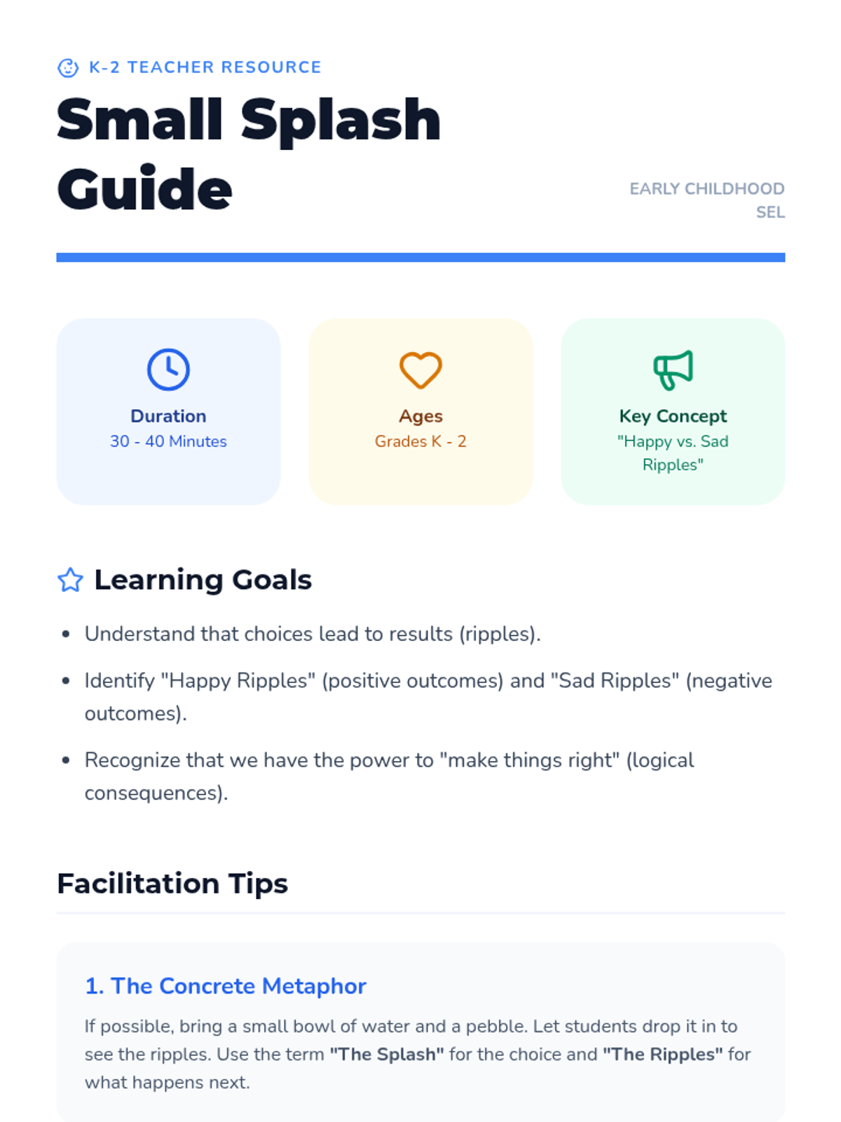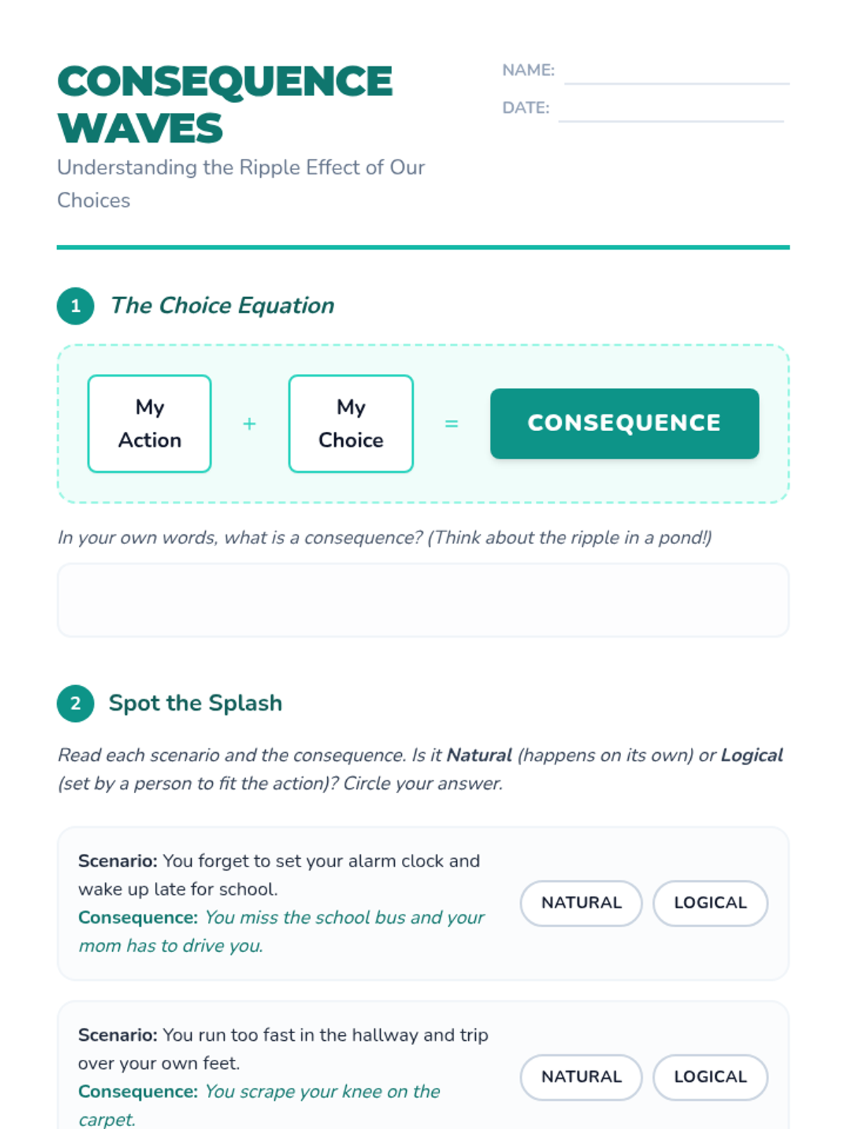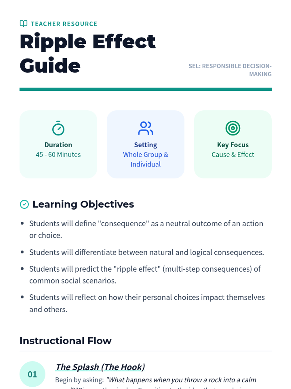 A lesson exploring the concept of consequences through the metaphor of a 'ripple effect', teaching students to identify natural and logical outcomes of their choices.