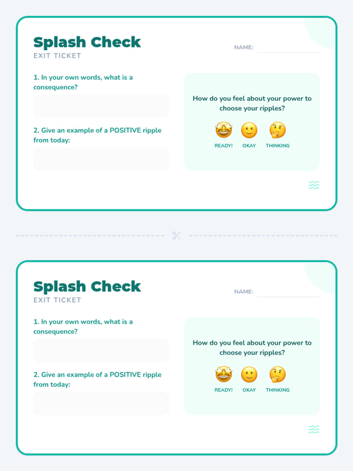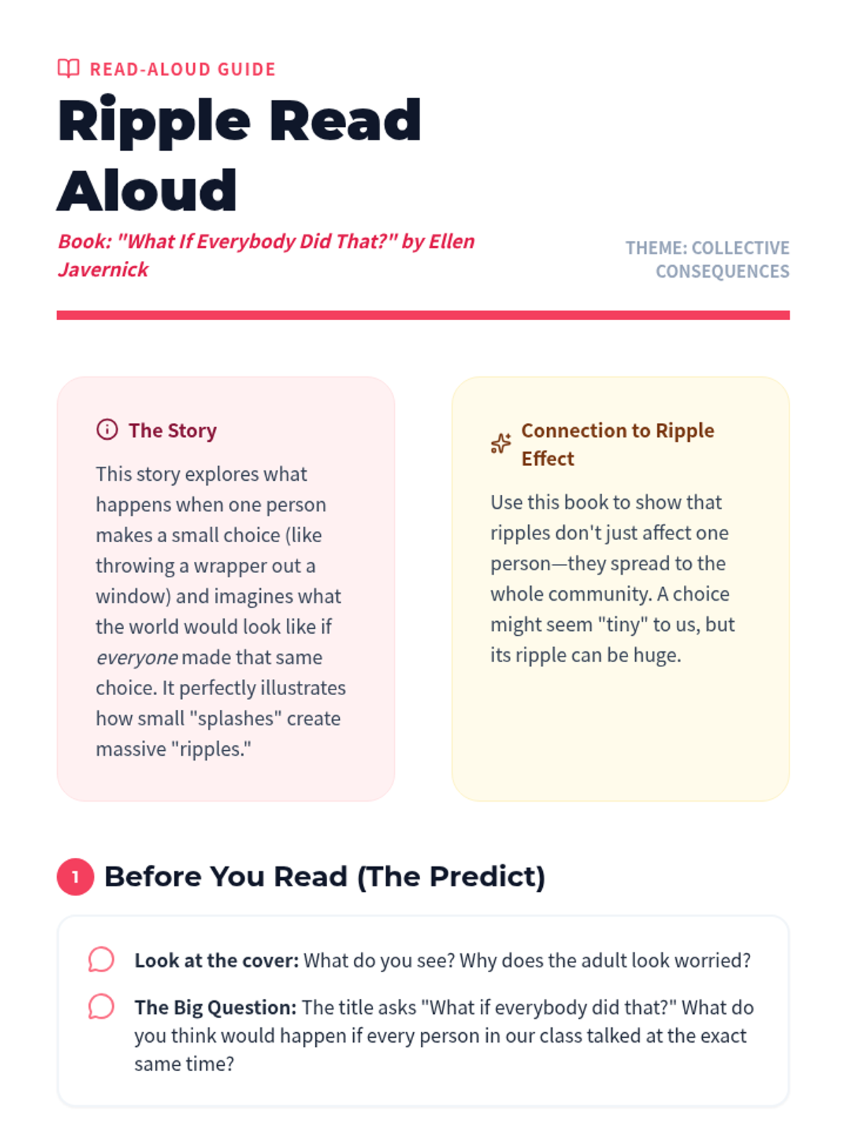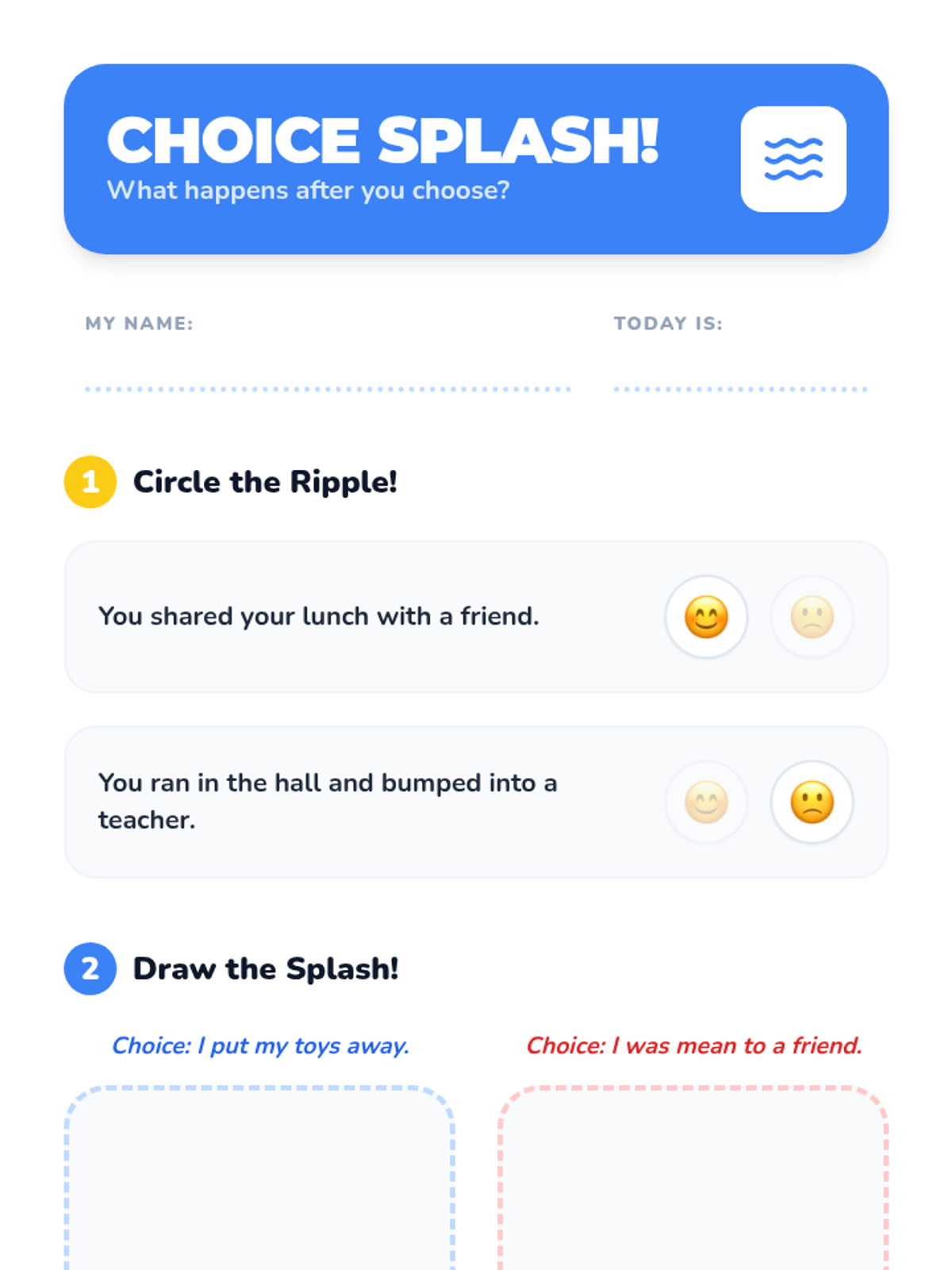 A lesson exploring the concept of consequences through the metaphor of a 'ripple effect', teaching students to identify natural and logical outcomes of their choices.