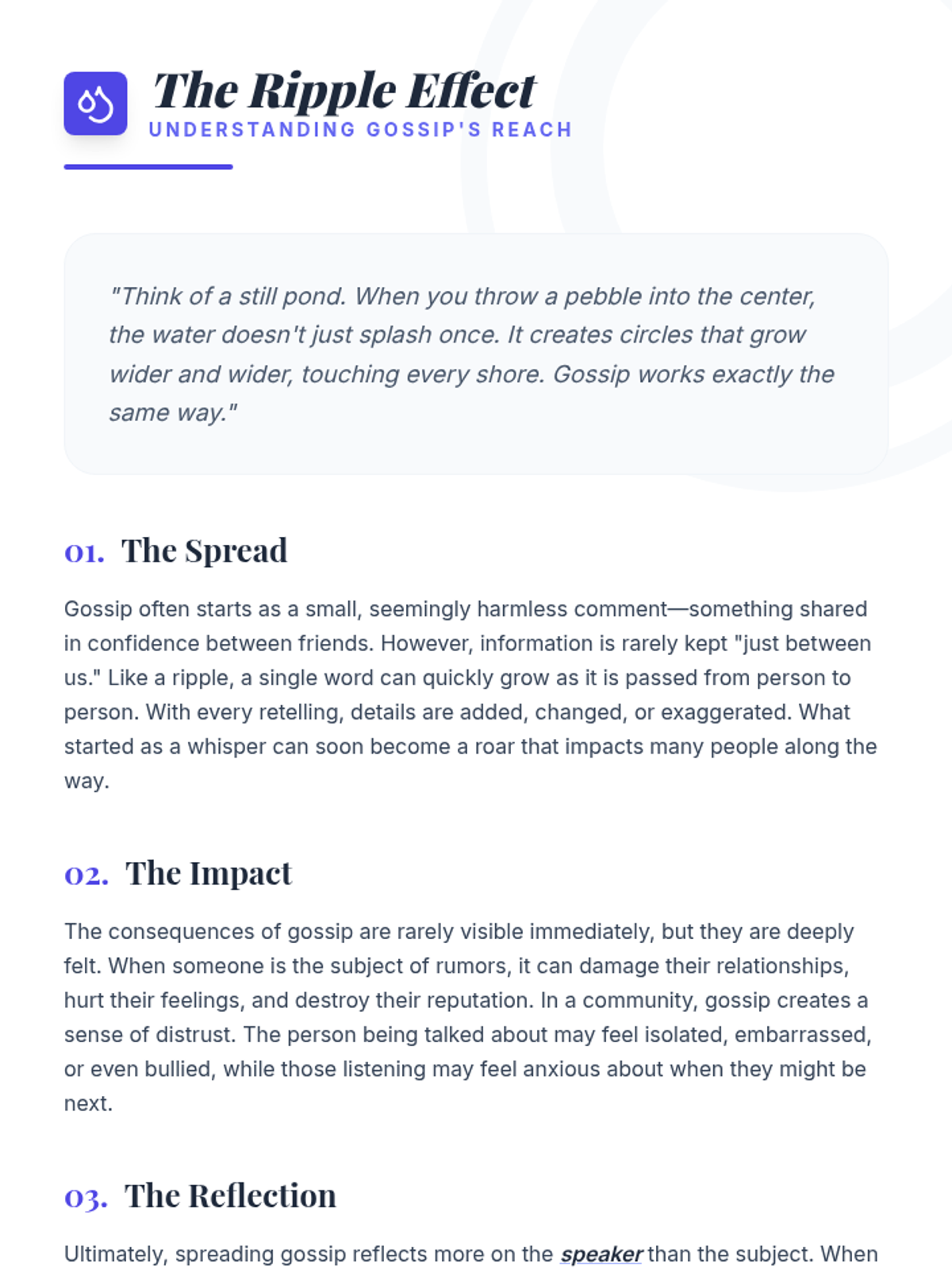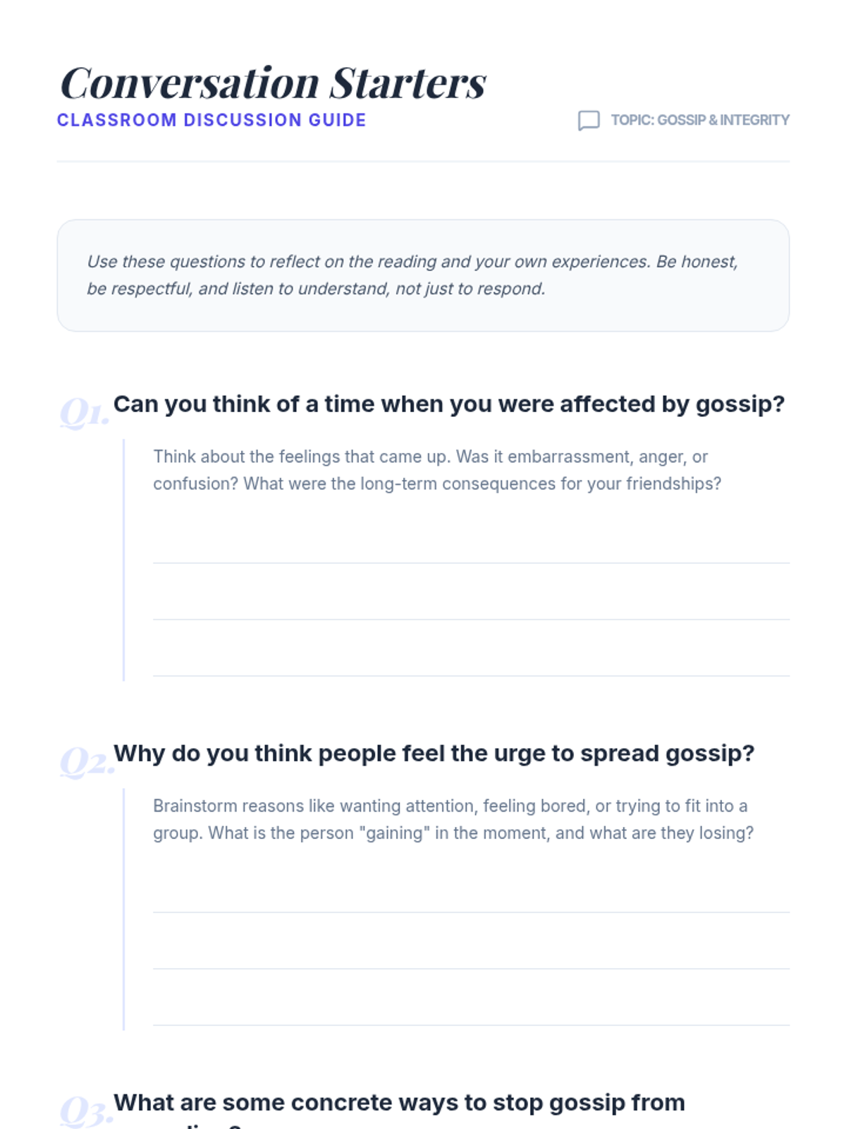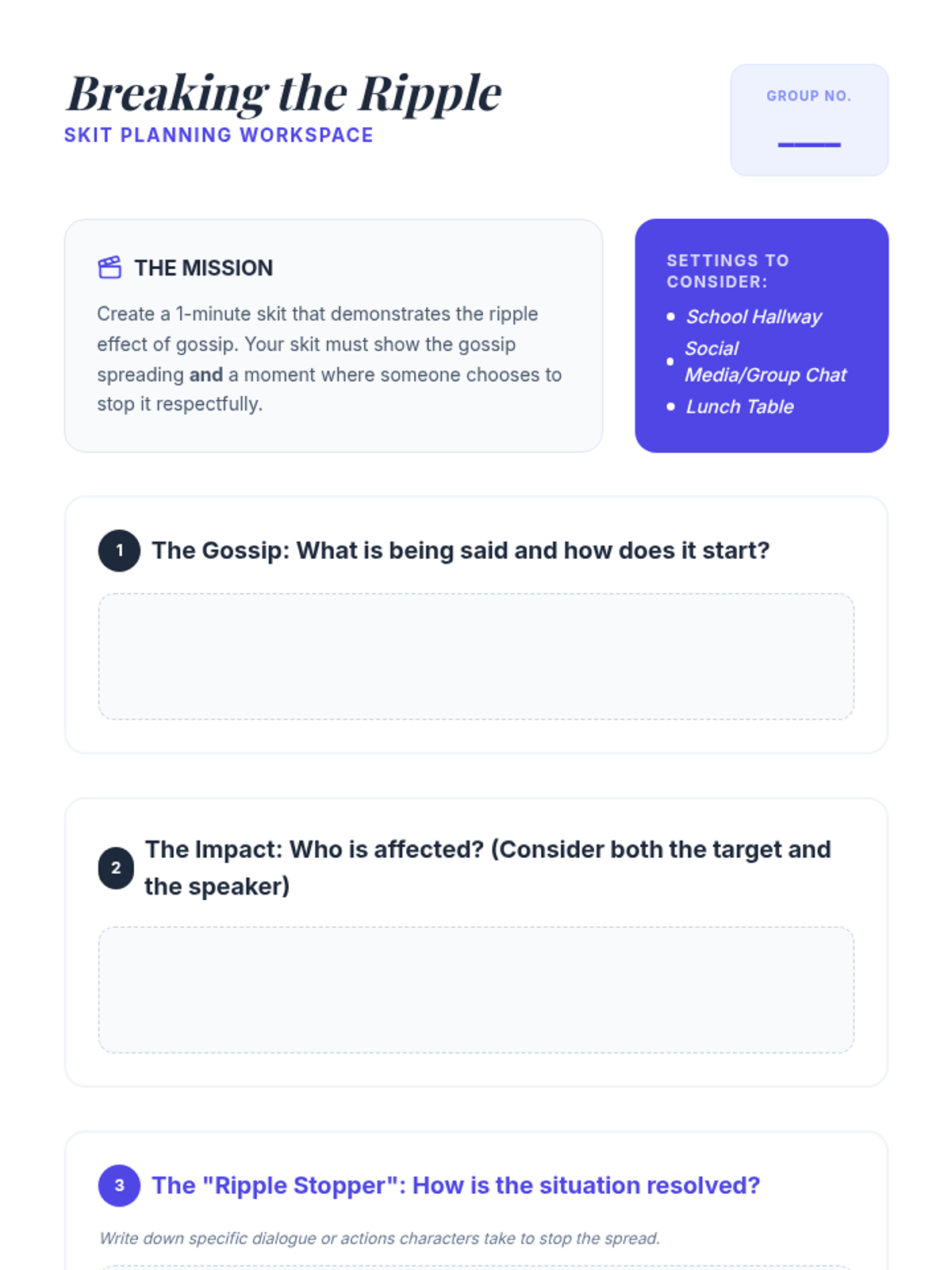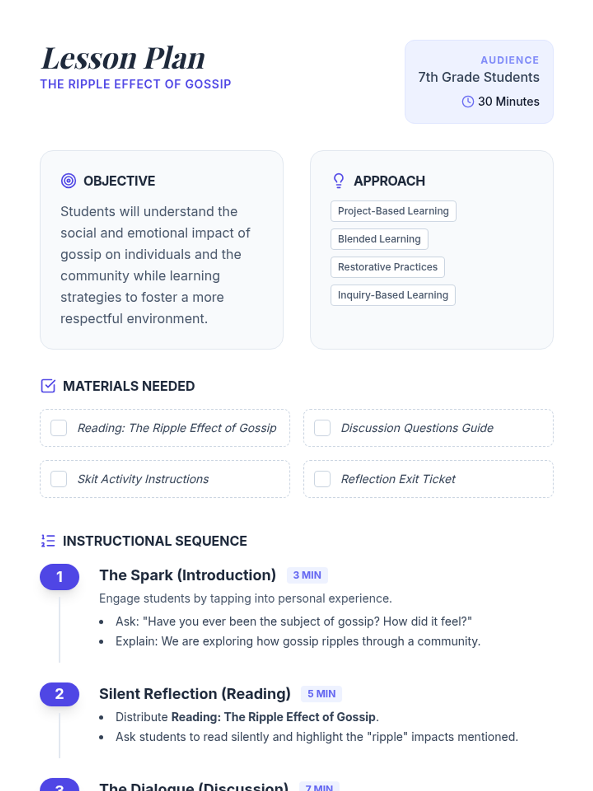 A 30-minute interactive lesson for 7th graders to explore the social and emotional consequences of gossip through reading, discussion, and role-play.