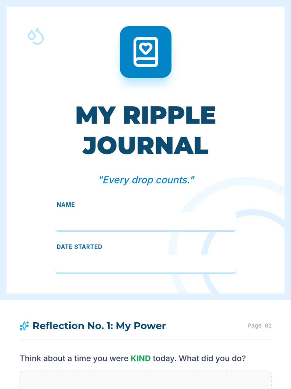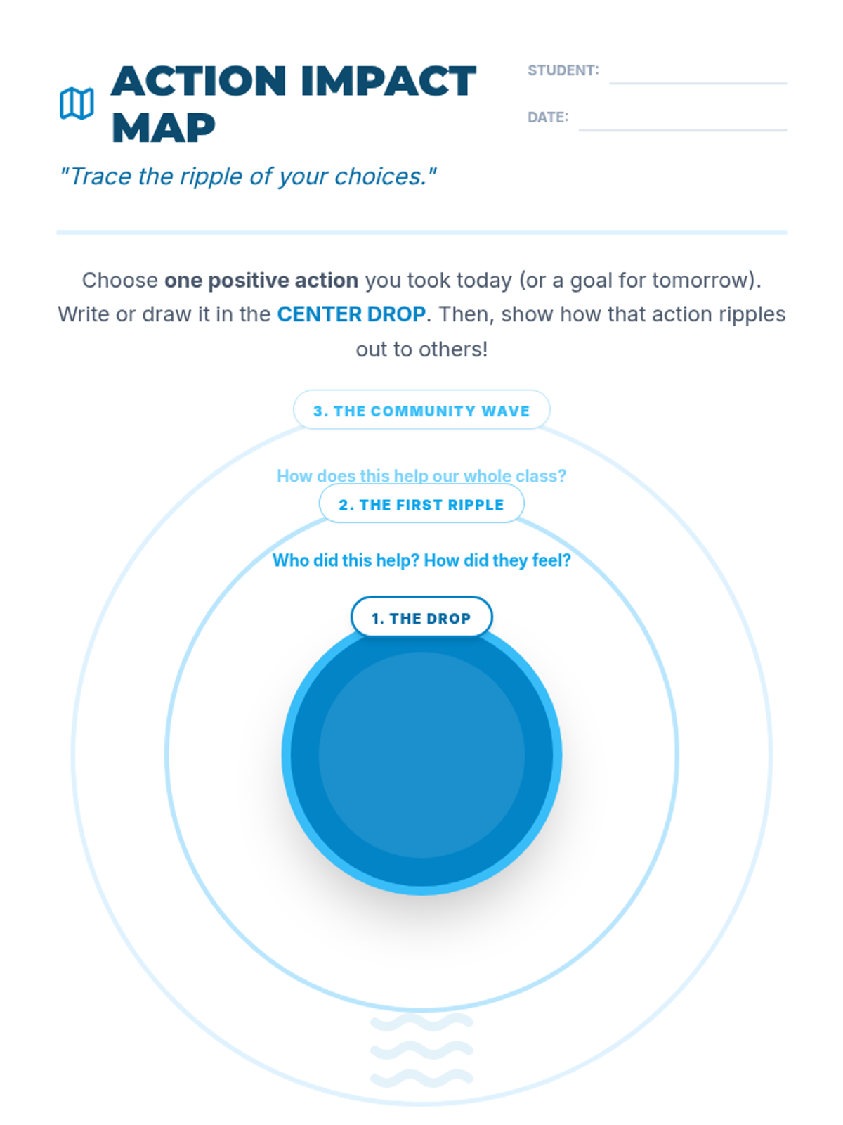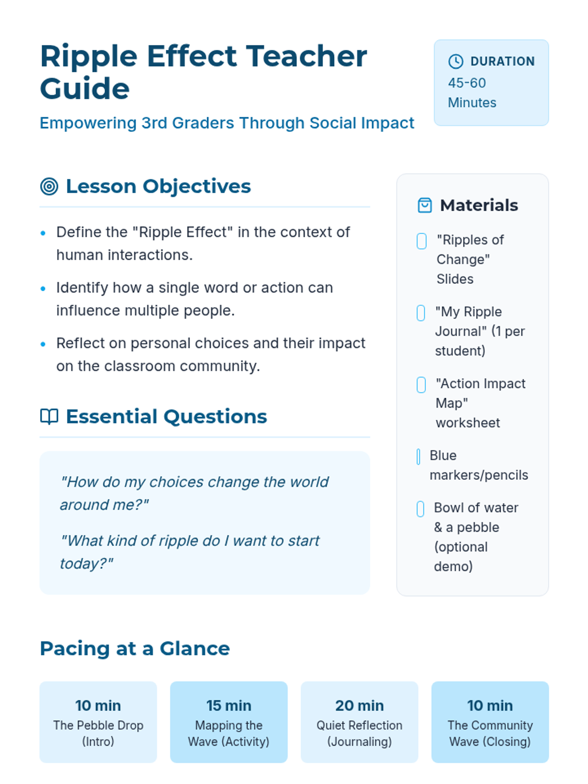 A social-emotional learning lesson for 3rd graders exploring how individual actions and words impact others through the metaphor of a ripple in water. Students reflect on their personal power to shape their classroom community through journaling and visual mapping.