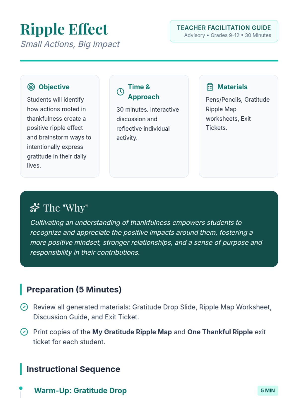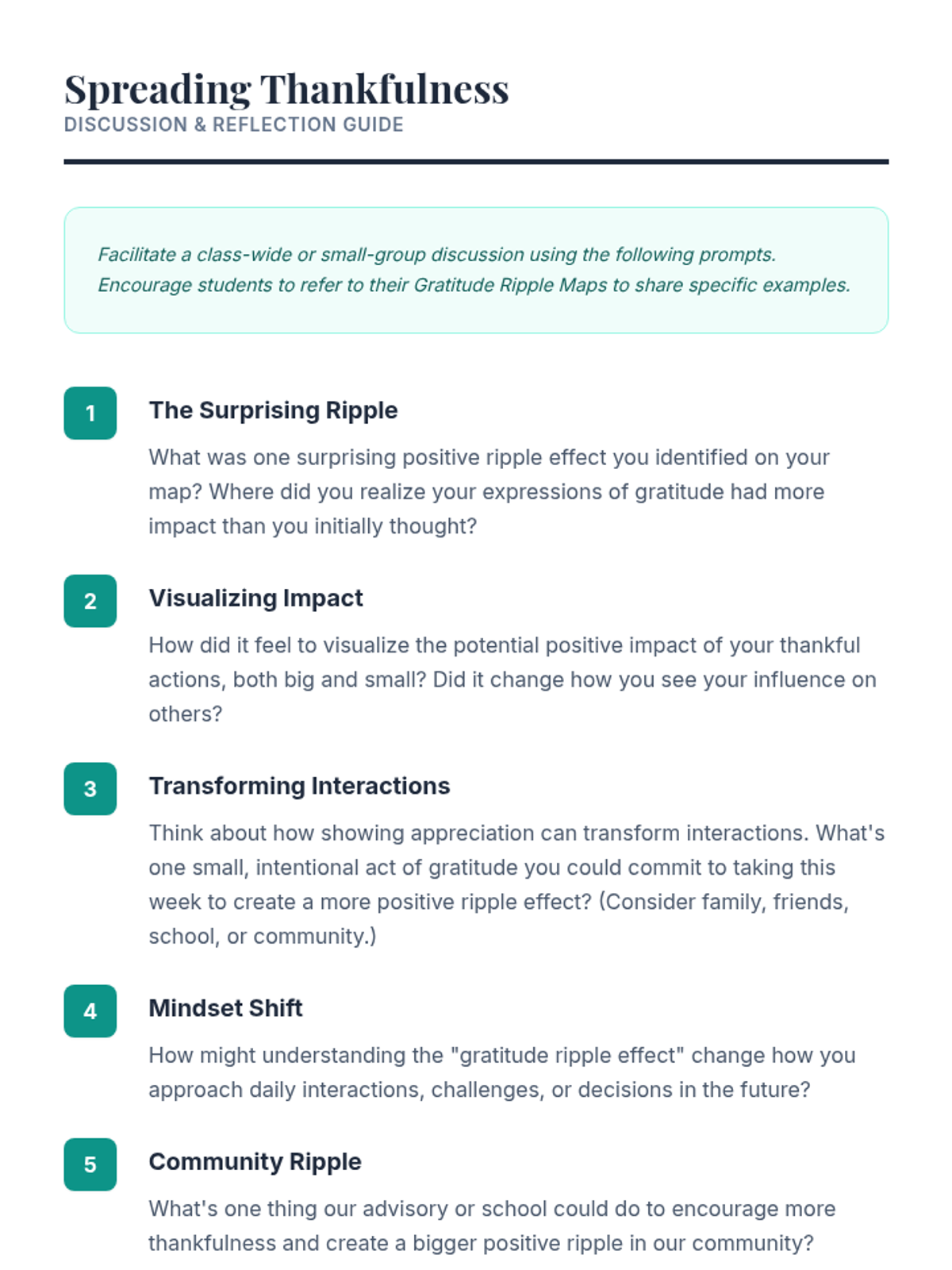 A 30-minute advisory lesson for high schoolers exploring how small acts of gratitude and kindness create positive ripples in their community and the world.