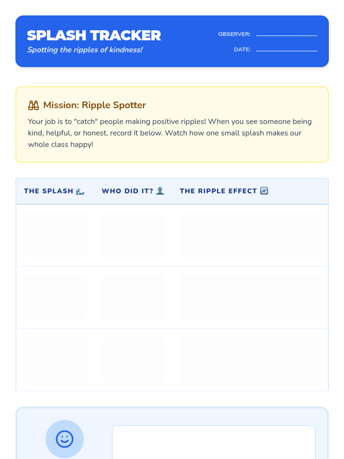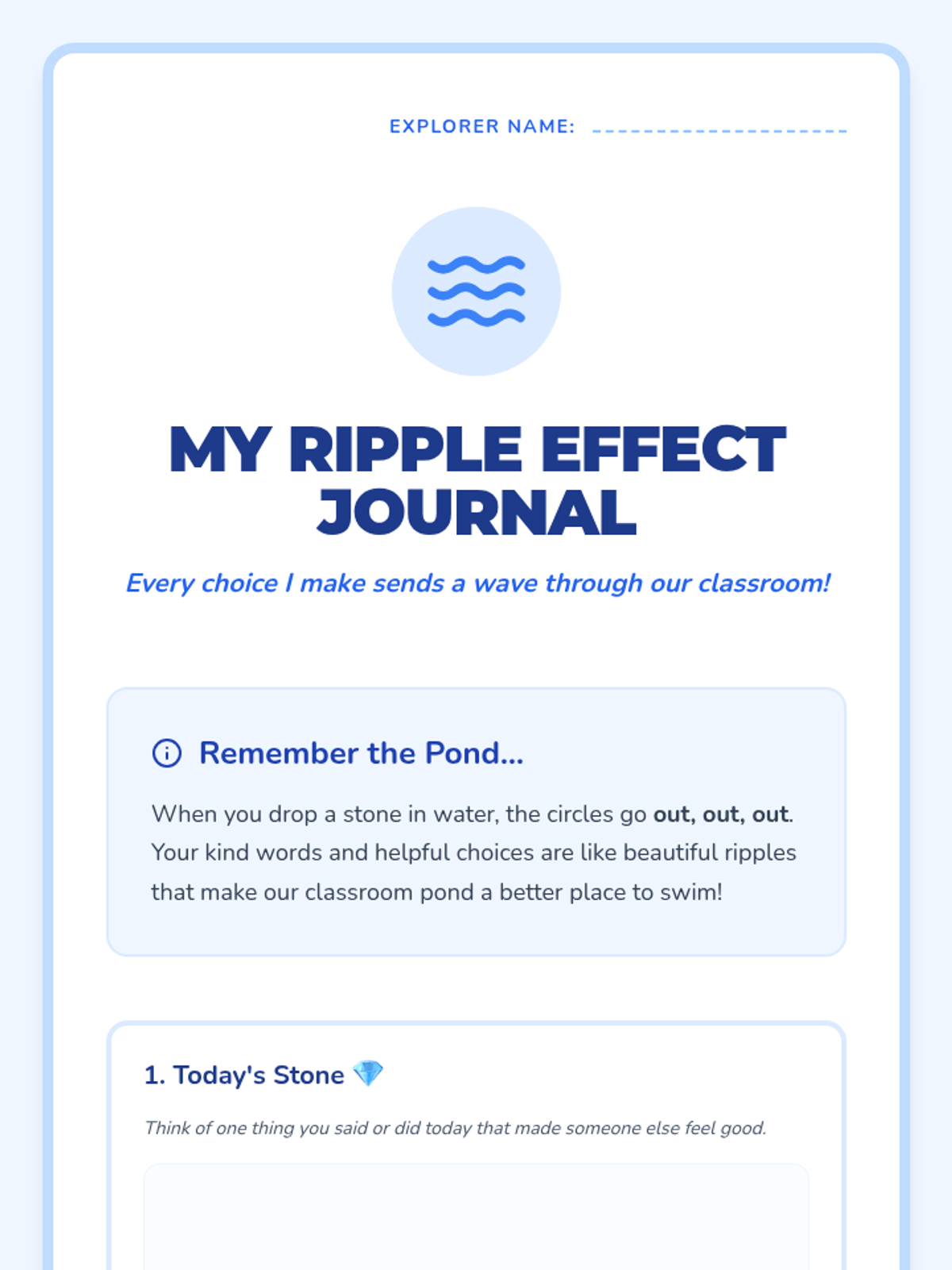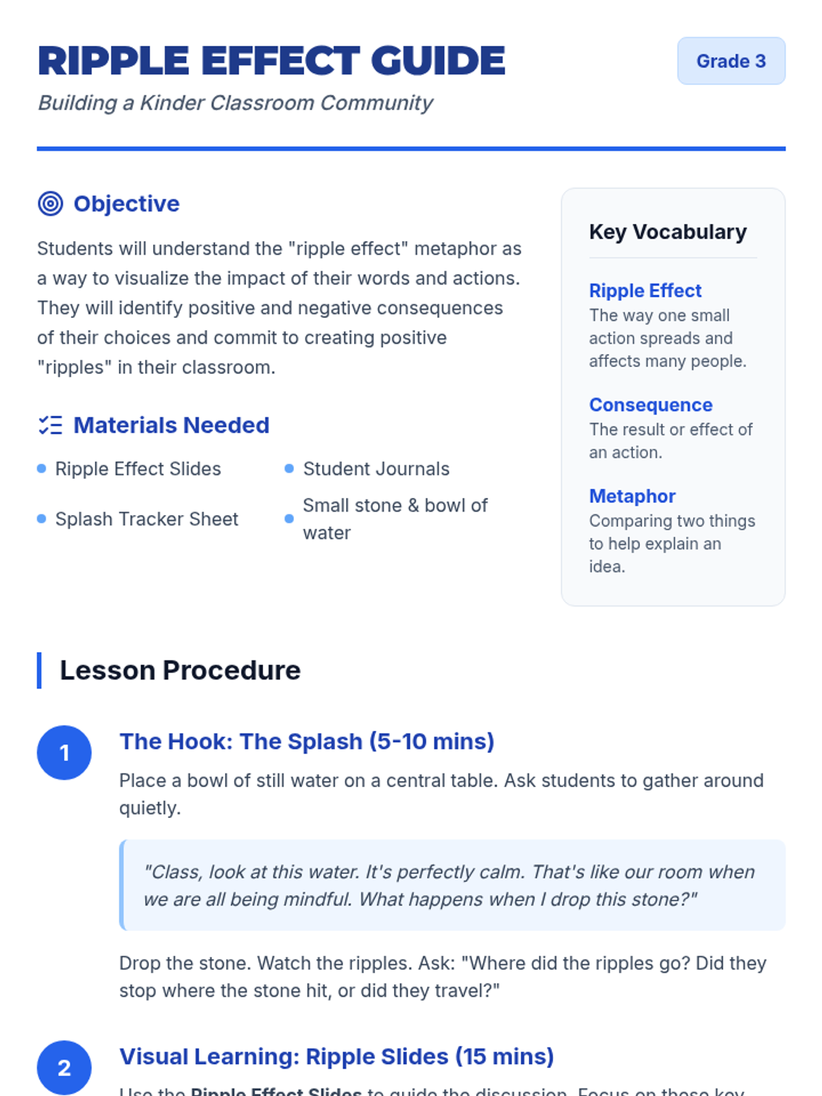 A lesson helping 3rd graders understand the 'ripple effect' of their words and actions through visual metaphors and reflective journaling. Students learn to recognize their power to impact their classroom community positively.