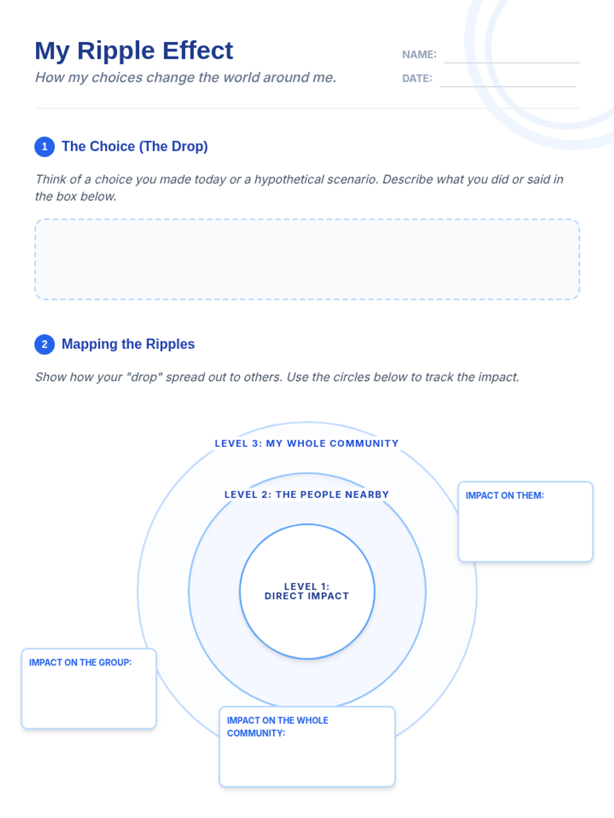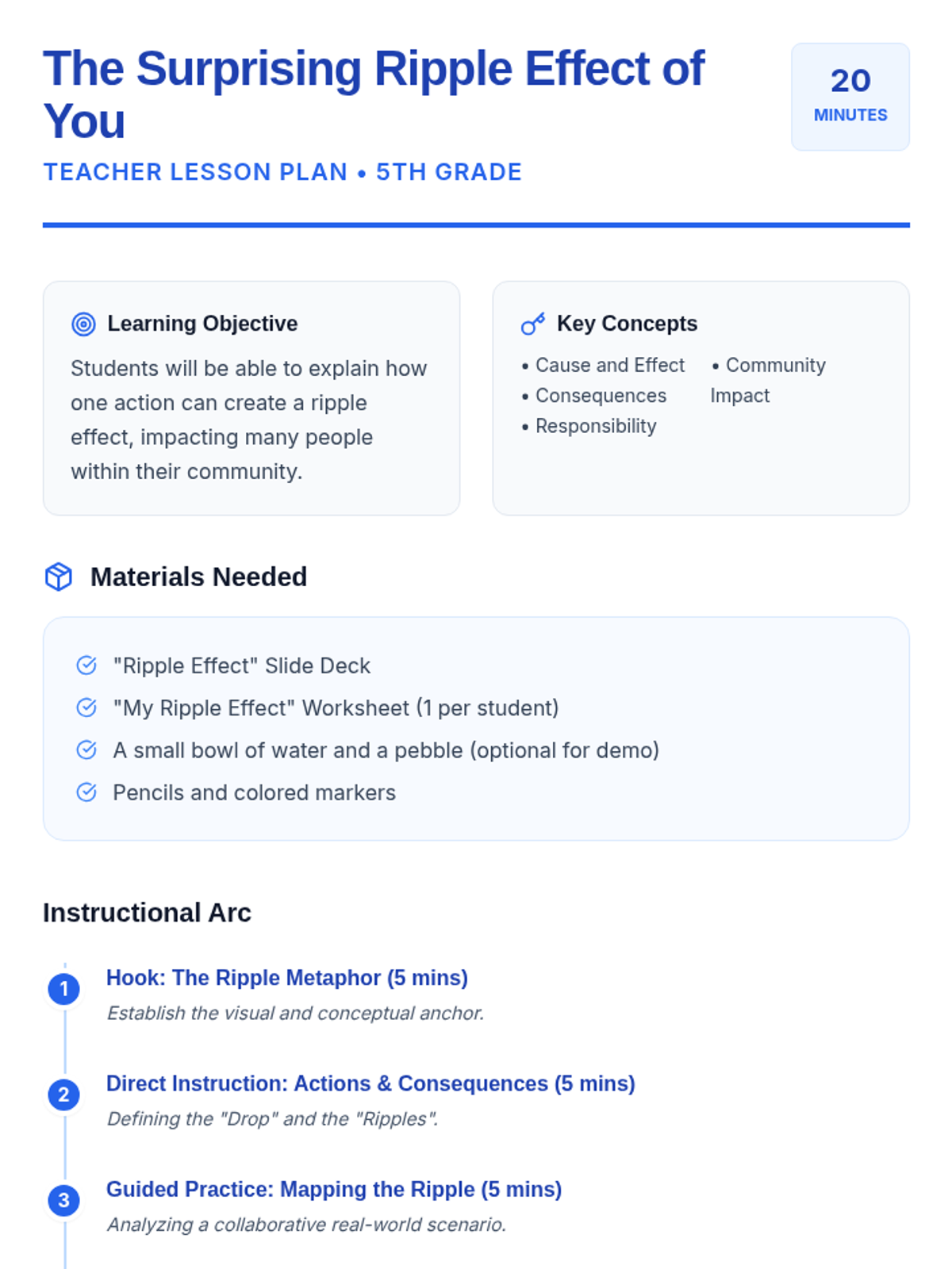A quick, impactful 20-minute lesson exploring how individual actions create a chain reaction of consequences within a community. Students map out the 'ripple effect' of positive and negative choices to understand their personal responsibility and power.