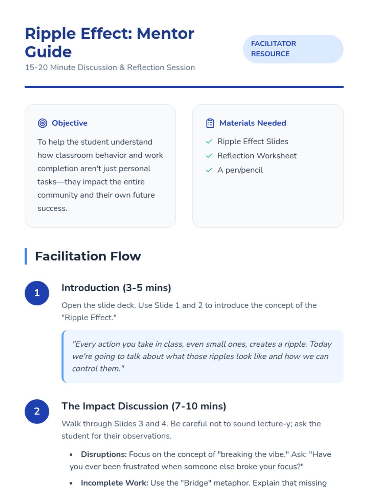 A short, impactful lesson designed for mentor-mentee pairs to explore the social and academic consequences of classroom disruptions and incomplete assignments.