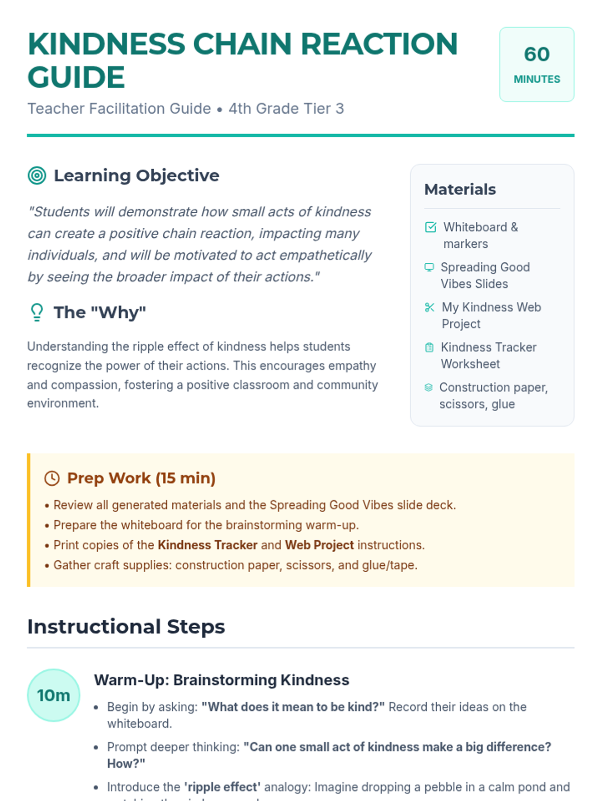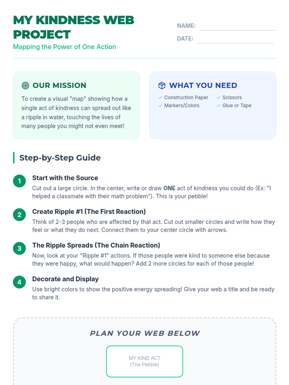 This lesson explores how small acts of kindness create a positive ripple effect through a visual demonstration, discussion, and a hands-on project. Students in 4th grade will learn to recognize the broader impact of their empathetic actions and be motivated to spread positivity.