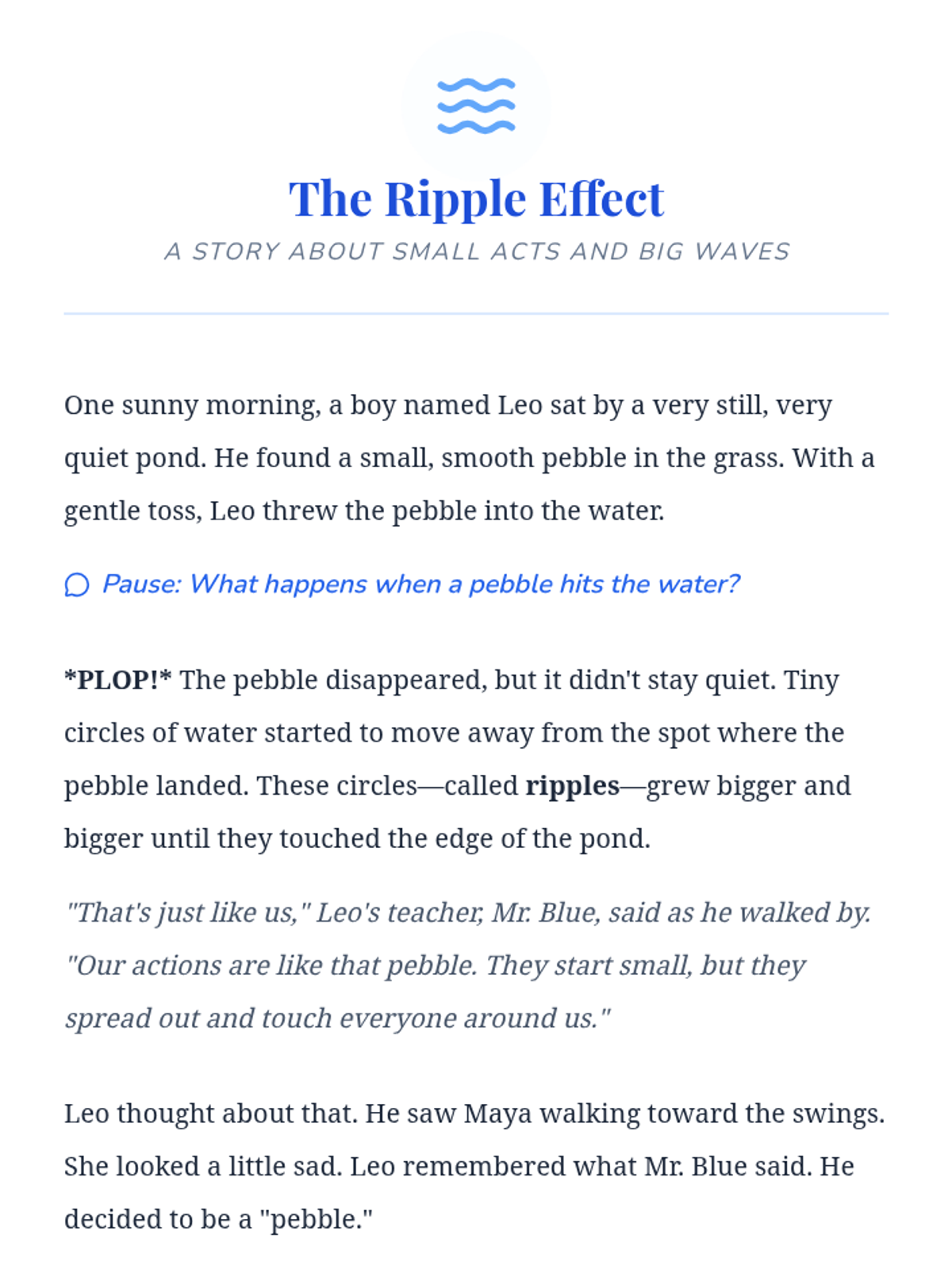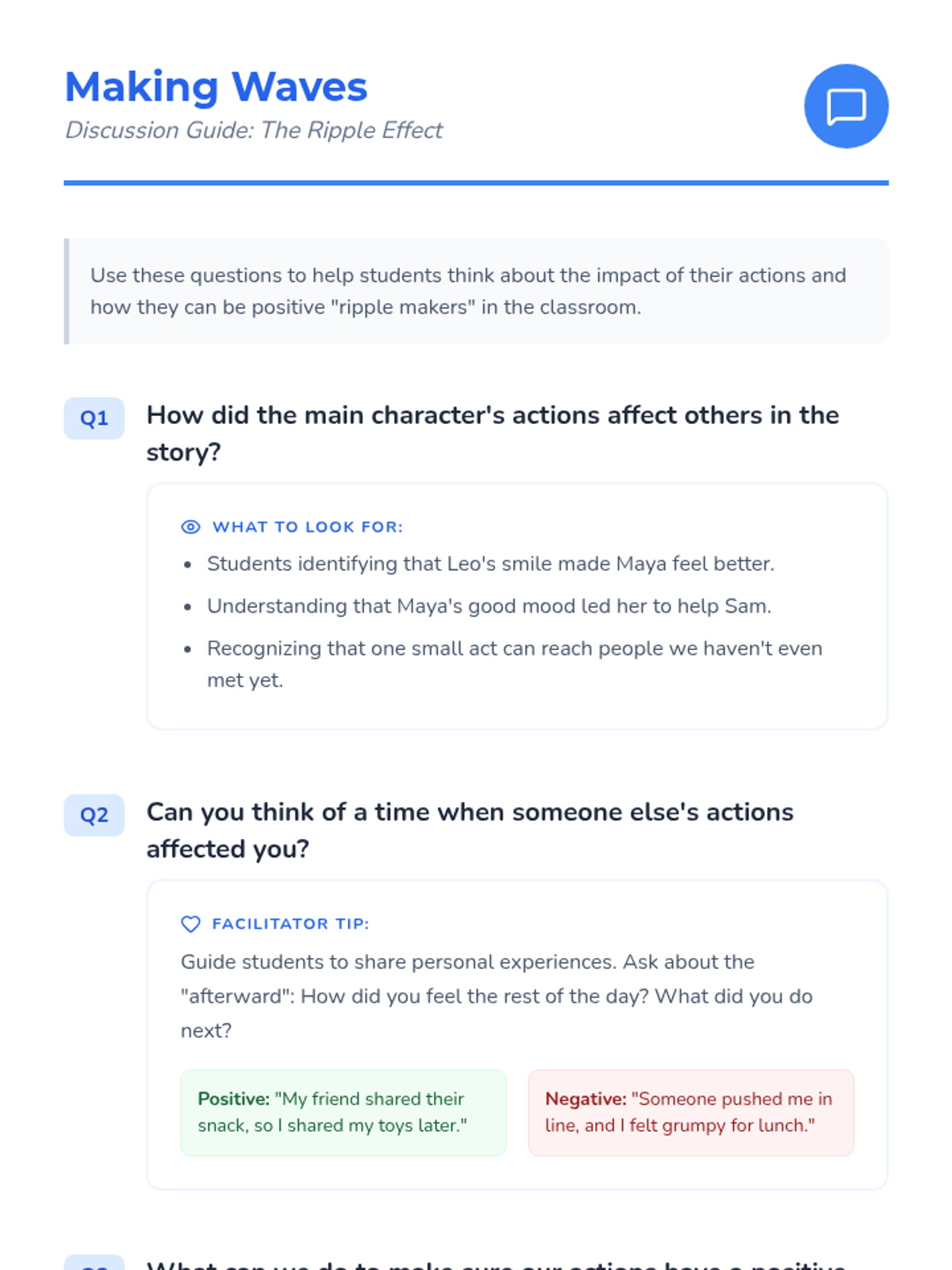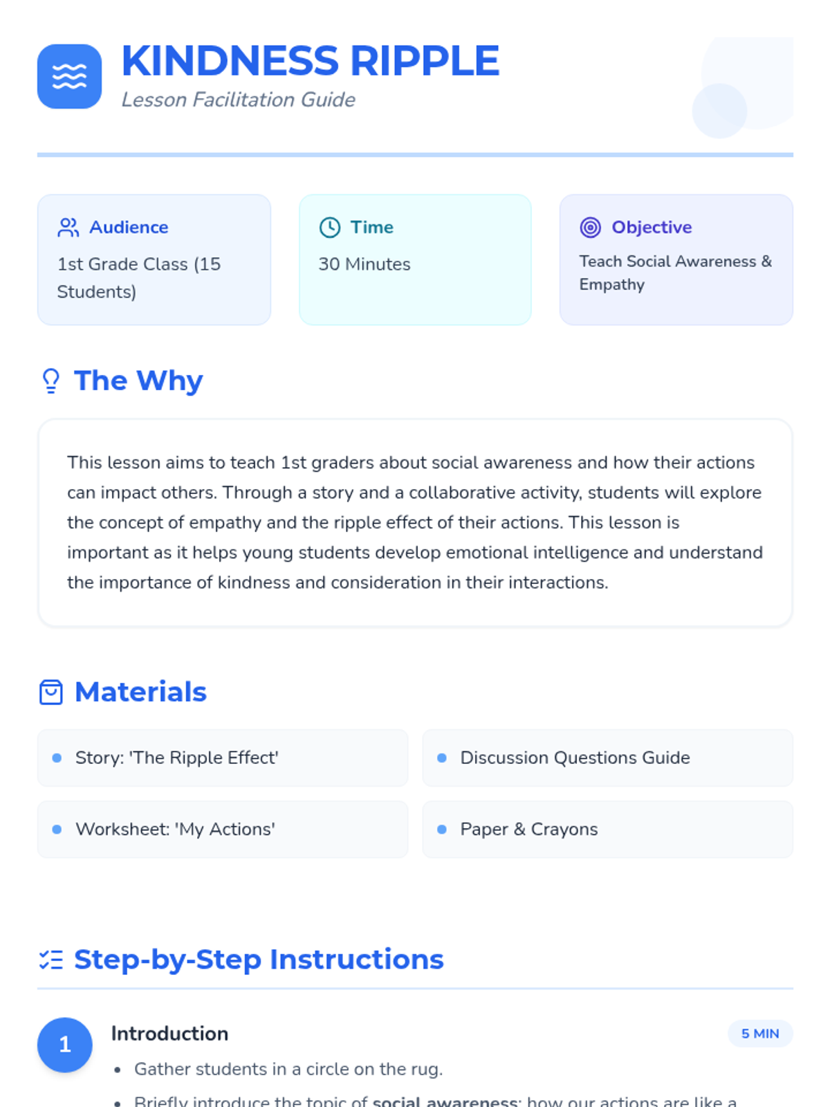 This lesson teaches 1st graders about social awareness and the 'ripple effect' of their actions. Through a story and hands-on activities, students explore how small acts of kindness can spread and impact their entire community.