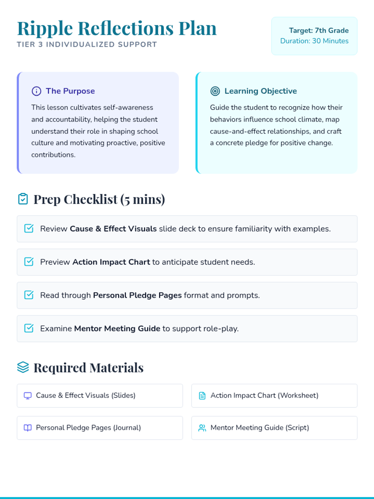 An individualized Tier 3 plan for 7th-grade students to explore the social consequences of their actions and commit to positive contributions through reflection and goal setting.