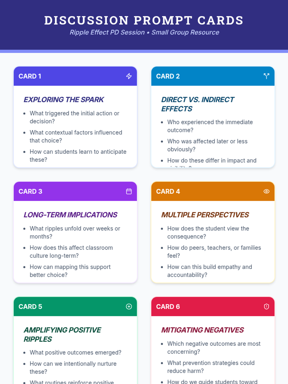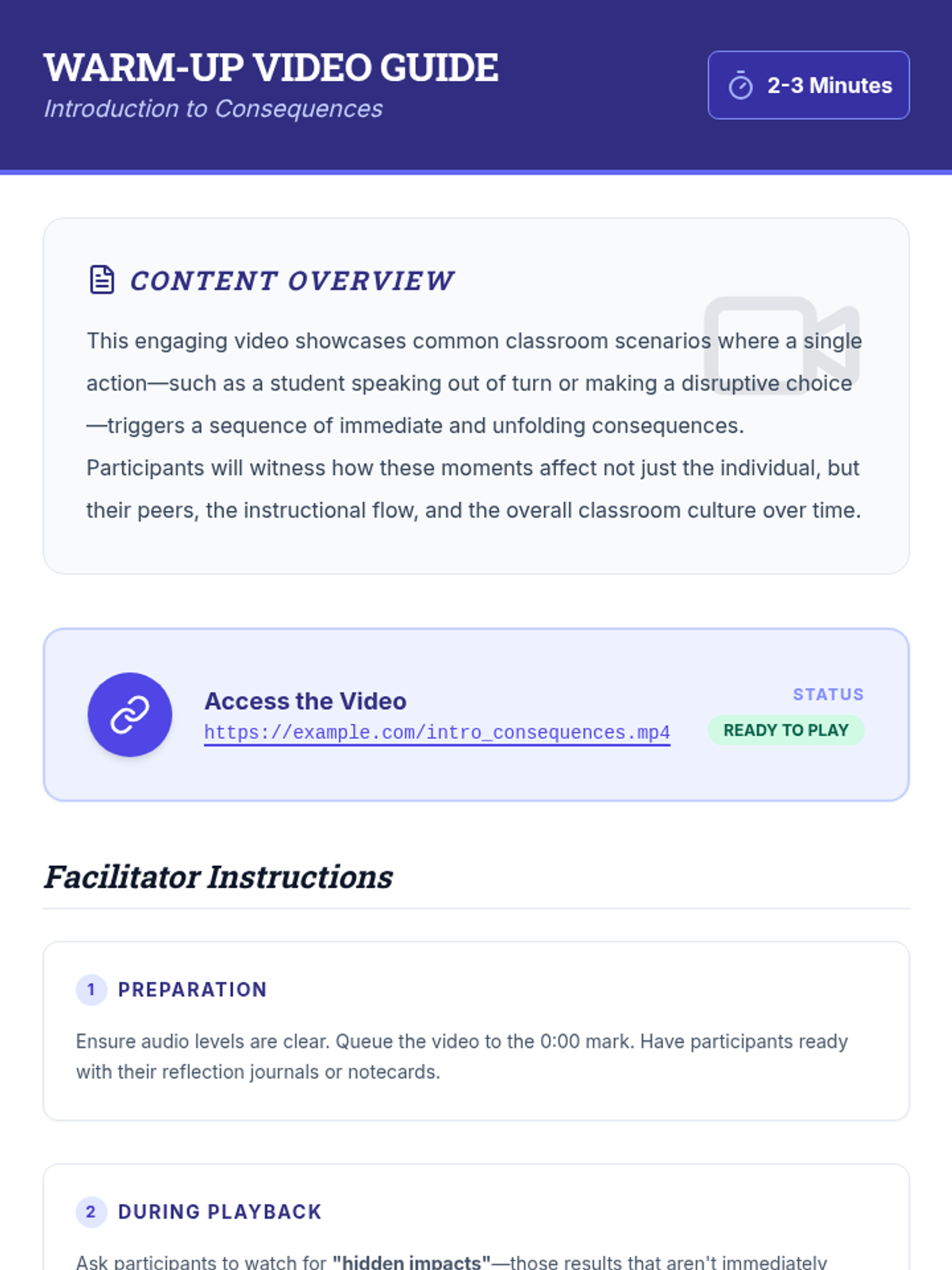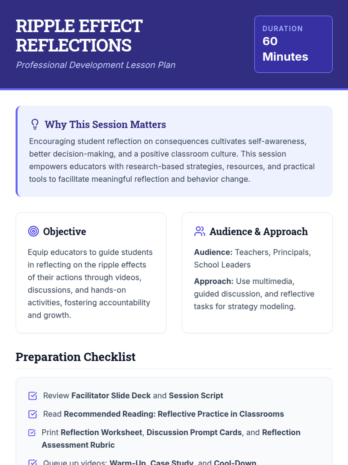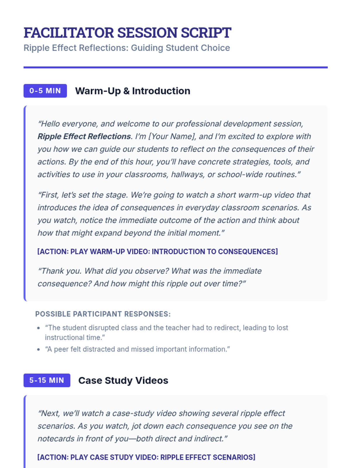 A one-hour Tier 1 professional development session for educators focused on facilitating student reflection on the consequences of their actions through videos, discussions, and hands-on mapping activities.