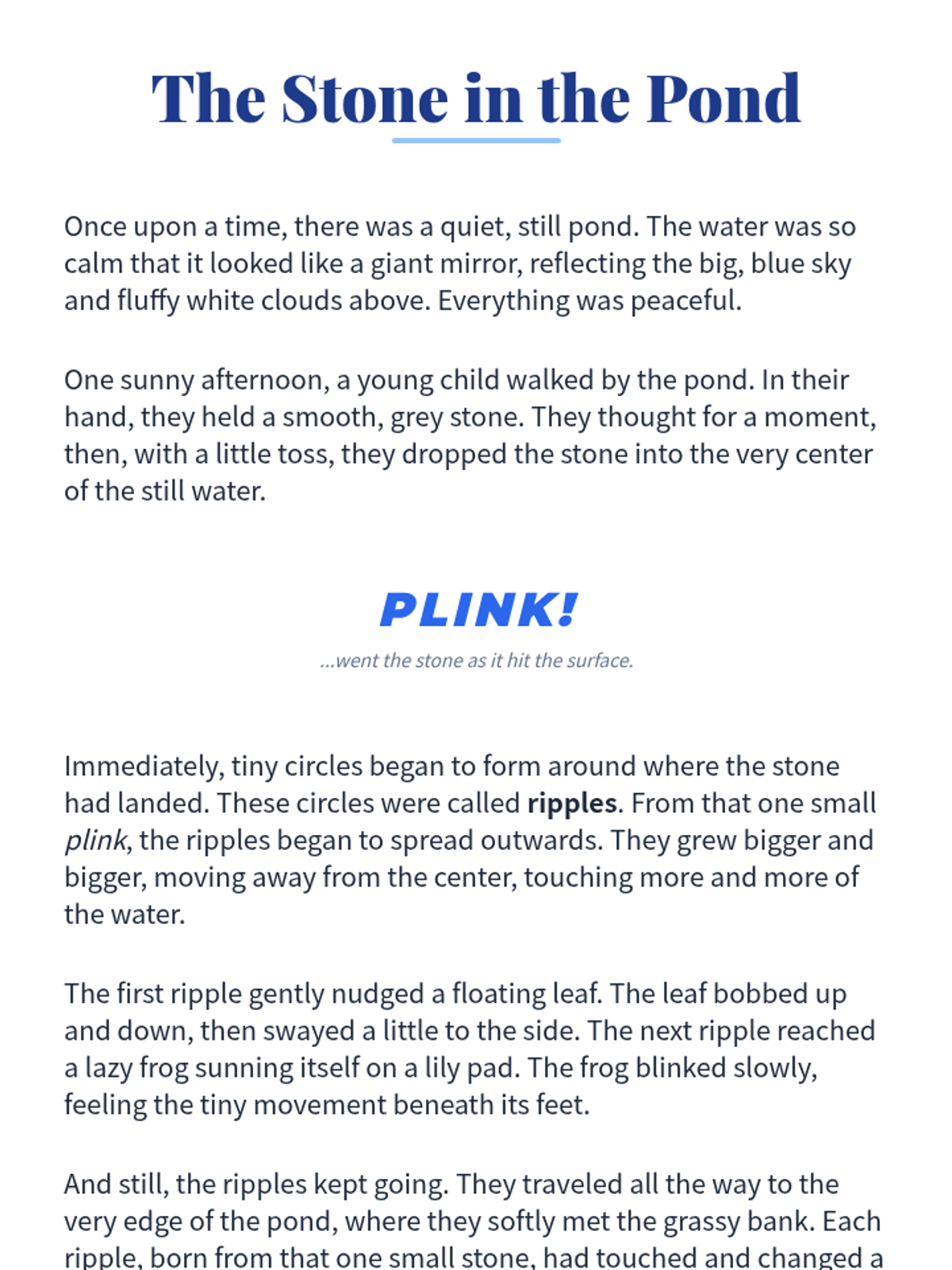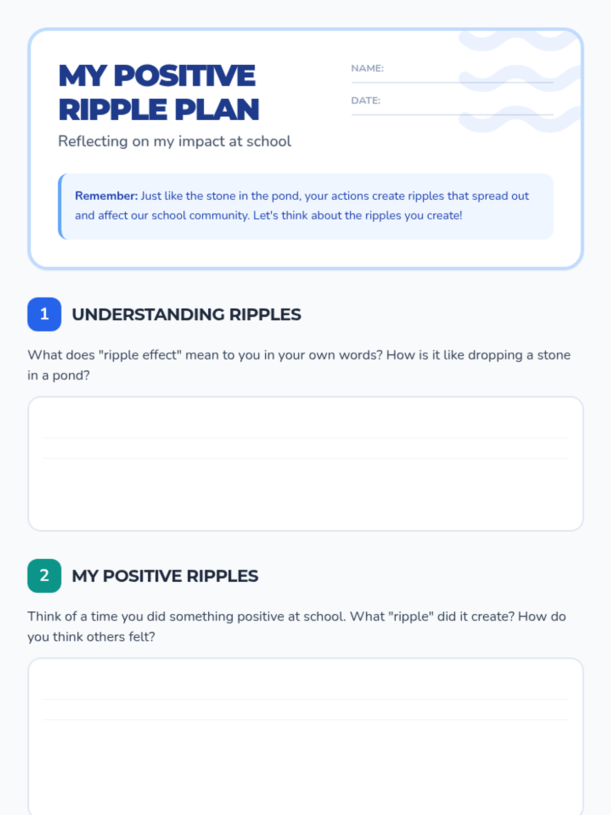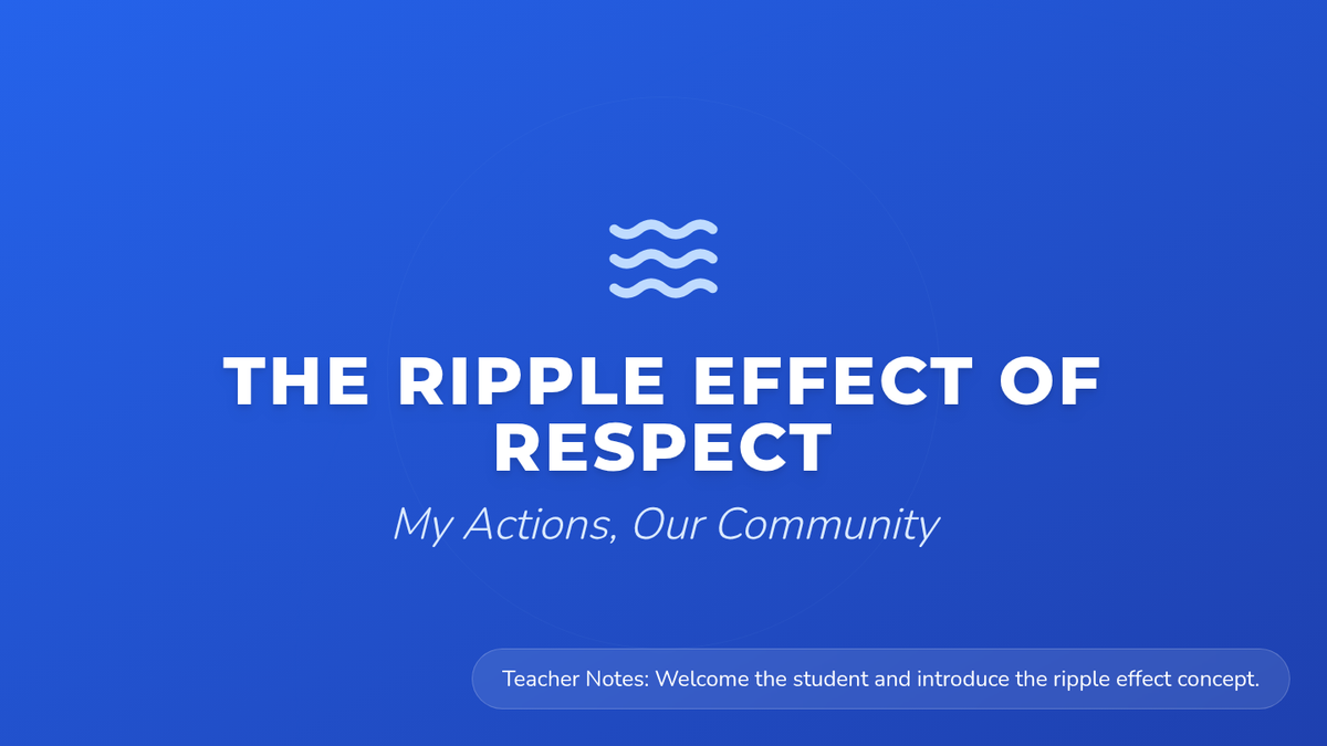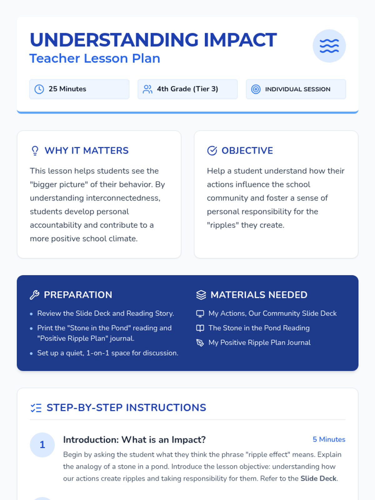 A Tier 3 individual social-emotional learning lesson for 4th graders exploring how personal actions create 'ripples' that affect the entire school community, fostering accountability and positive climate.