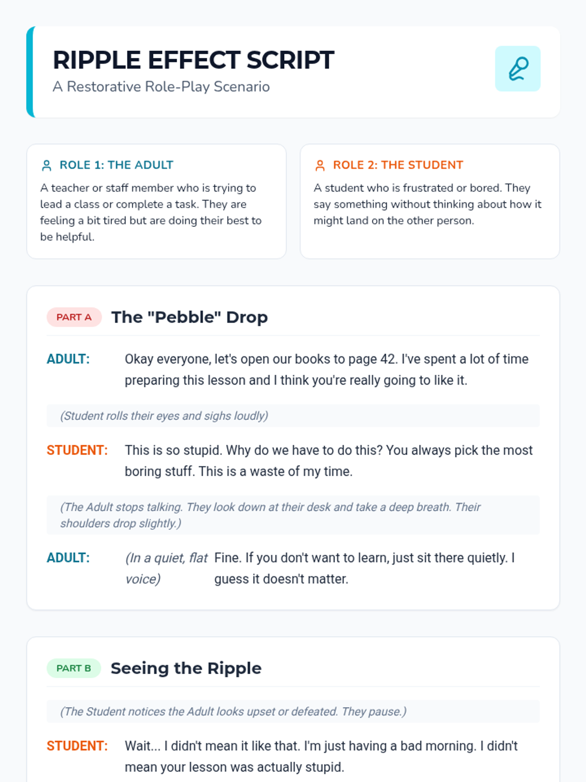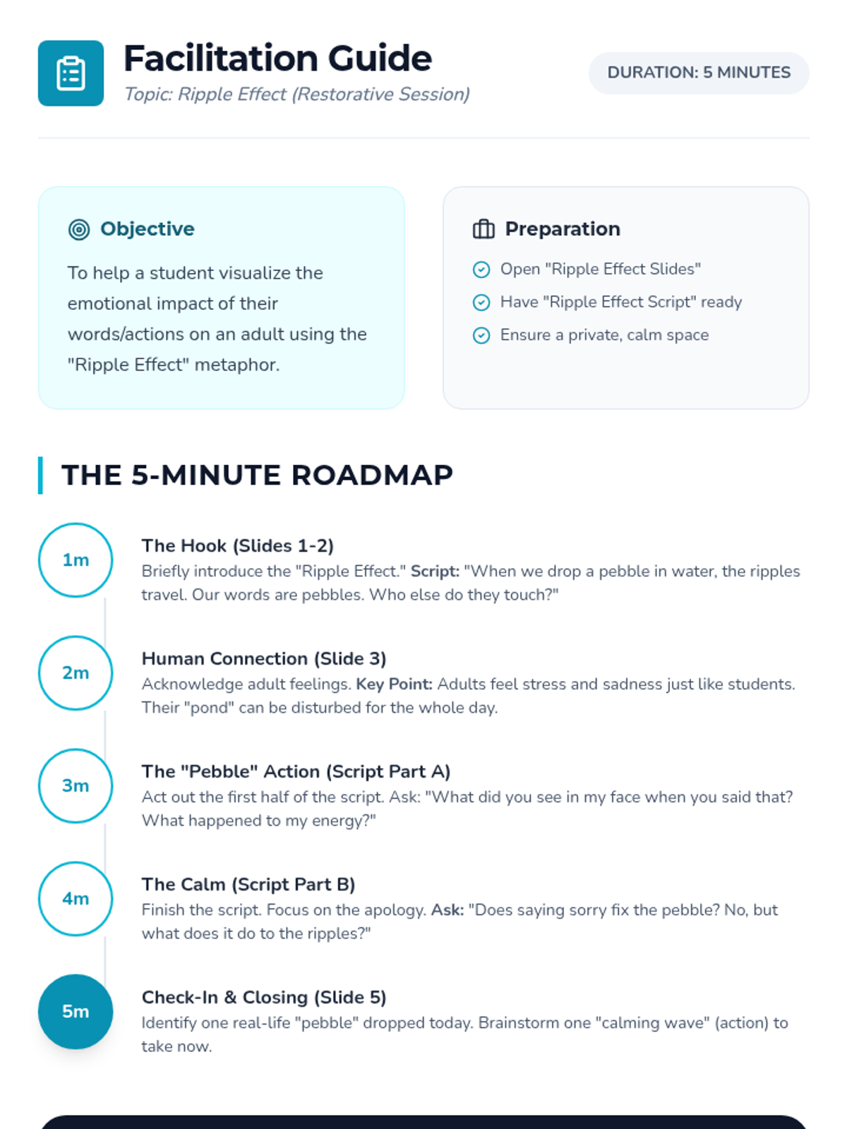 A quick, 5-minute restorative lesson focused on empathy and understanding the emotional impact of words or actions on adults. Includes a presentation, a role-play script, and a teacher facilitation guide.