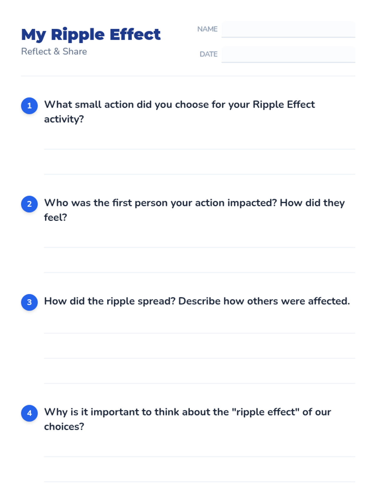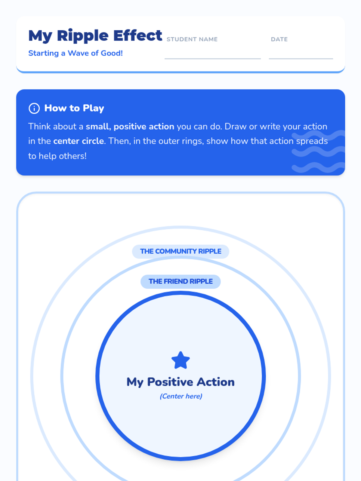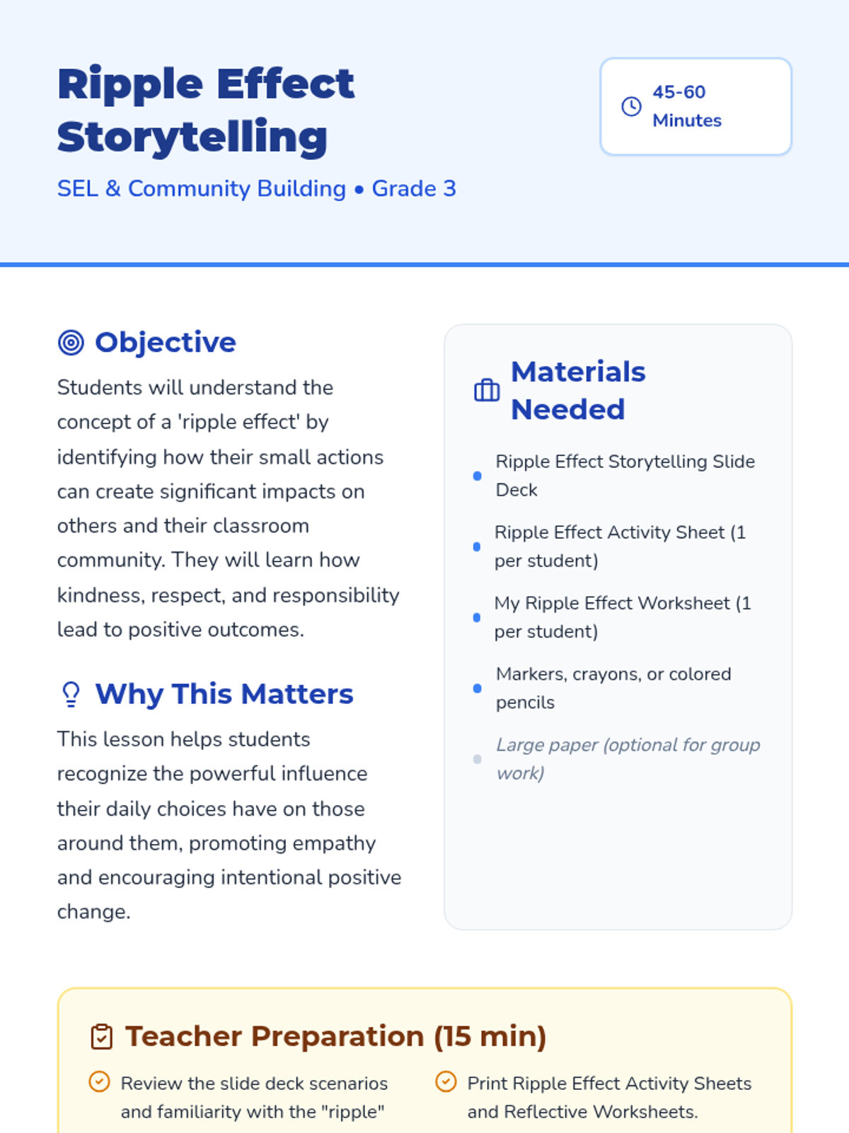 A SEL lesson for 3rd graders exploring how small positive actions like kindness and responsibility create a 'ripple effect' of impact on their classroom community.