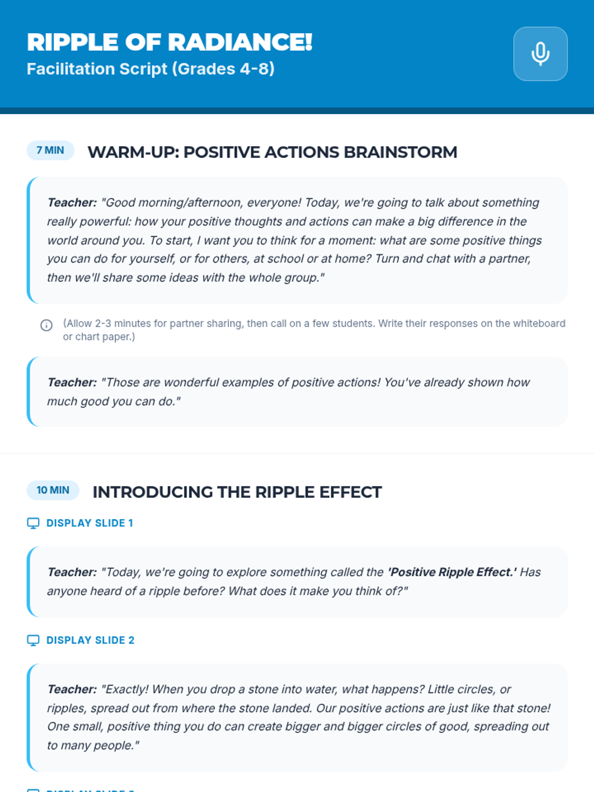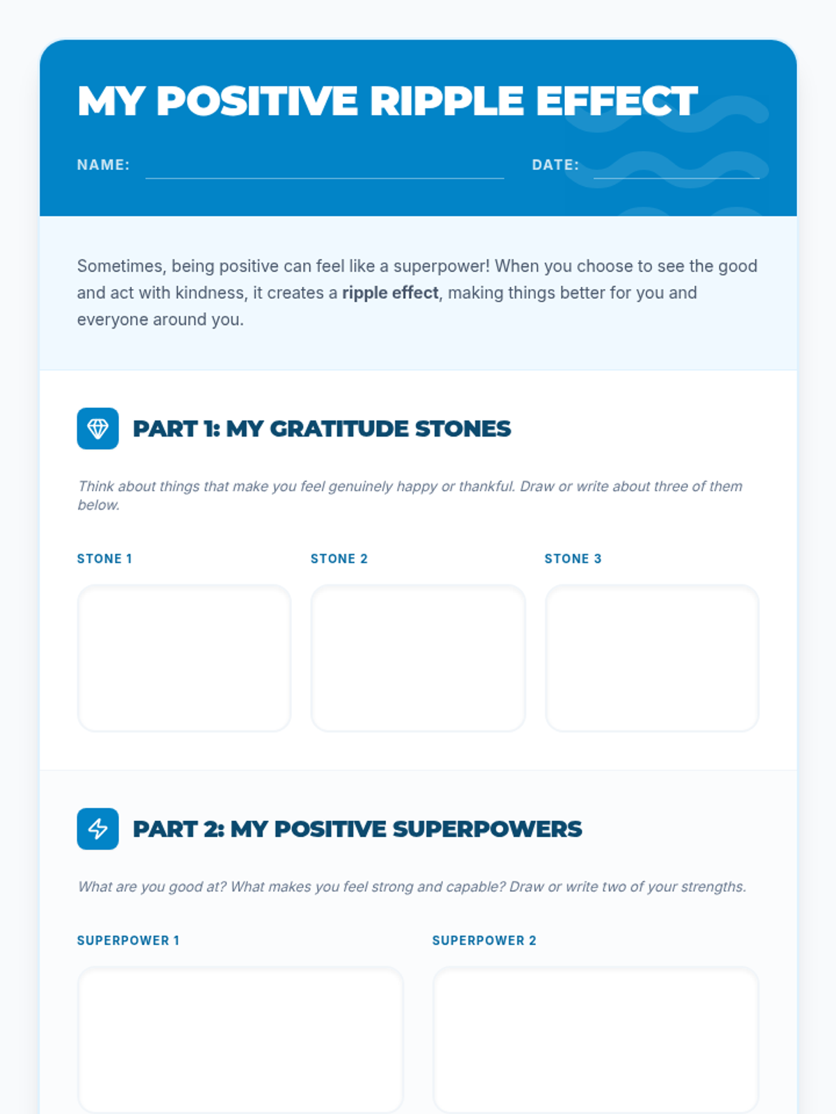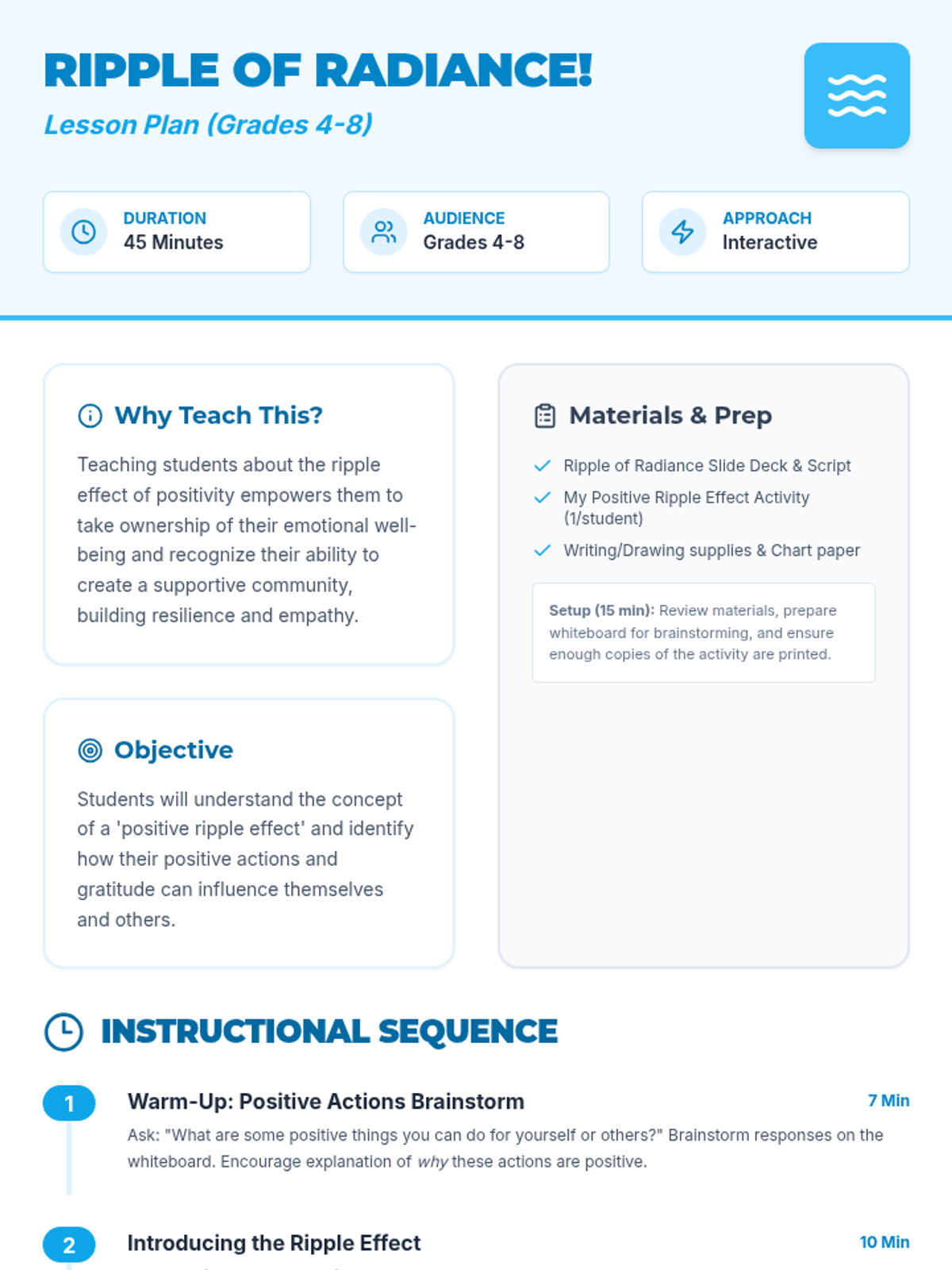 This lesson engages 4th-8th graders in understanding how their positive thoughts and actions create a 'ripple effect' on themselves and their community through self-reflection and personal strengths.