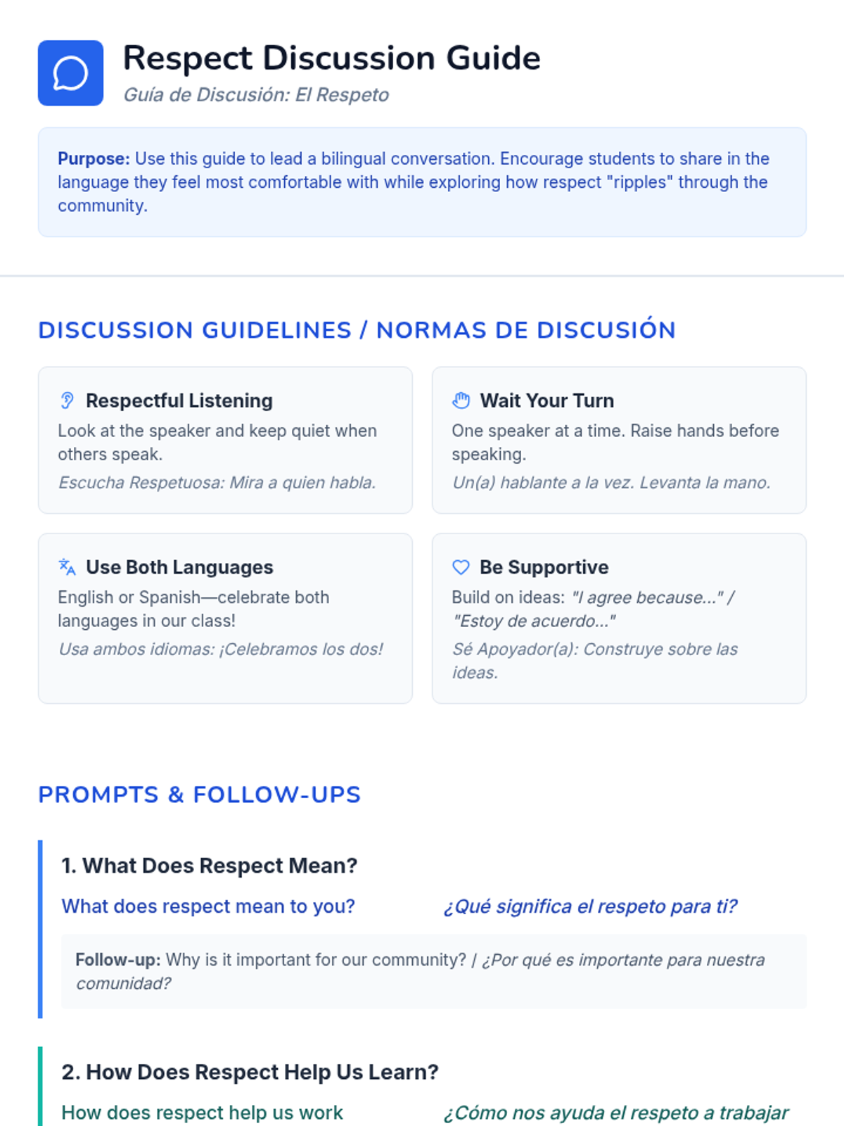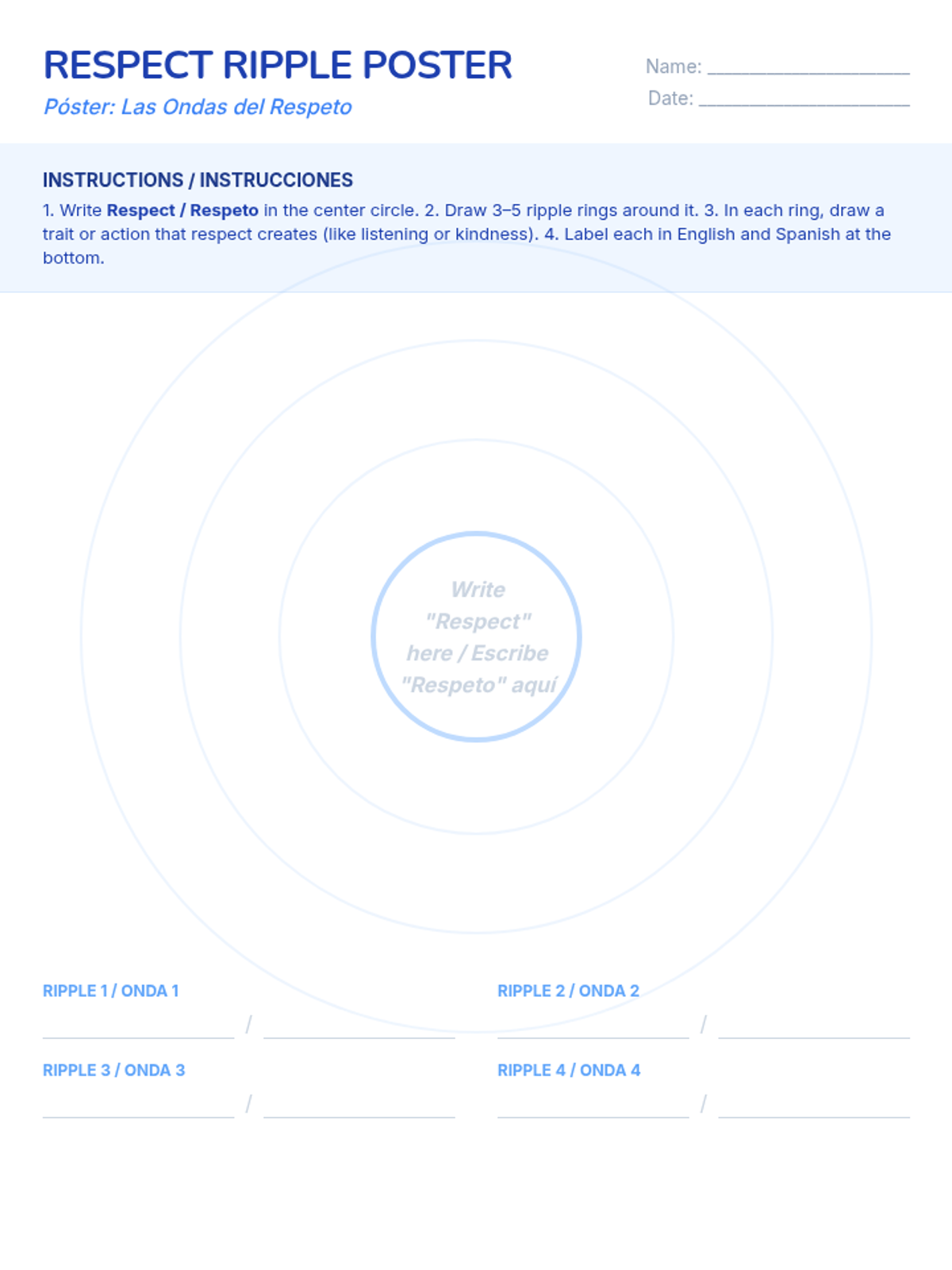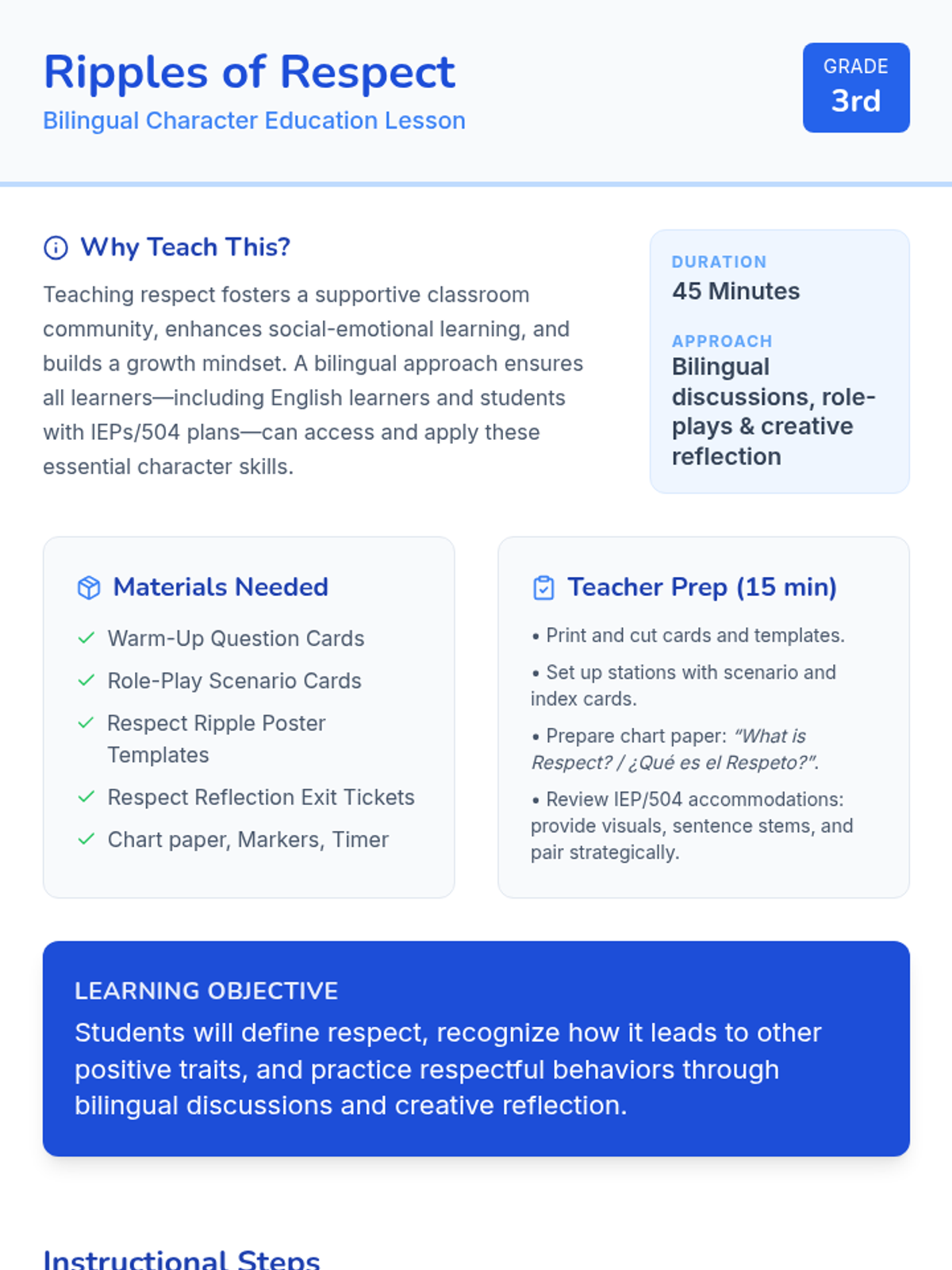 A 45-minute character education lesson for 3rd graders exploring respect through a bilingual lens. Students define respect, role-play scenarios, and create a visual 'Respect Ripple' poster.