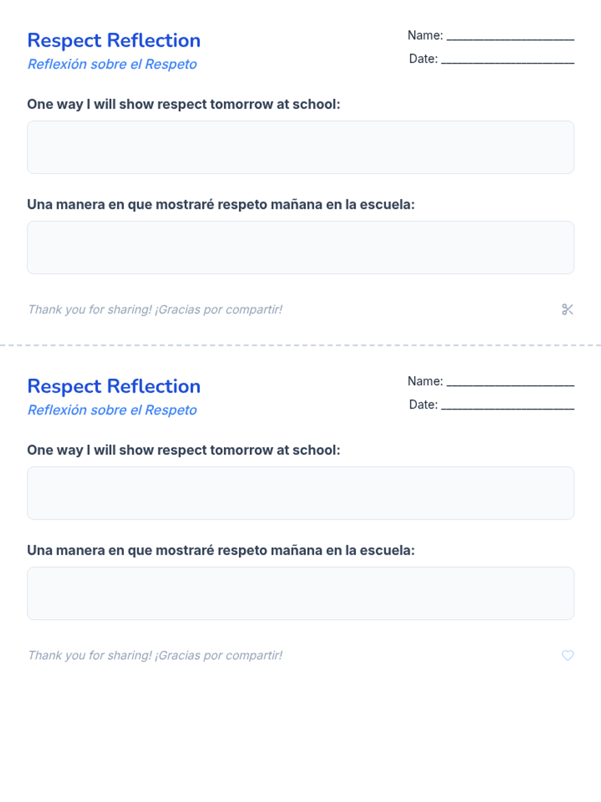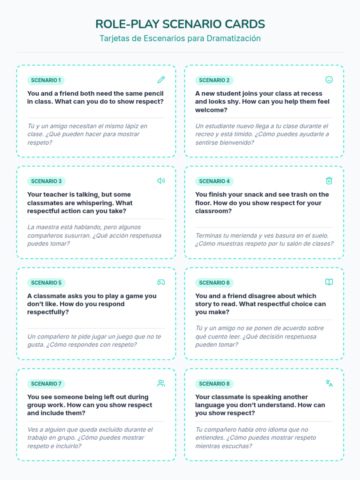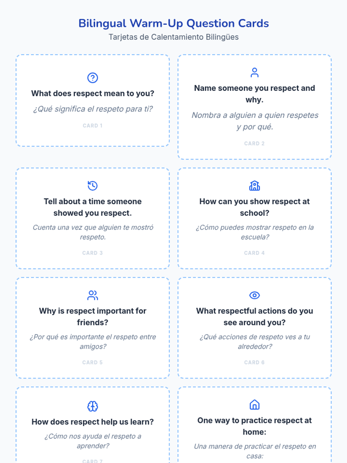 A 45-minute character education lesson for 3rd graders exploring respect through a bilingual lens. Students define respect, role-play scenarios, and create a visual 'Respect Ripple' poster.