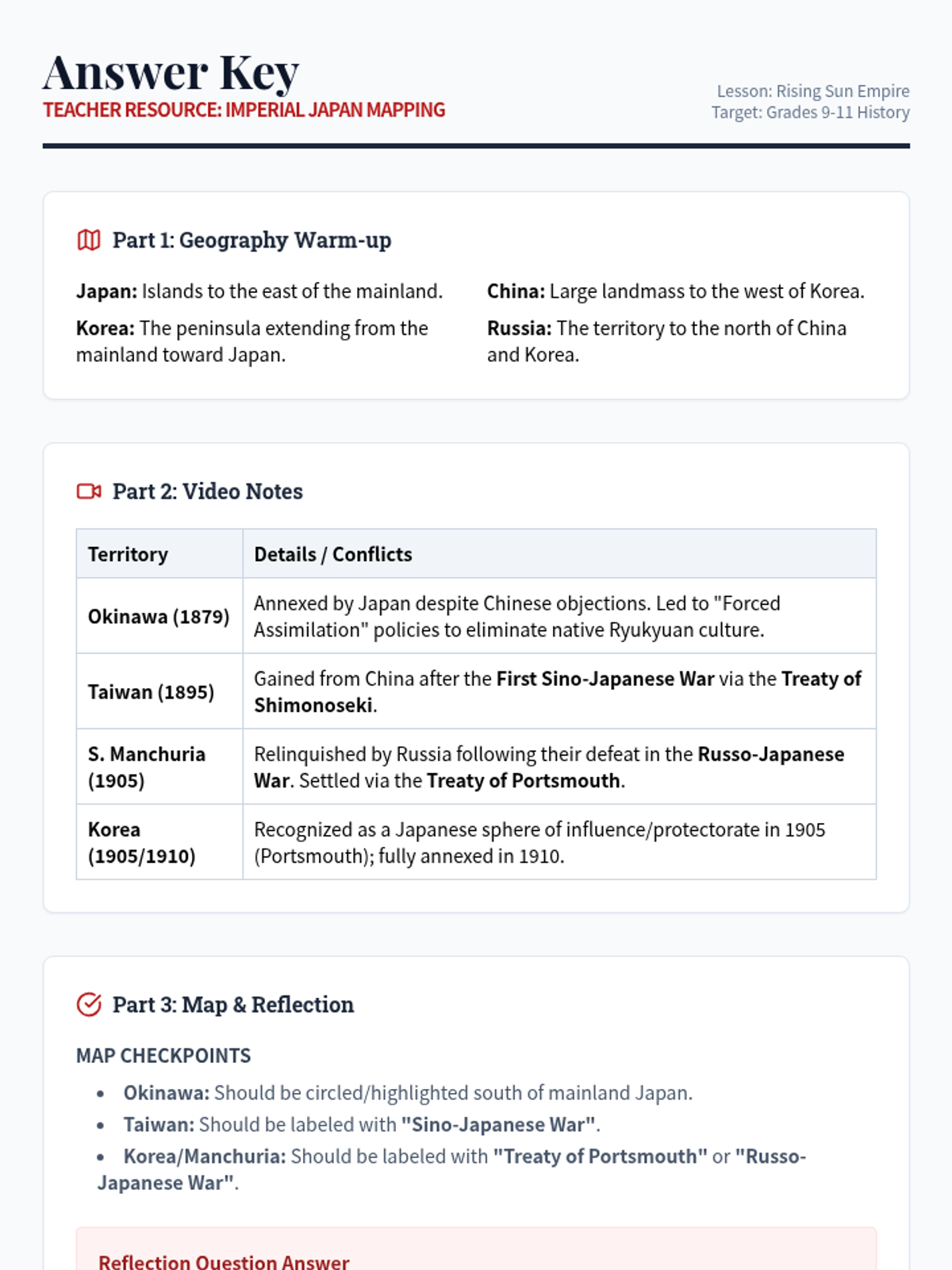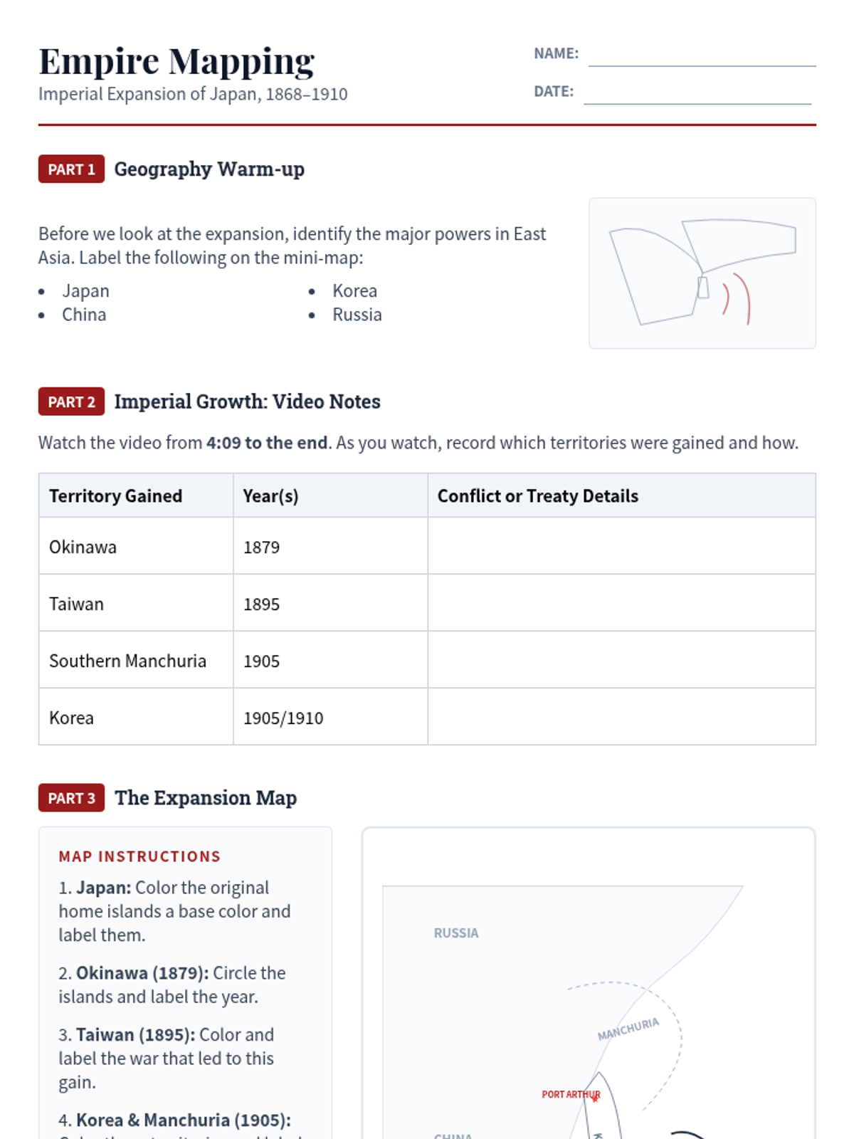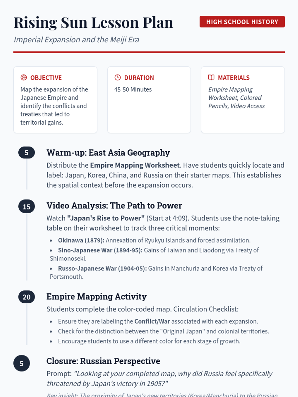 This lesson explores Japan's transition from an isolated nation to a global imperial power during the Meiji Era, focusing on territorial gains through the Sino-Japanese and Russo-Japanese Wars. Students will analyze video evidence and synthesize their learning by creating a color-coded map of Japanese expansion.