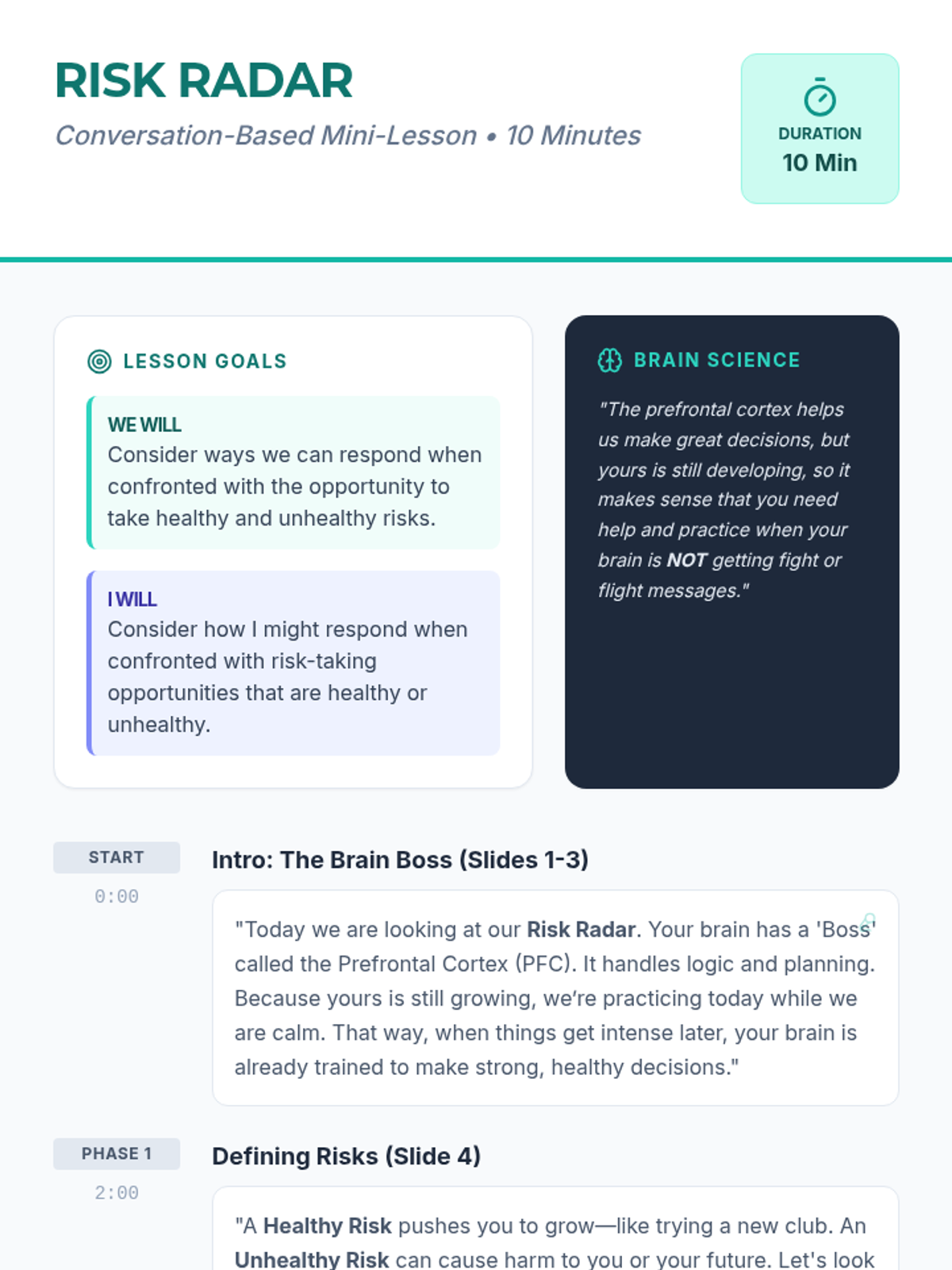 A 10-minute interactive session that explores the neuroscience of risk-taking and provides students with conversational practice for making healthy decisions.