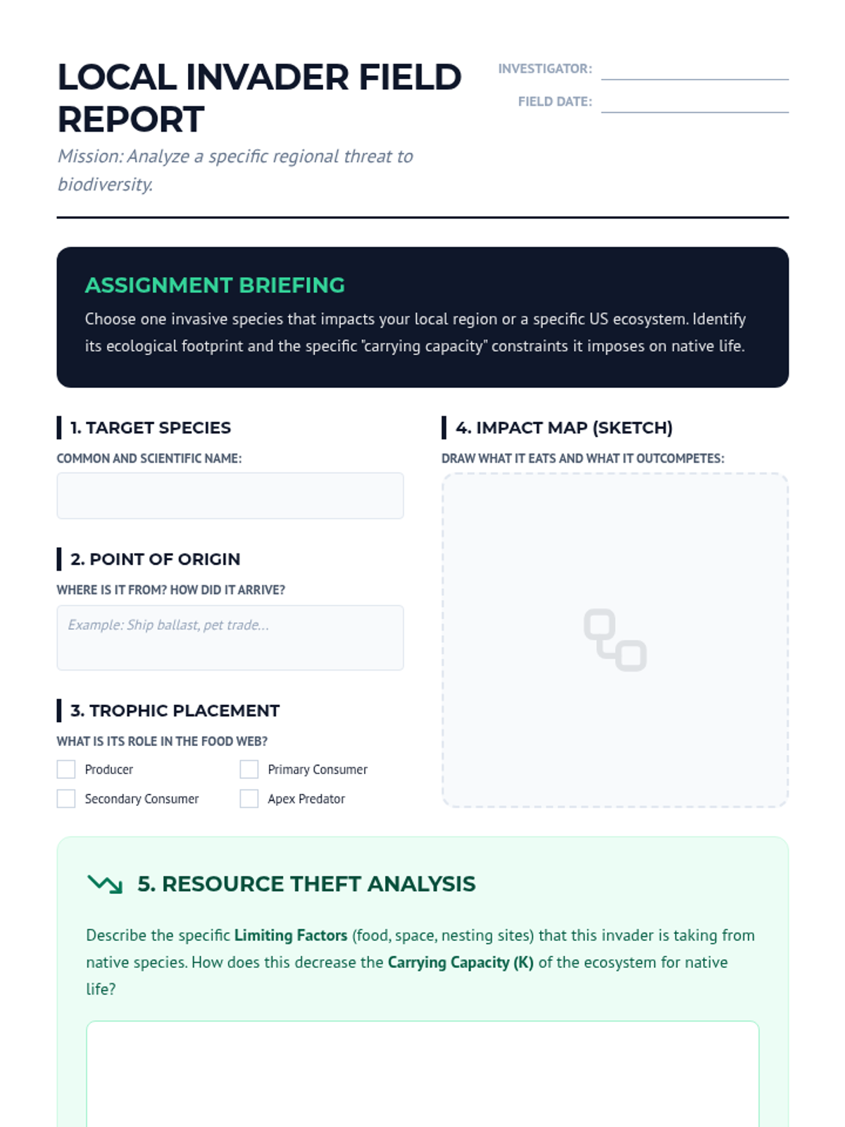 A comprehensive lesson on invasive species focusing on their dramatic impact on local populations and ecosystems through data analysis and food web mapping.