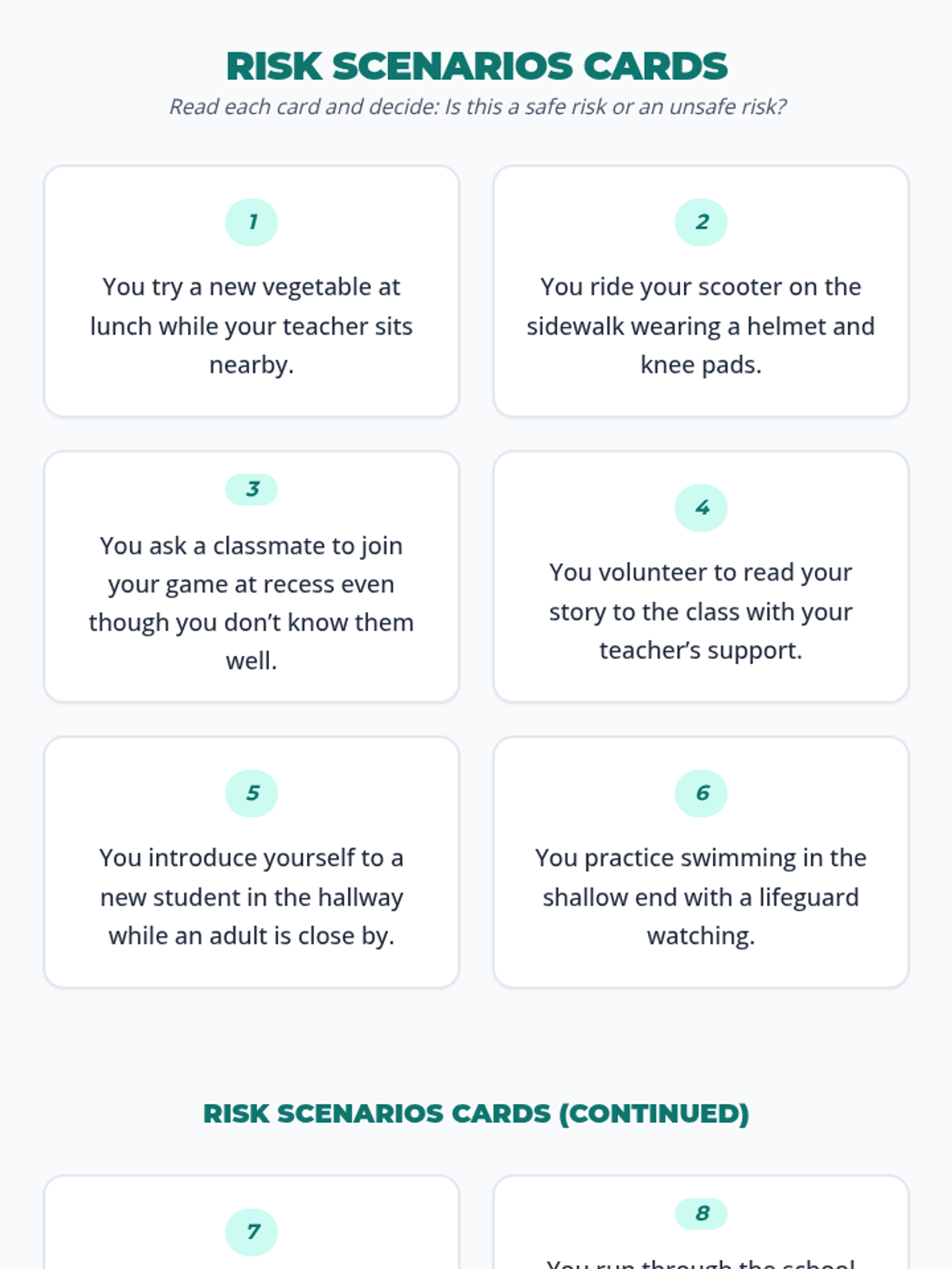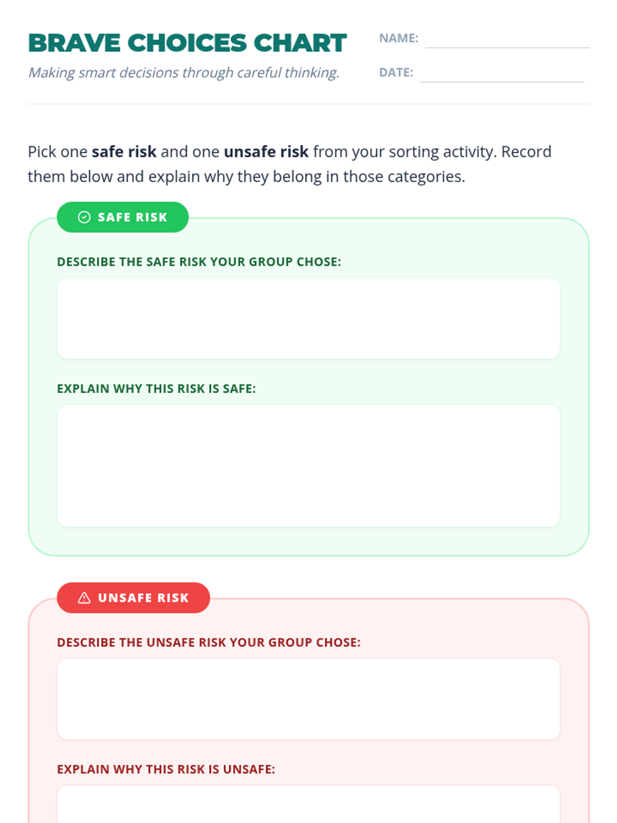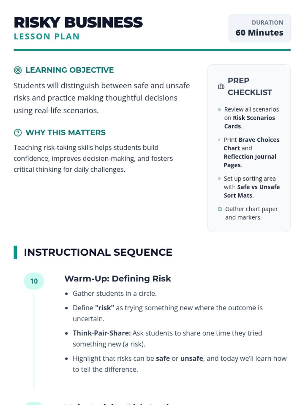 In this 60-minute lesson, 3rd graders explore what it means to take risks, distinguish between safe and unsafe risks, and learn strategies to make brave, informed decisions.