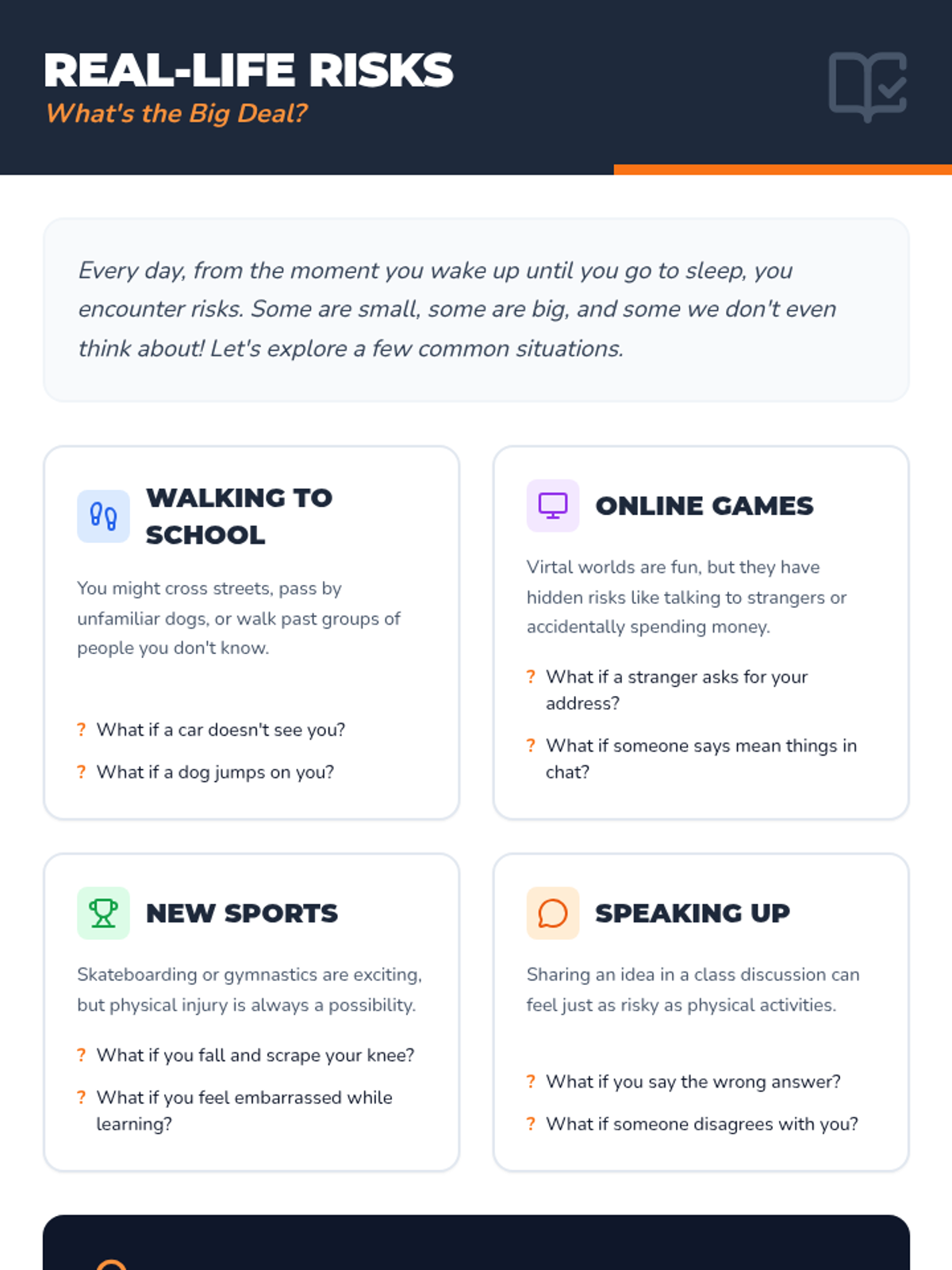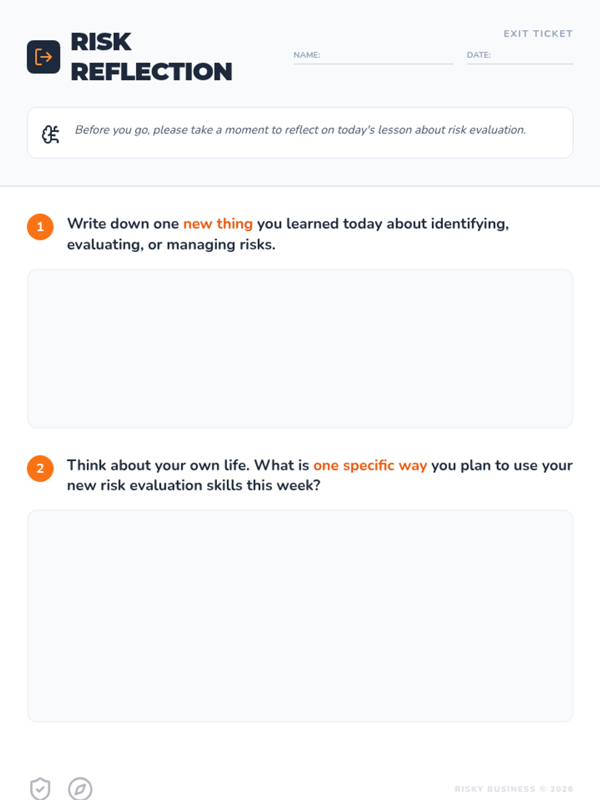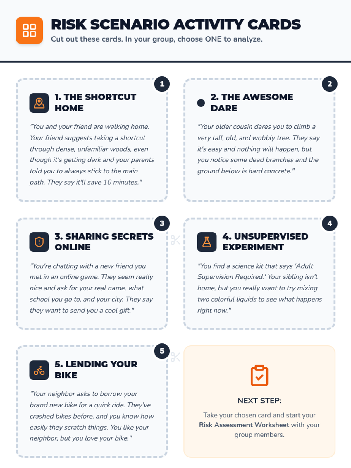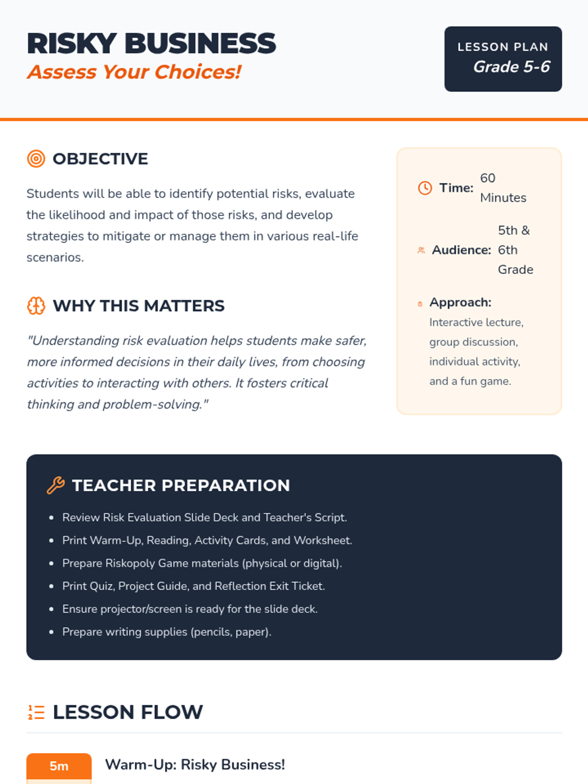 This one-hour lesson helps 5th and 6th-grade students understand how to identify, evaluate, and mitigate risks in their daily lives through interactive discussion, a scenario-based group activity, and a fun classroom game.