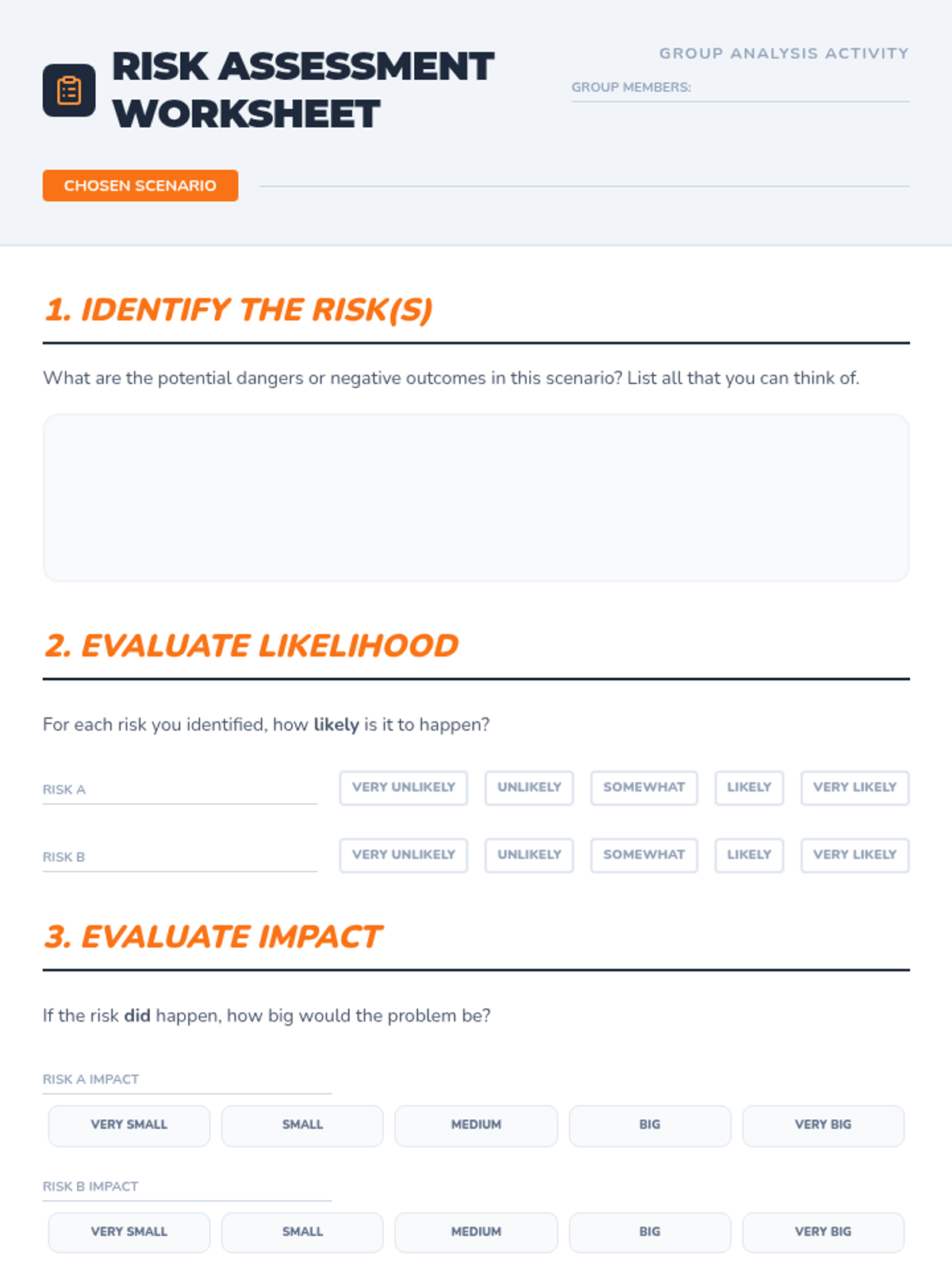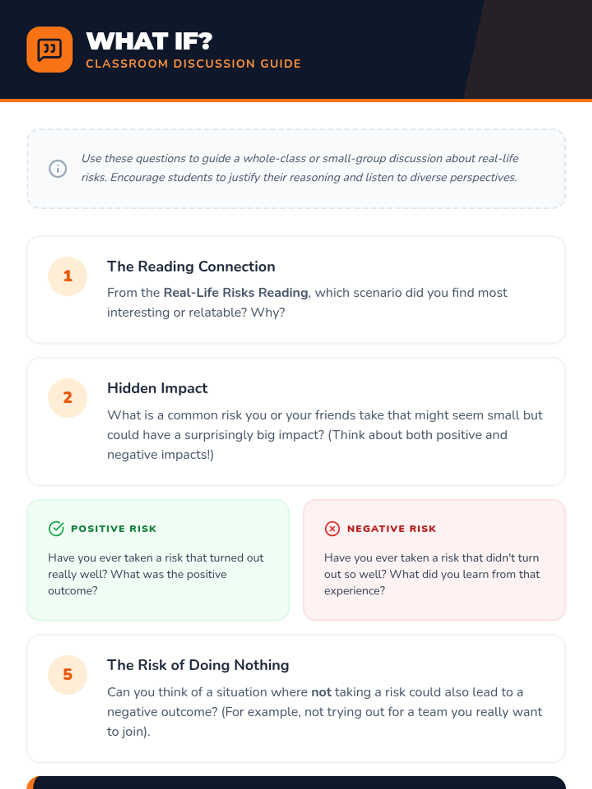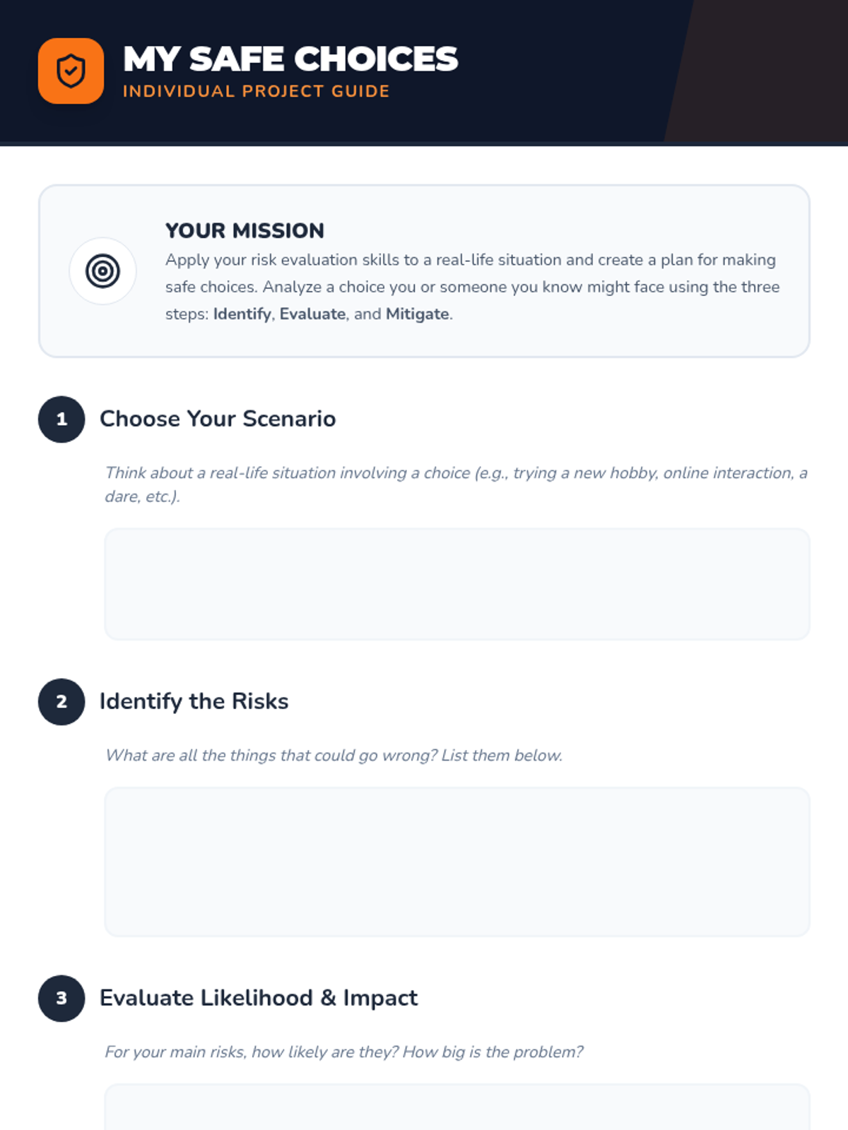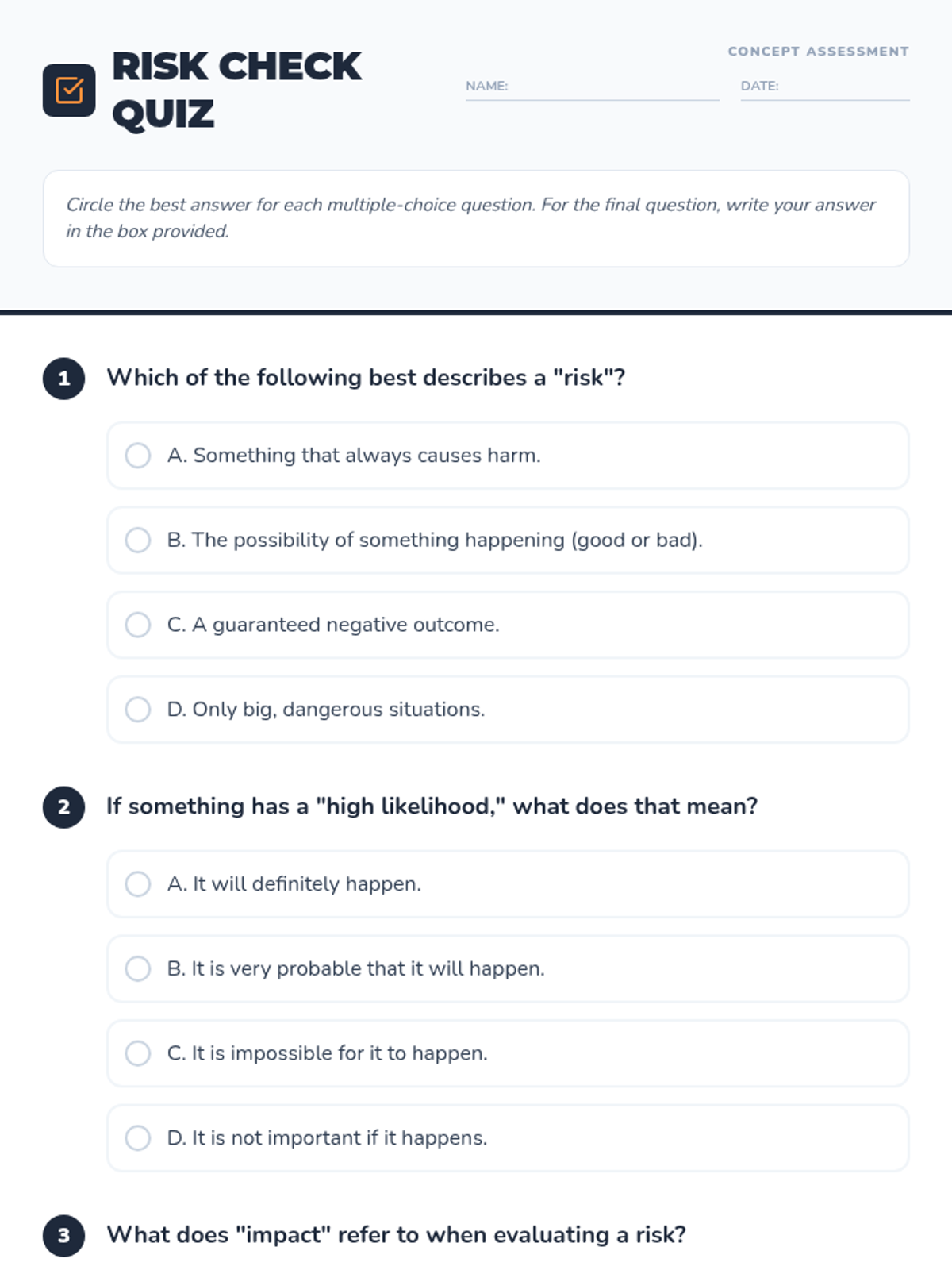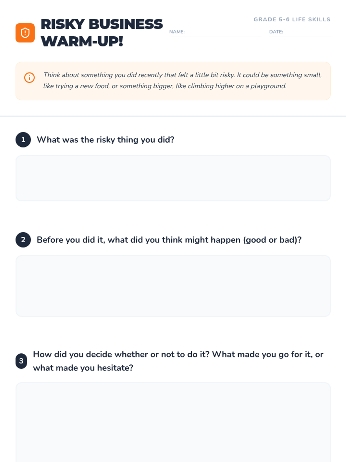 This one-hour lesson helps 5th and 6th-grade students understand how to identify, evaluate, and mitigate risks in their daily lives through interactive discussion, a scenario-based group activity, and a fun classroom game.