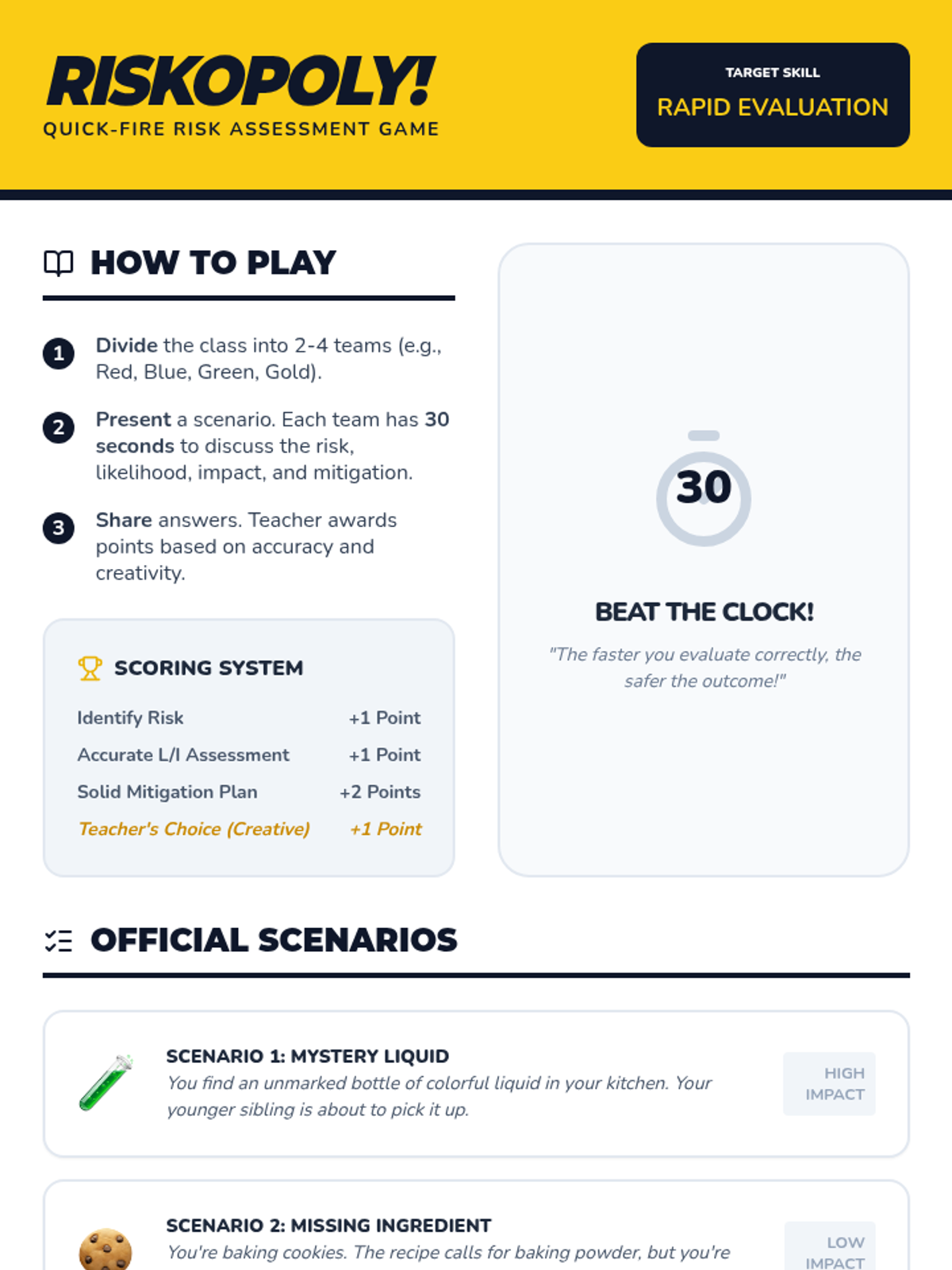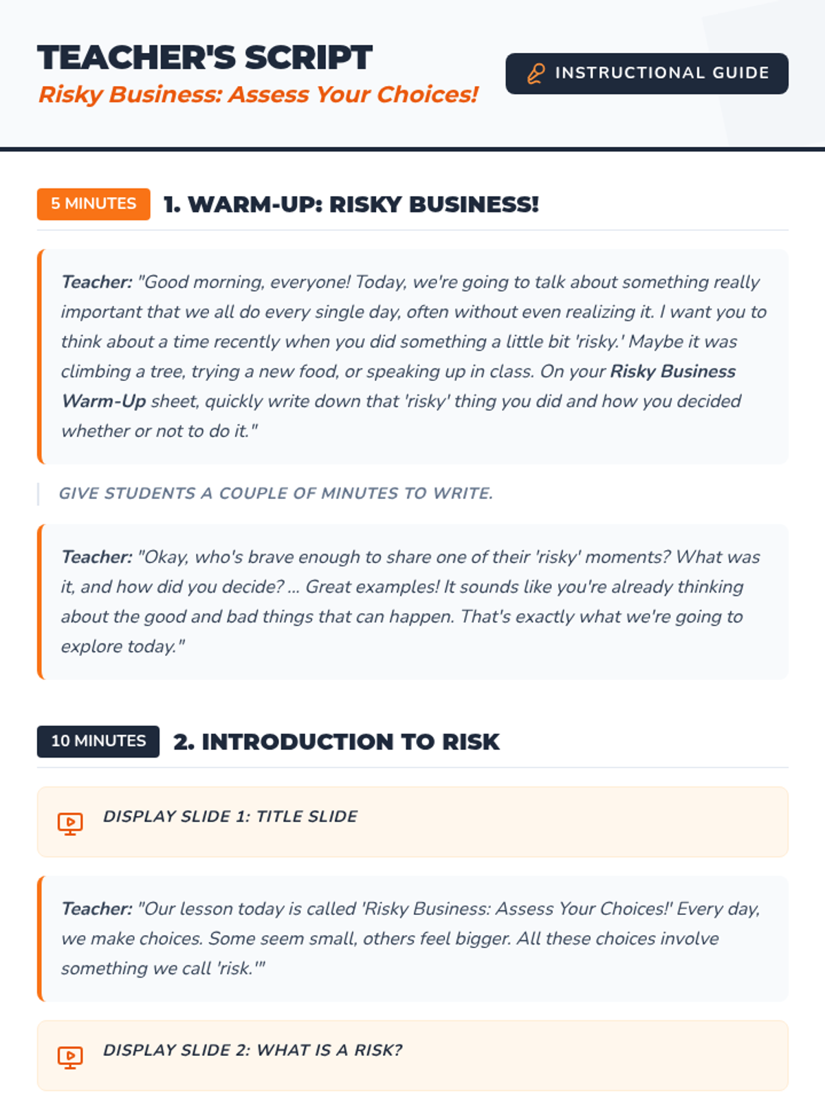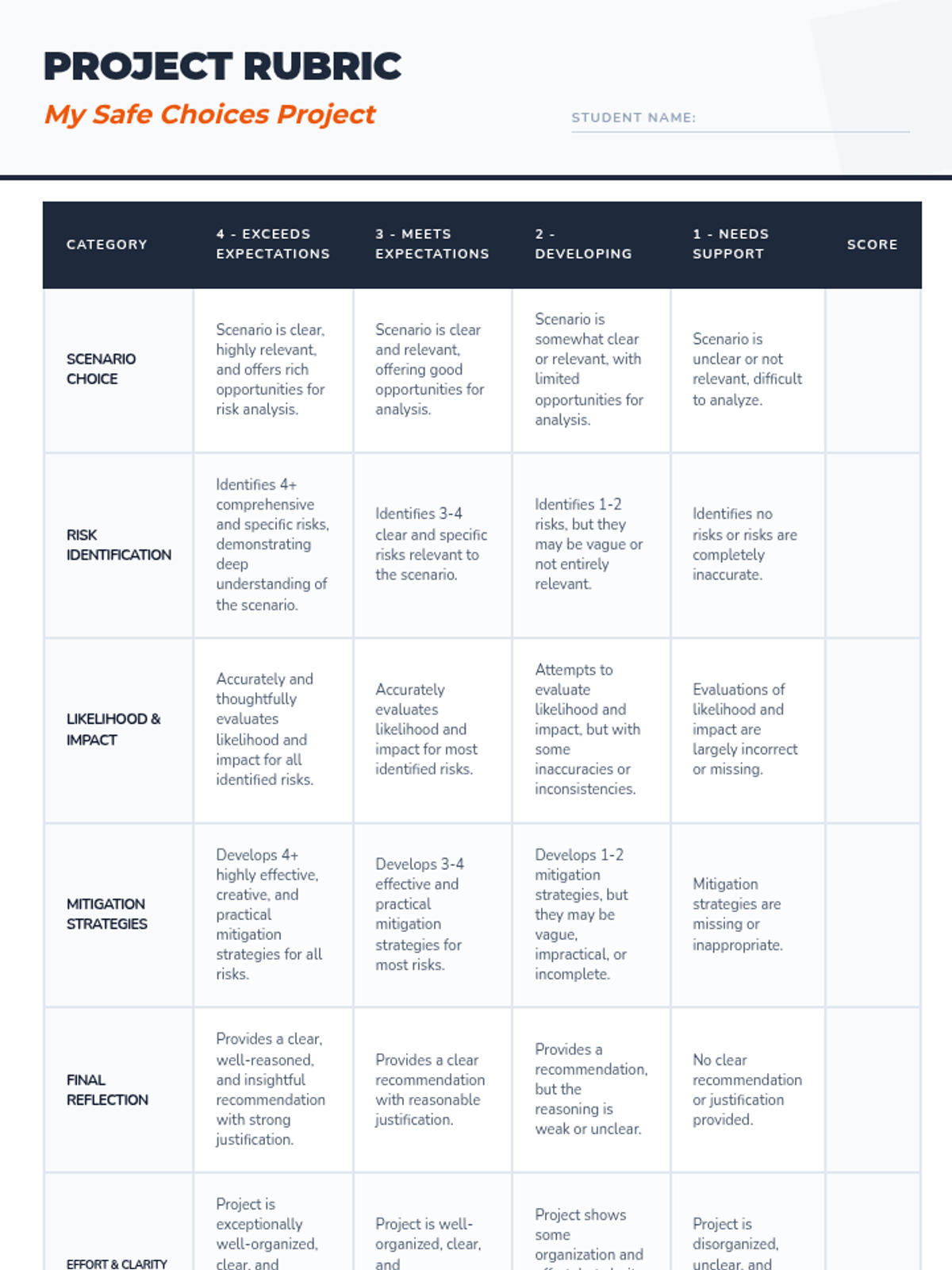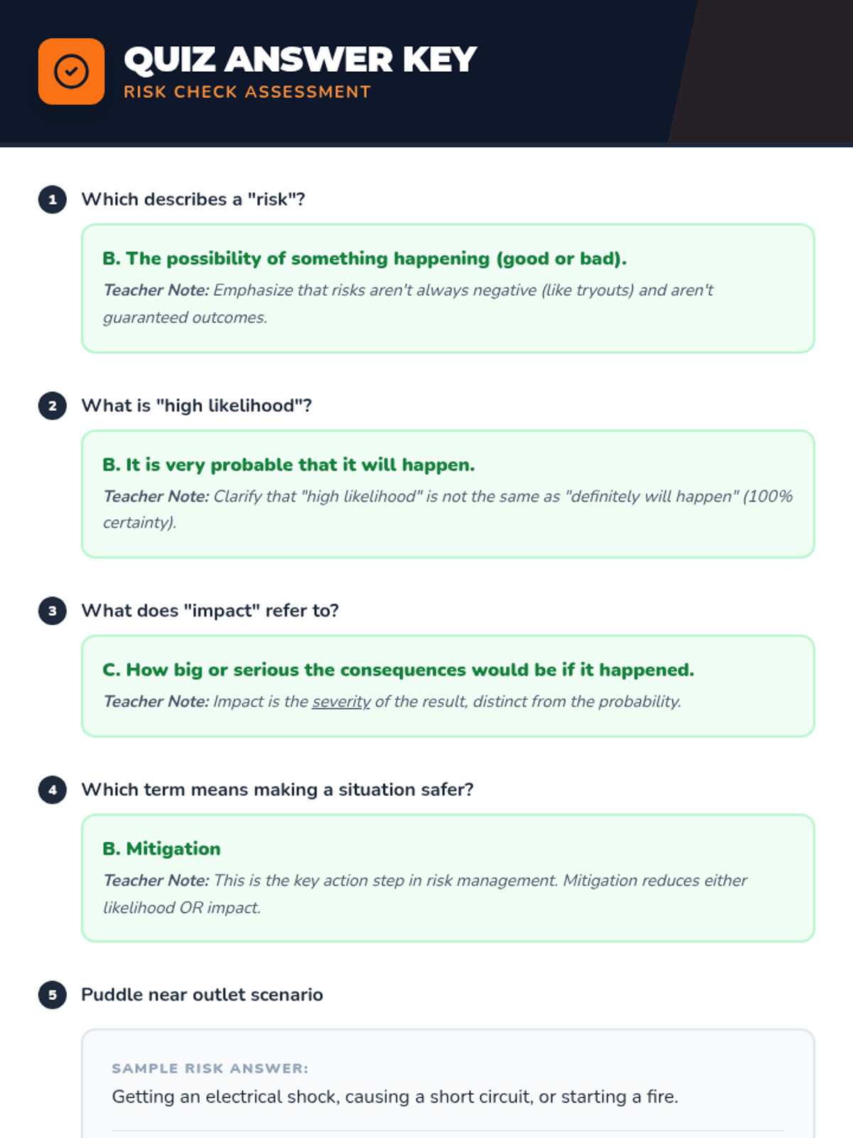 This one-hour lesson helps 5th and 6th-grade students understand how to identify, evaluate, and mitigate risks in their daily lives through interactive discussion, a scenario-based group activity, and a fun classroom game.