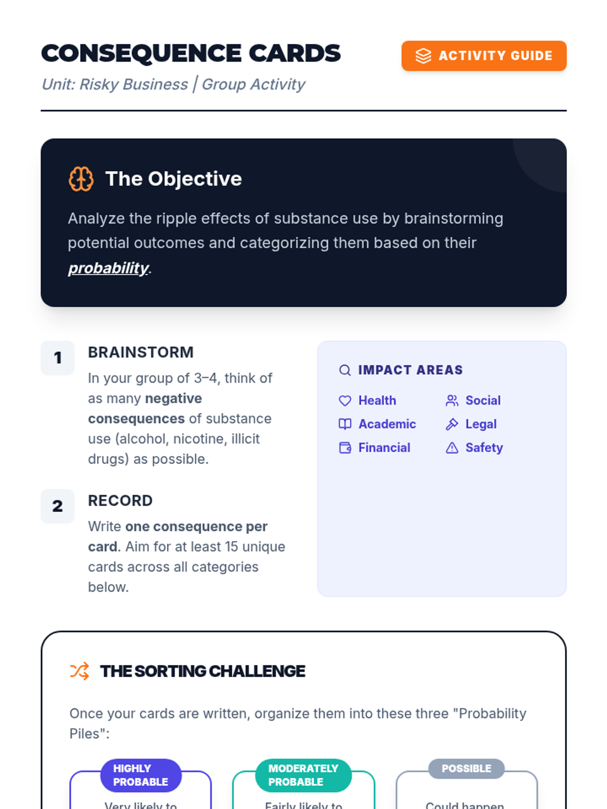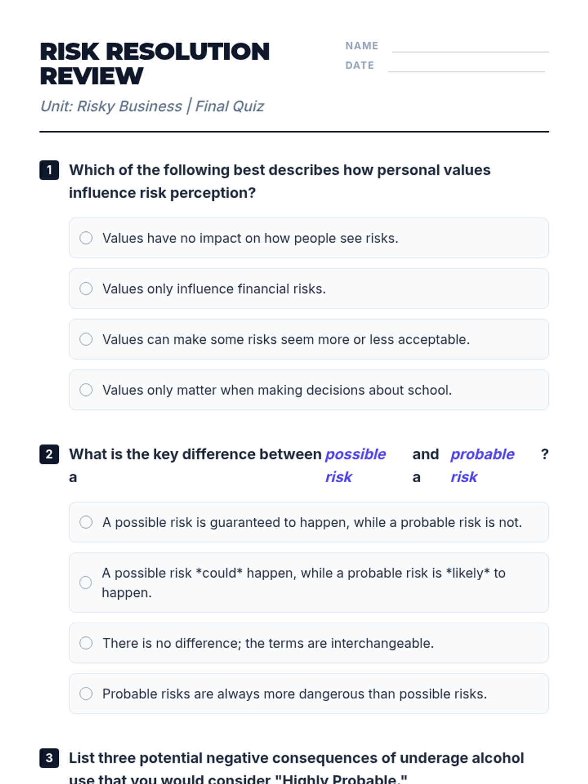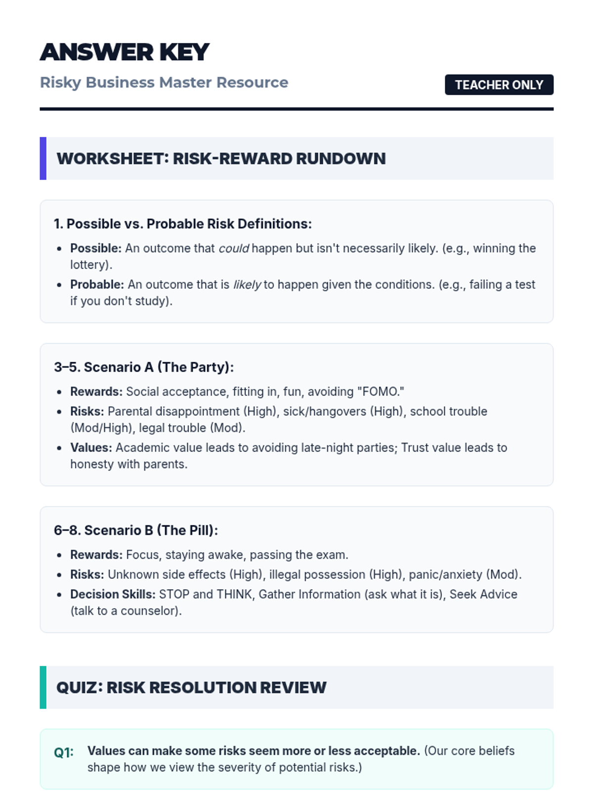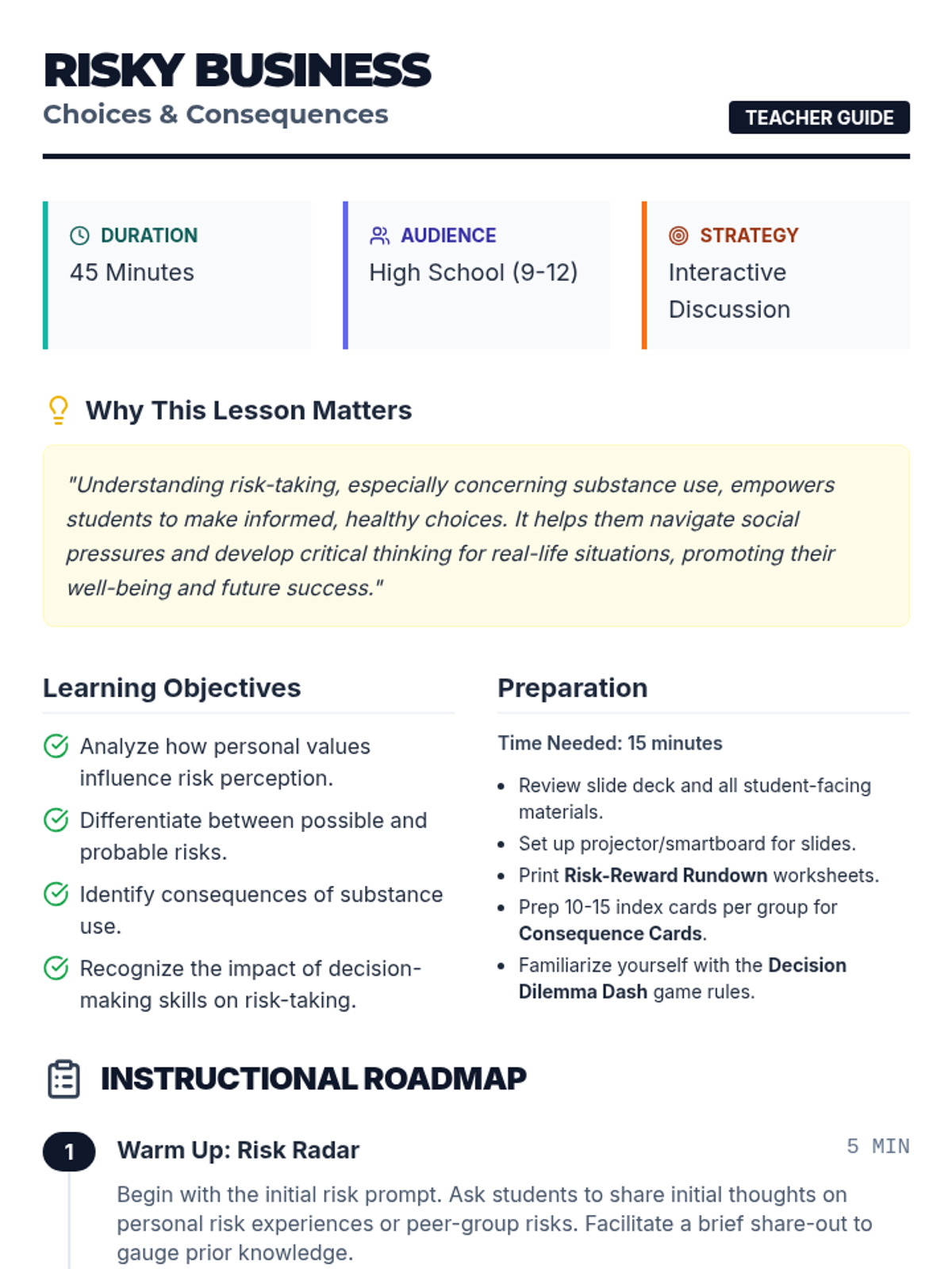 A high-school lesson exploring the relationship between perception, values, and risk-taking, specifically focusing on substance use. Students distinguish between possible and probable risks while developing decision-making skills.