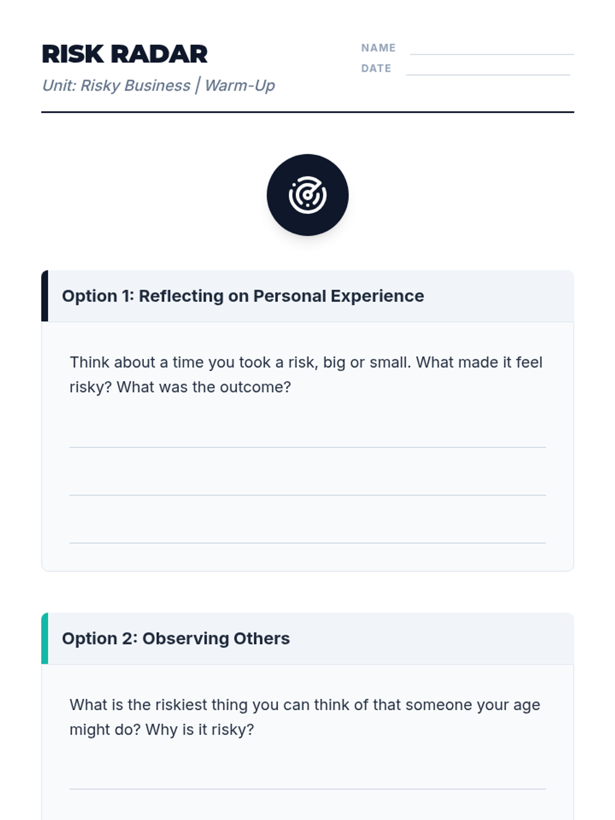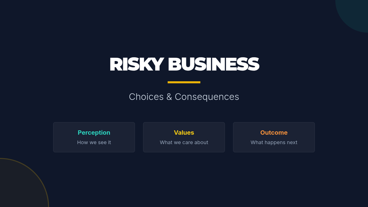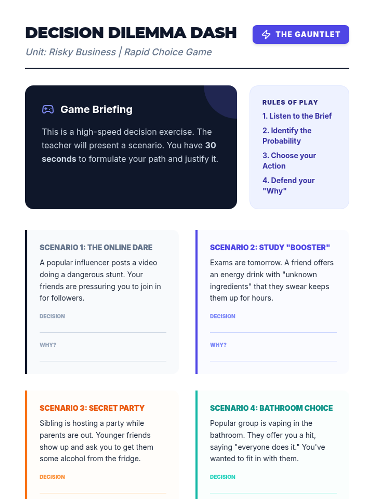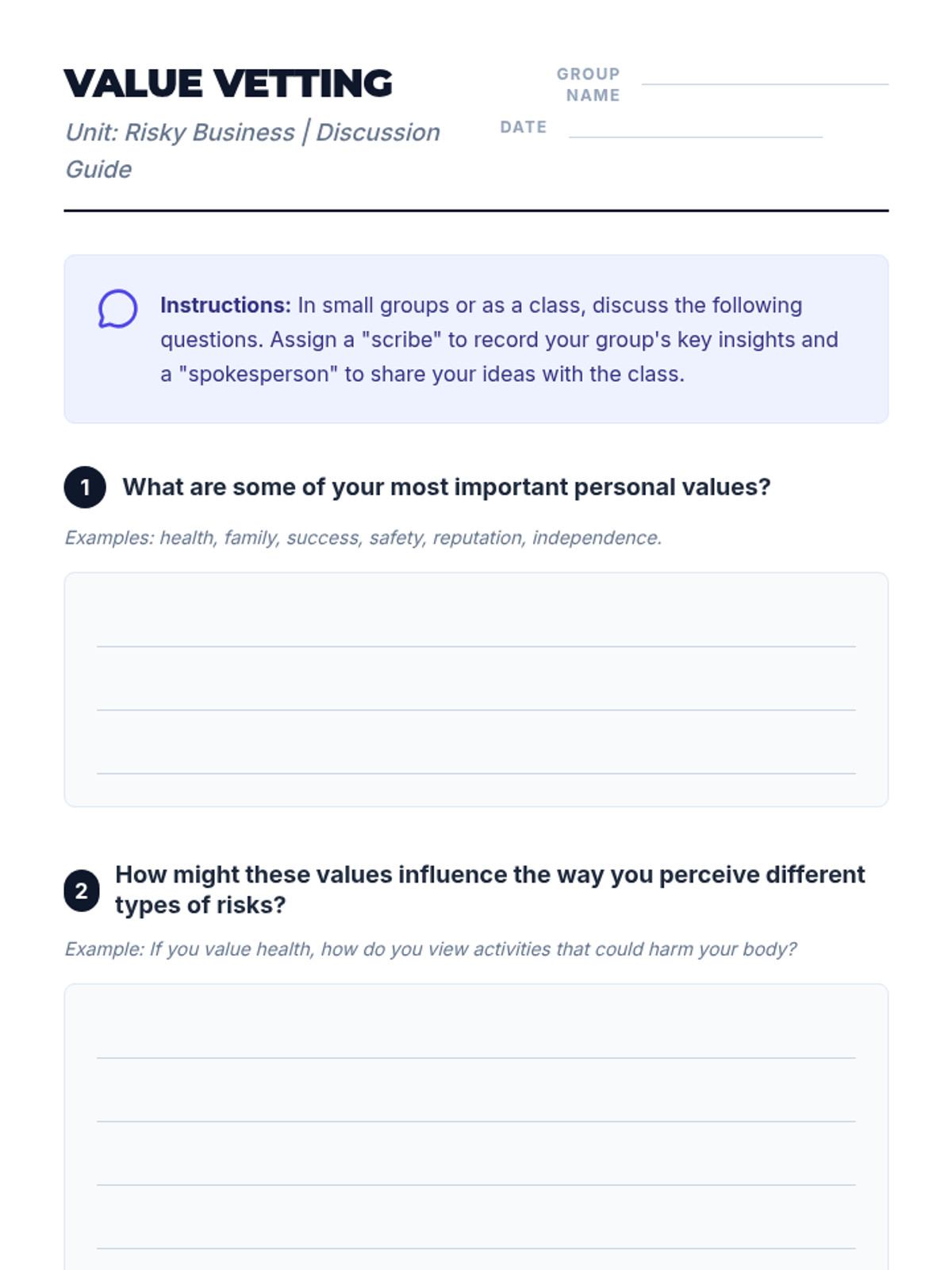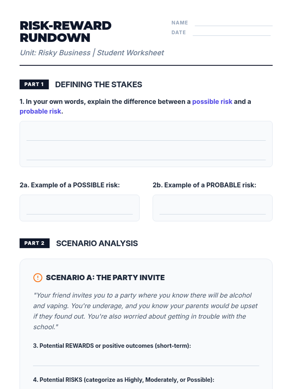 A high-school lesson exploring the relationship between perception, values, and risk-taking, specifically focusing on substance use. Students distinguish between possible and probable risks while developing decision-making skills.