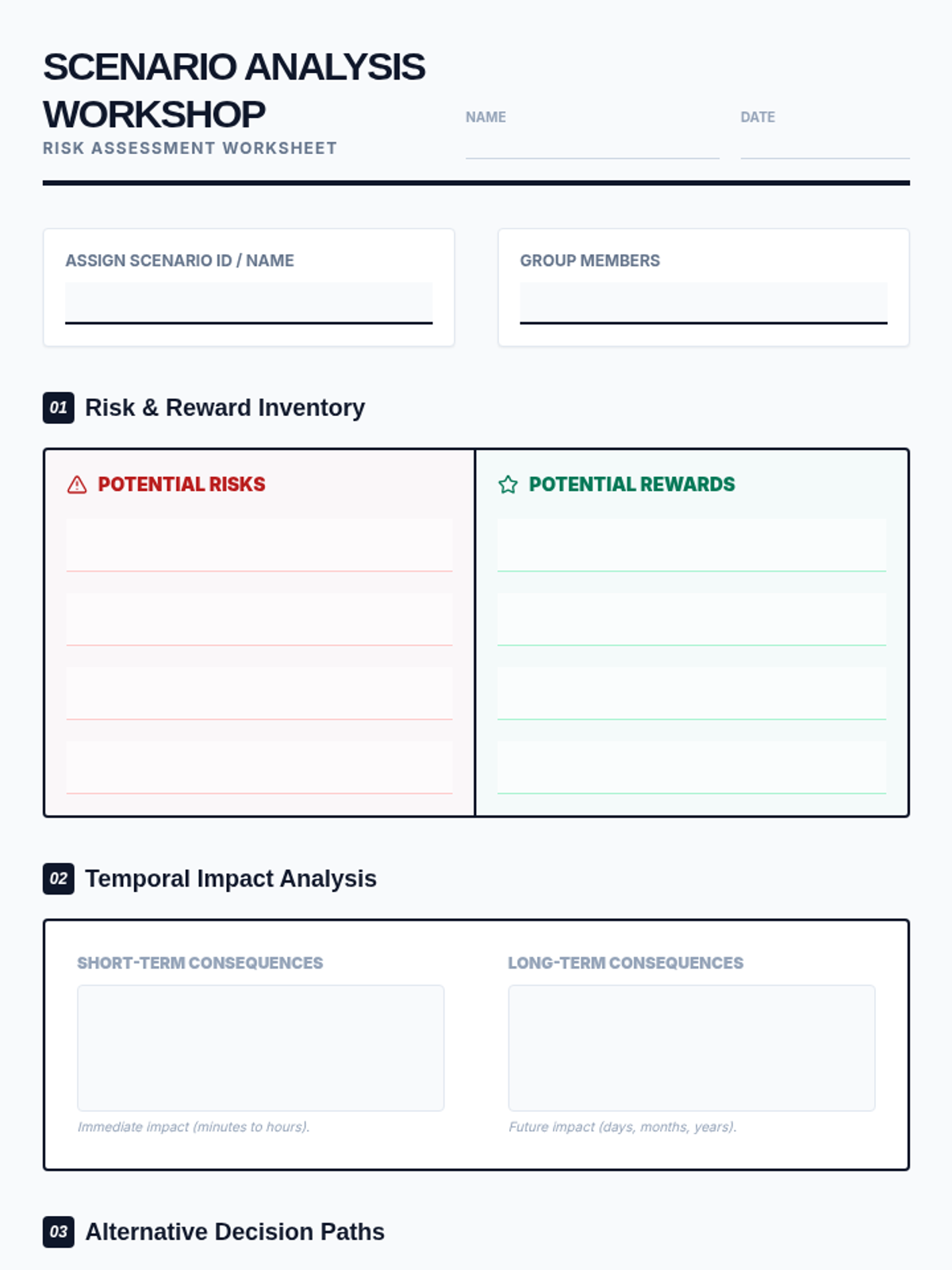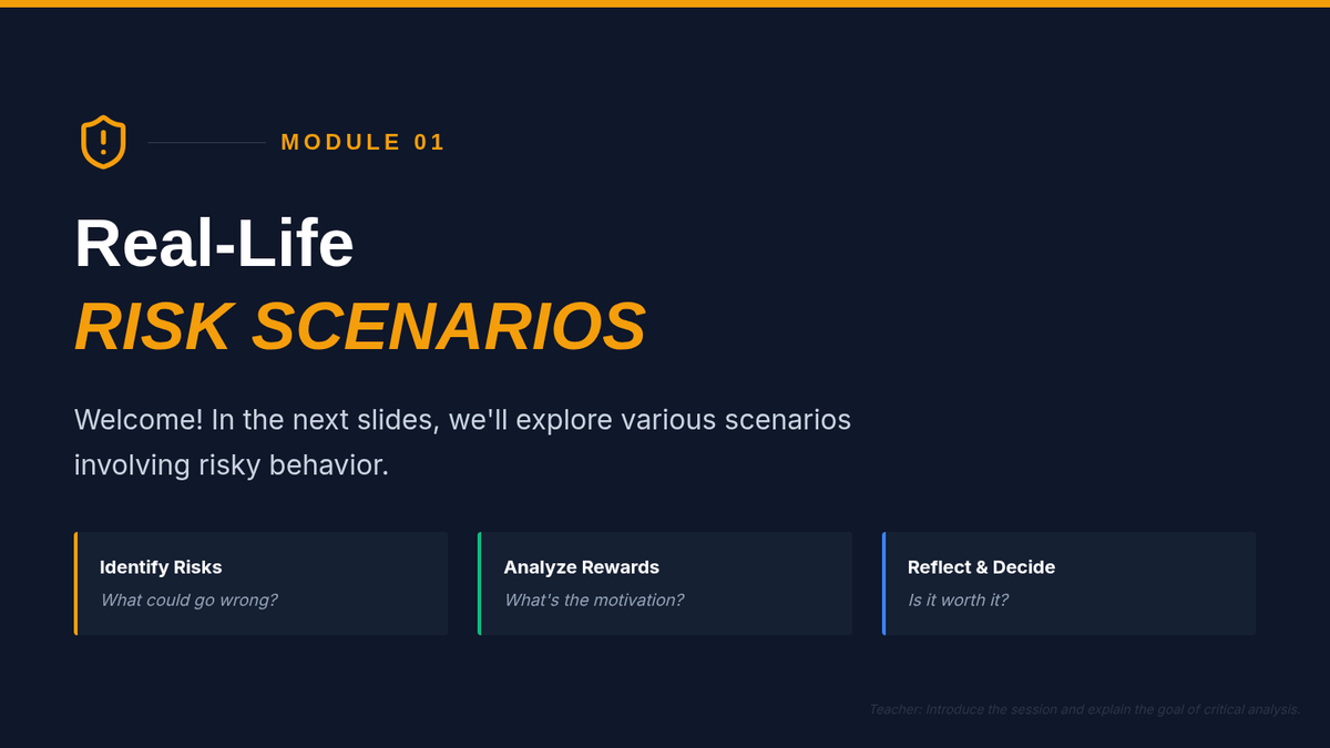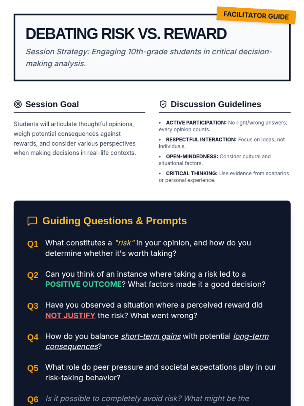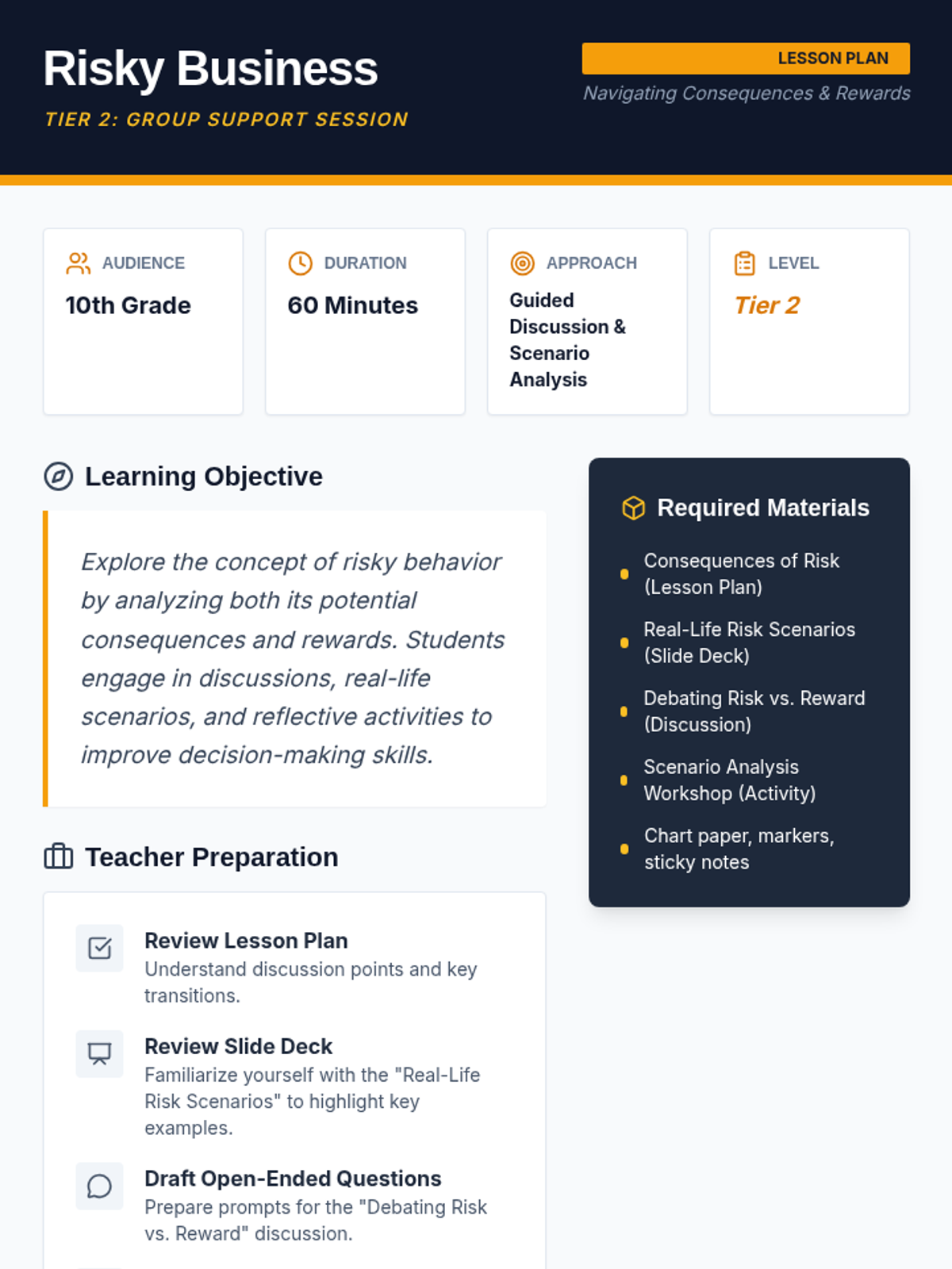 Students will explore the dynamics of risky behavior by analyzing real-life scenarios, weighing potential rewards against consequences, and developing critical decision-making skills in a small-group setting.