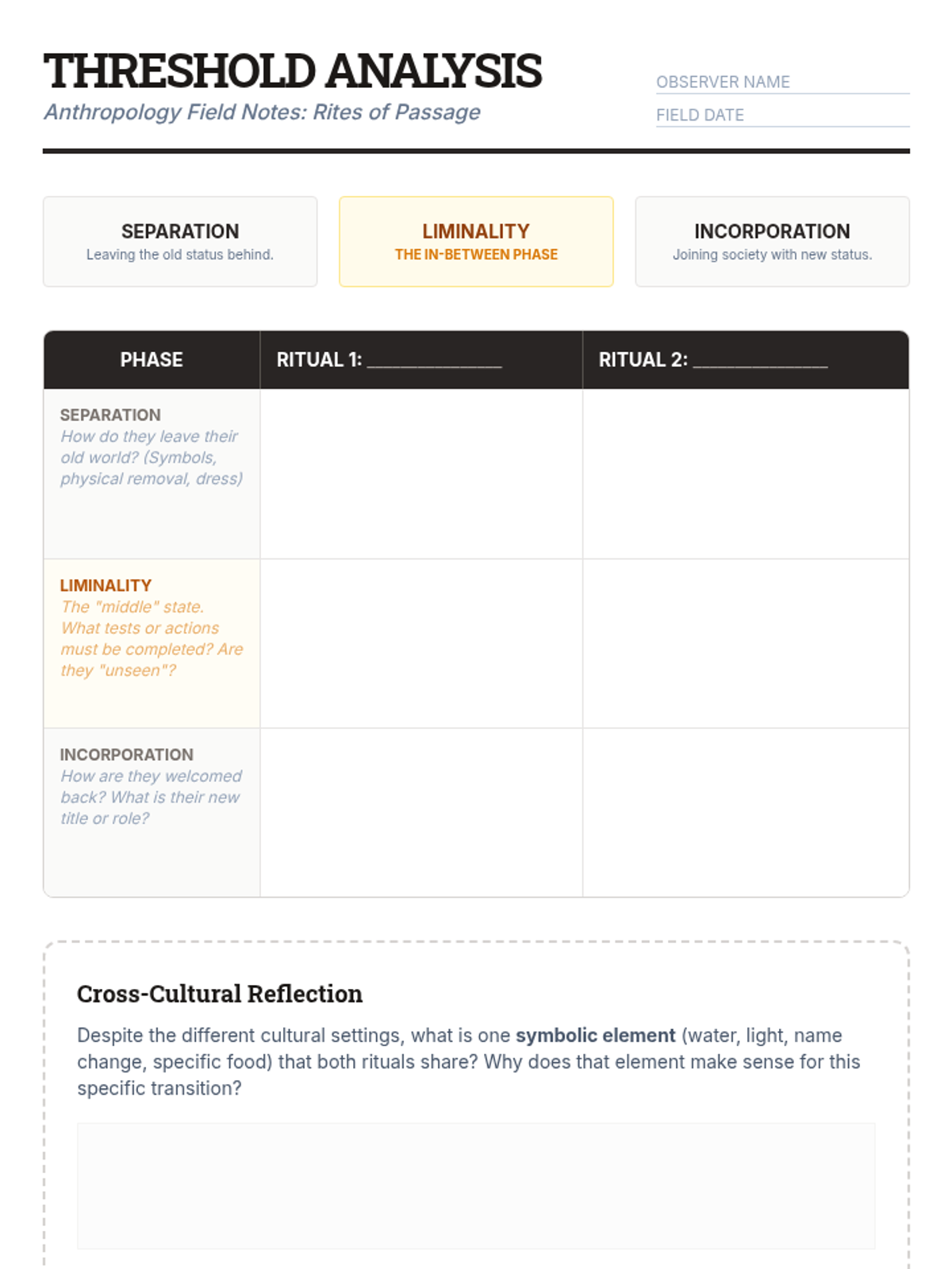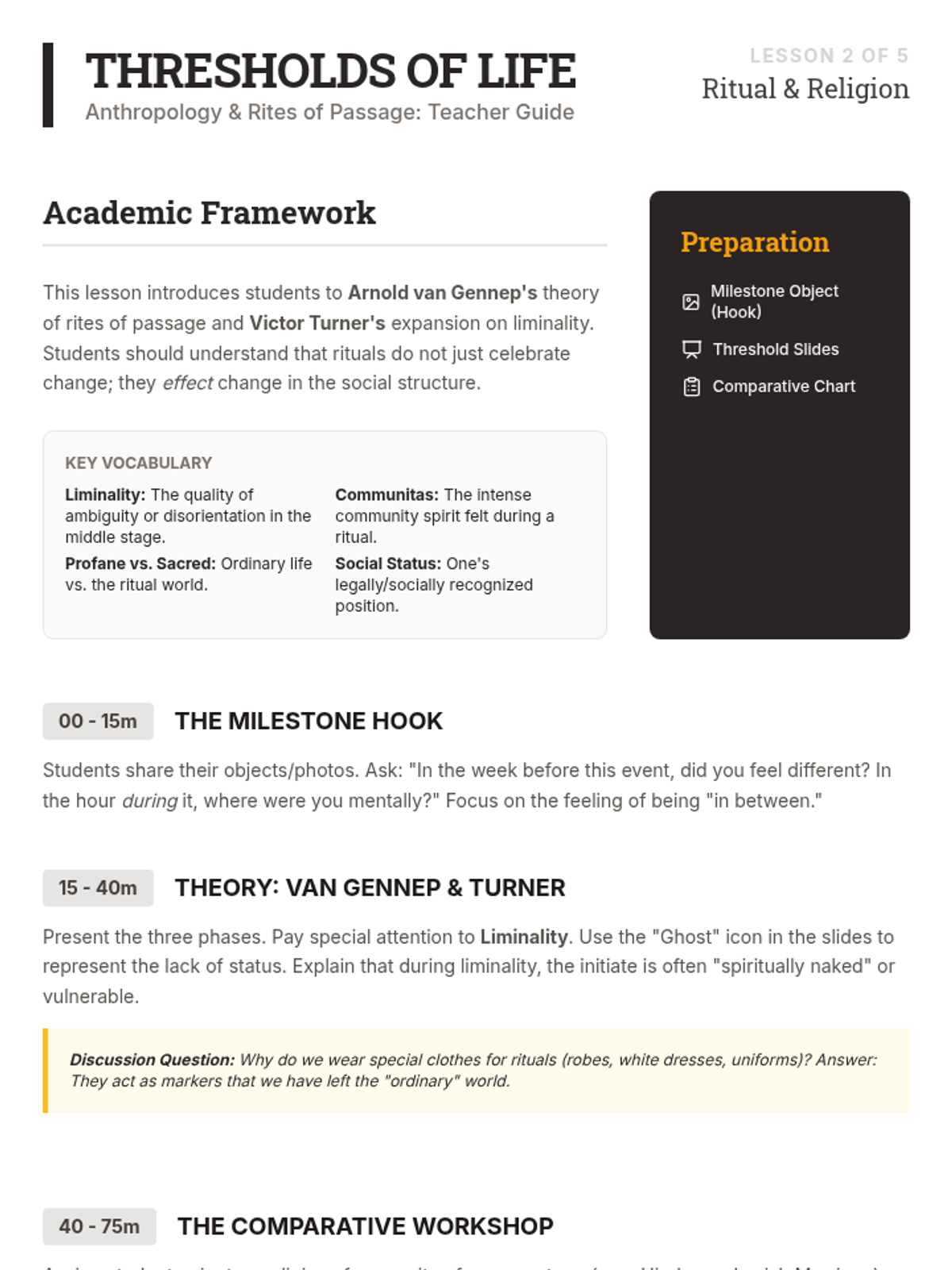 This lesson compares birth, coming-of-age, marriage, and death rituals across five major religions using anthropological frameworks of liminality.