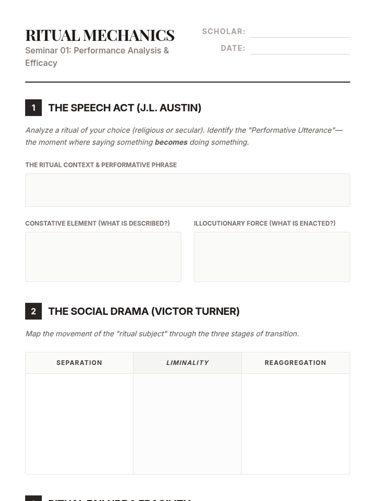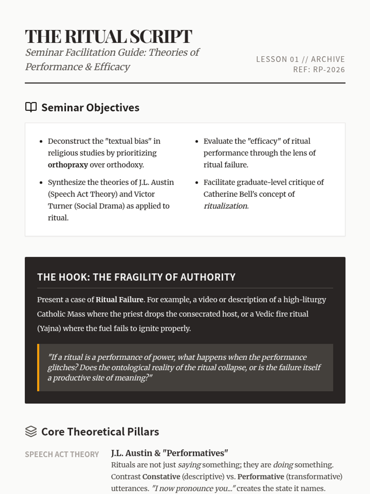 Examines the mechanics of ritual through performance theory, contrasting communication with action and analyzing ritual efficacy and failure.