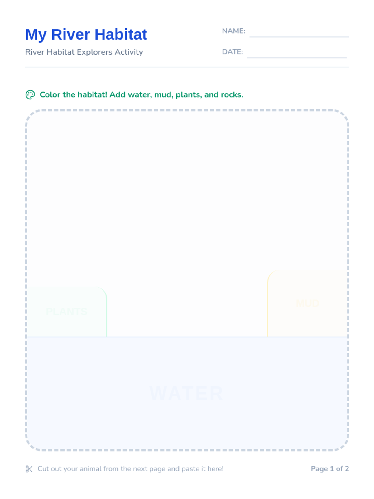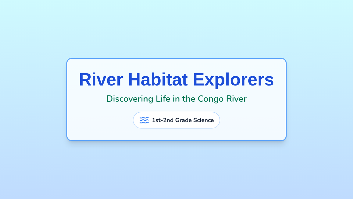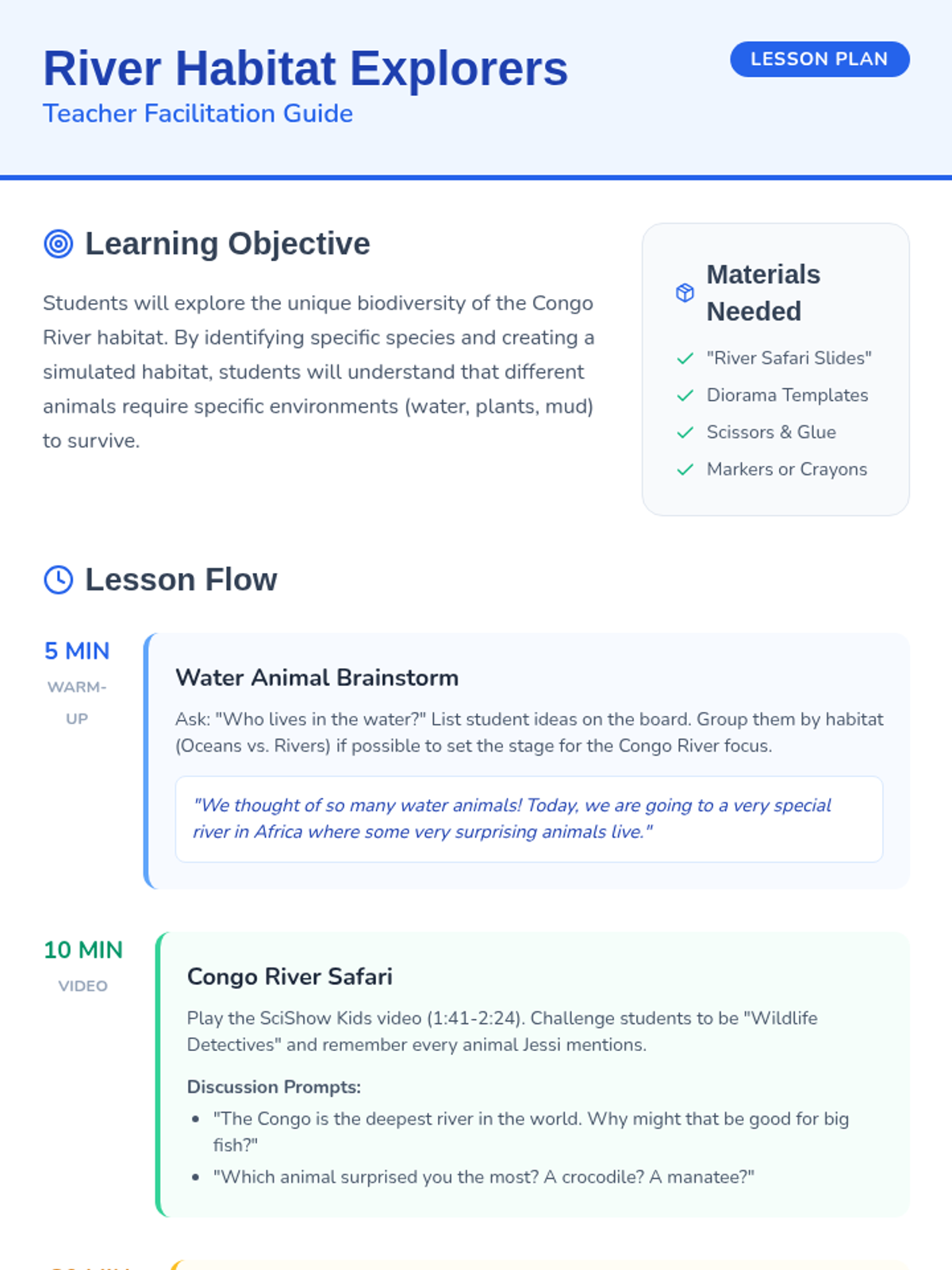 A 1st-2nd grade science lesson exploring river biodiversity through the lens of the Congo River, featuring a video-based animal identification activity and a creative river habitat diorama project.
